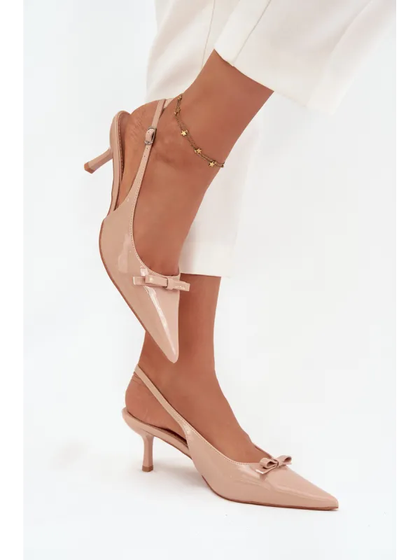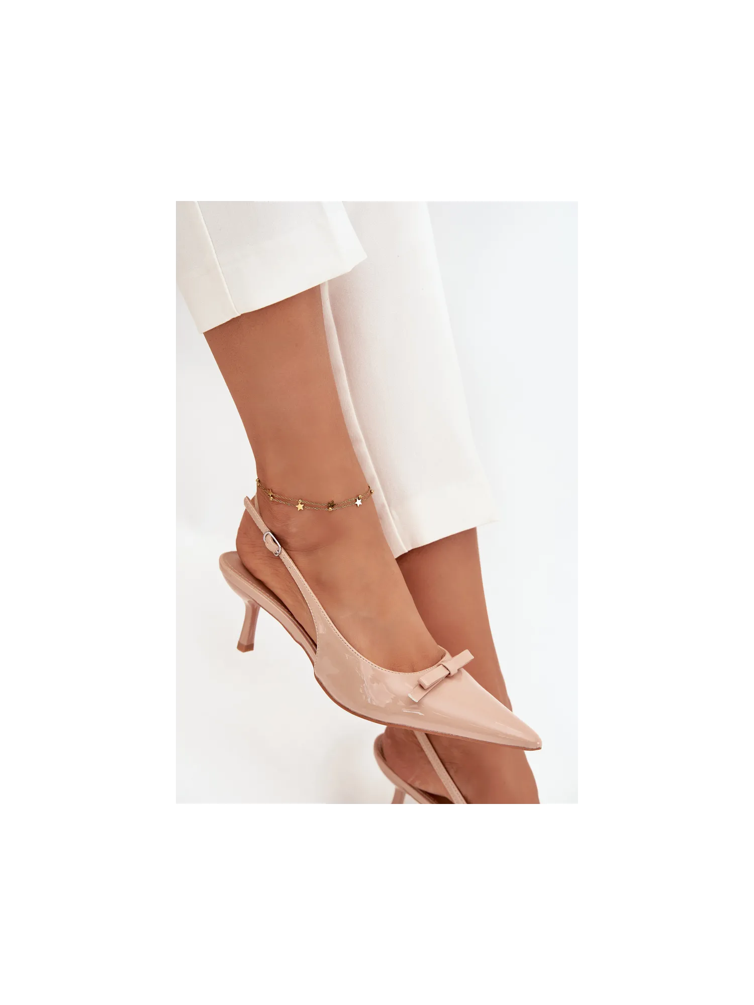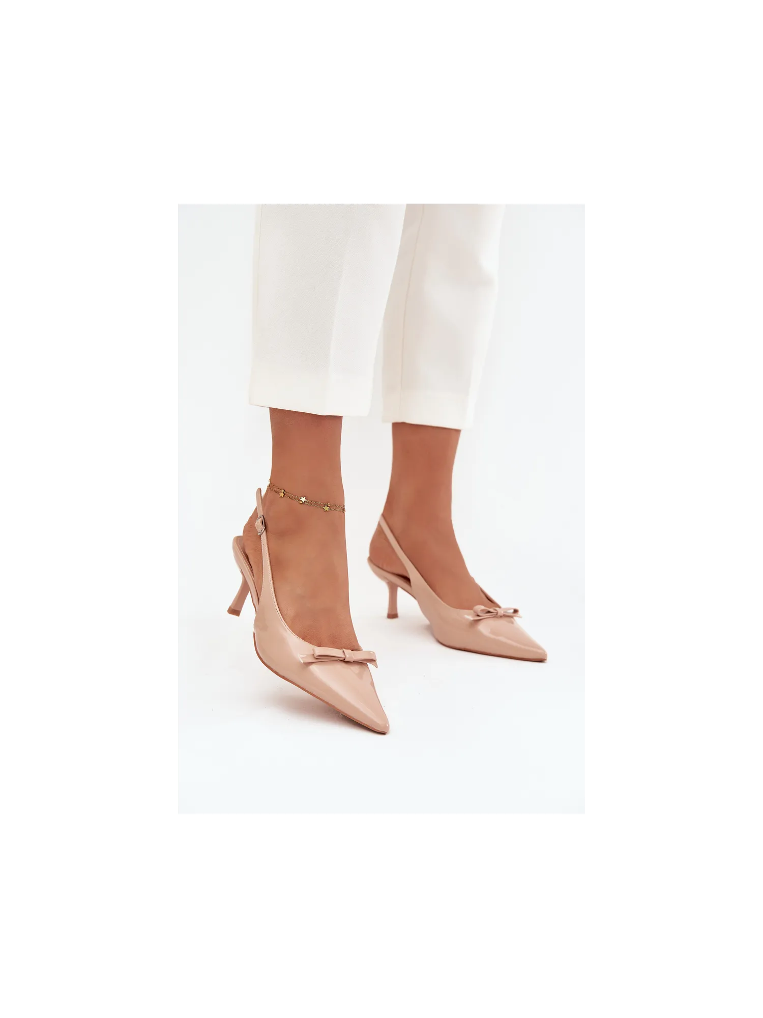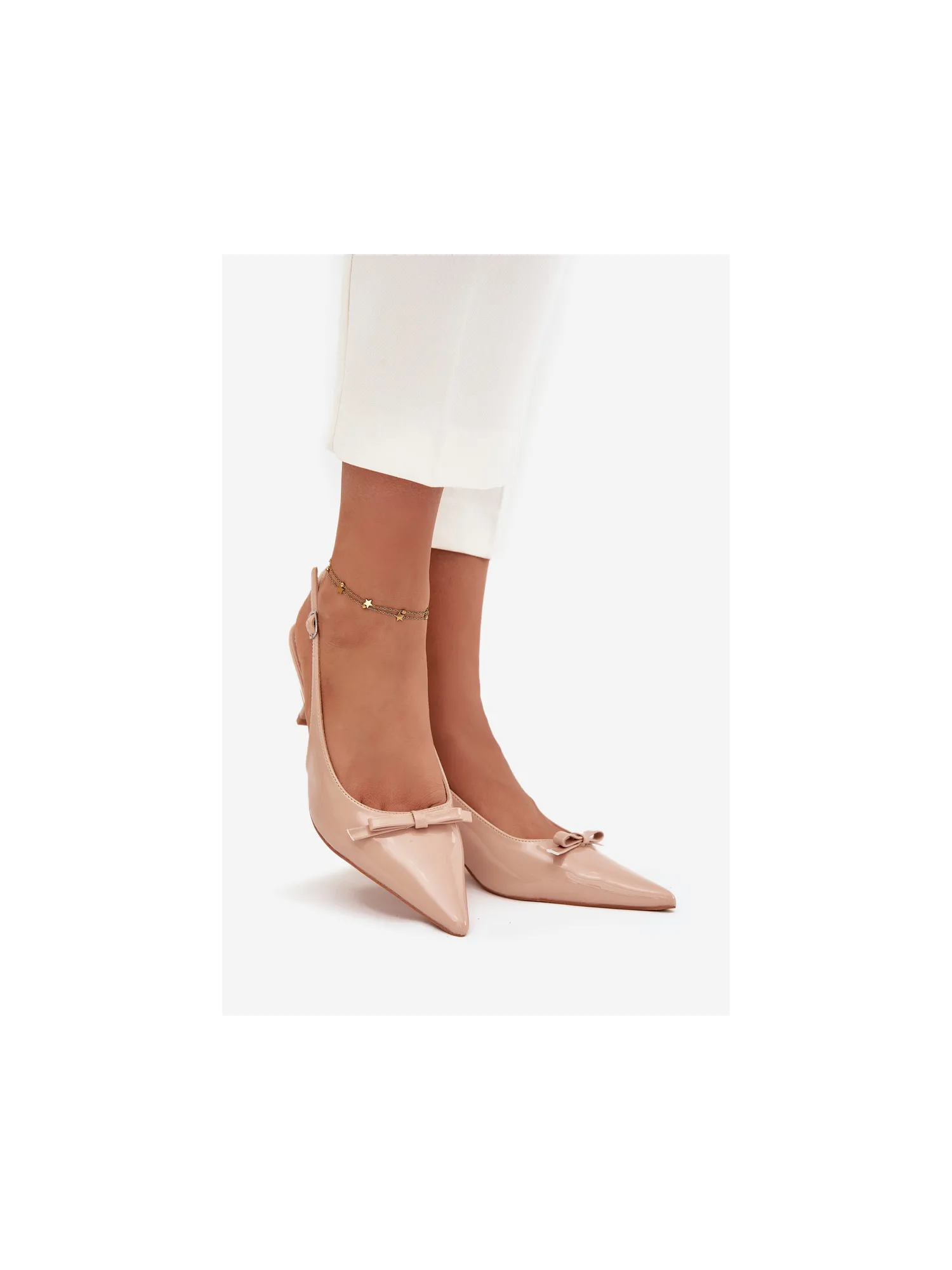 Elegant women's pumps made from eco-leather are a classic in a feminine style. A slender heel and pointed toes beautifully elongate the legs, and the bow at the front adds a subtle charm to the shoes. The model is fastened with a buckle and an adjustable strap, ensuring a good fit and comfort. Perfect for both elegant outfits and special occasions. When choosing your size, please refer to the size chart. When choosing a size, please refer to the size chart.