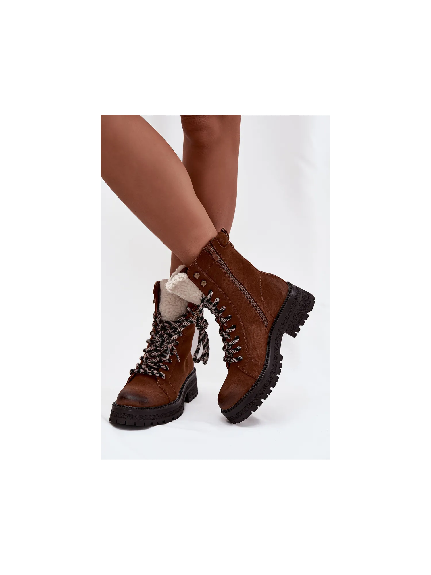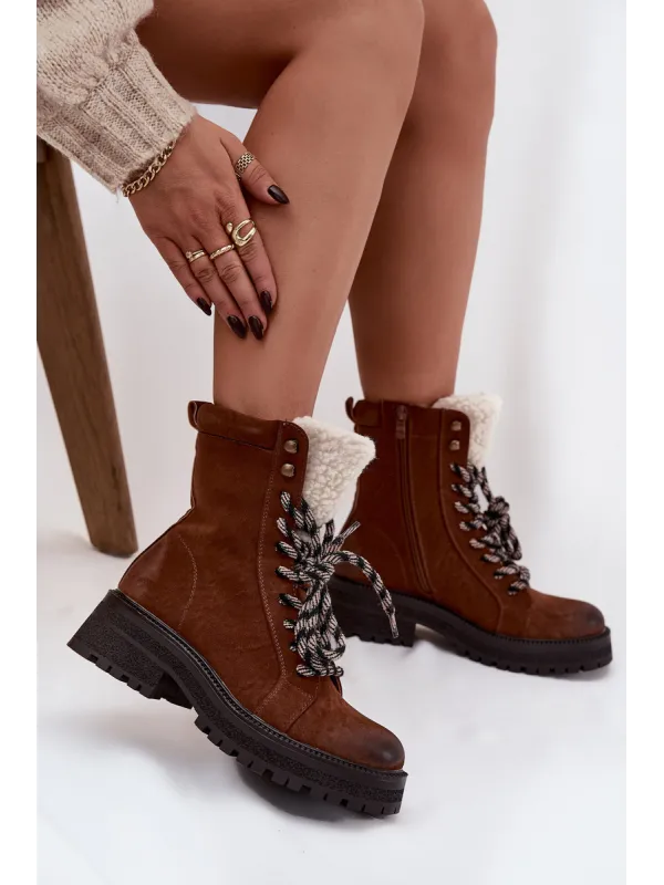 Low-heeled boots made of eco-suede are a practical choice for cold days. The model is distinguished by a decorative shearling at the top of the shaft, which adds charm and provides extra protection against the cold. The lacing allows for a perfect fit to the foot, and the interior insulated with footwear fleece guarantees thermal comfort. Stylish and comfortable, perfect for winter walks and everyday activities. When choosing a size, please refer to the size chart.