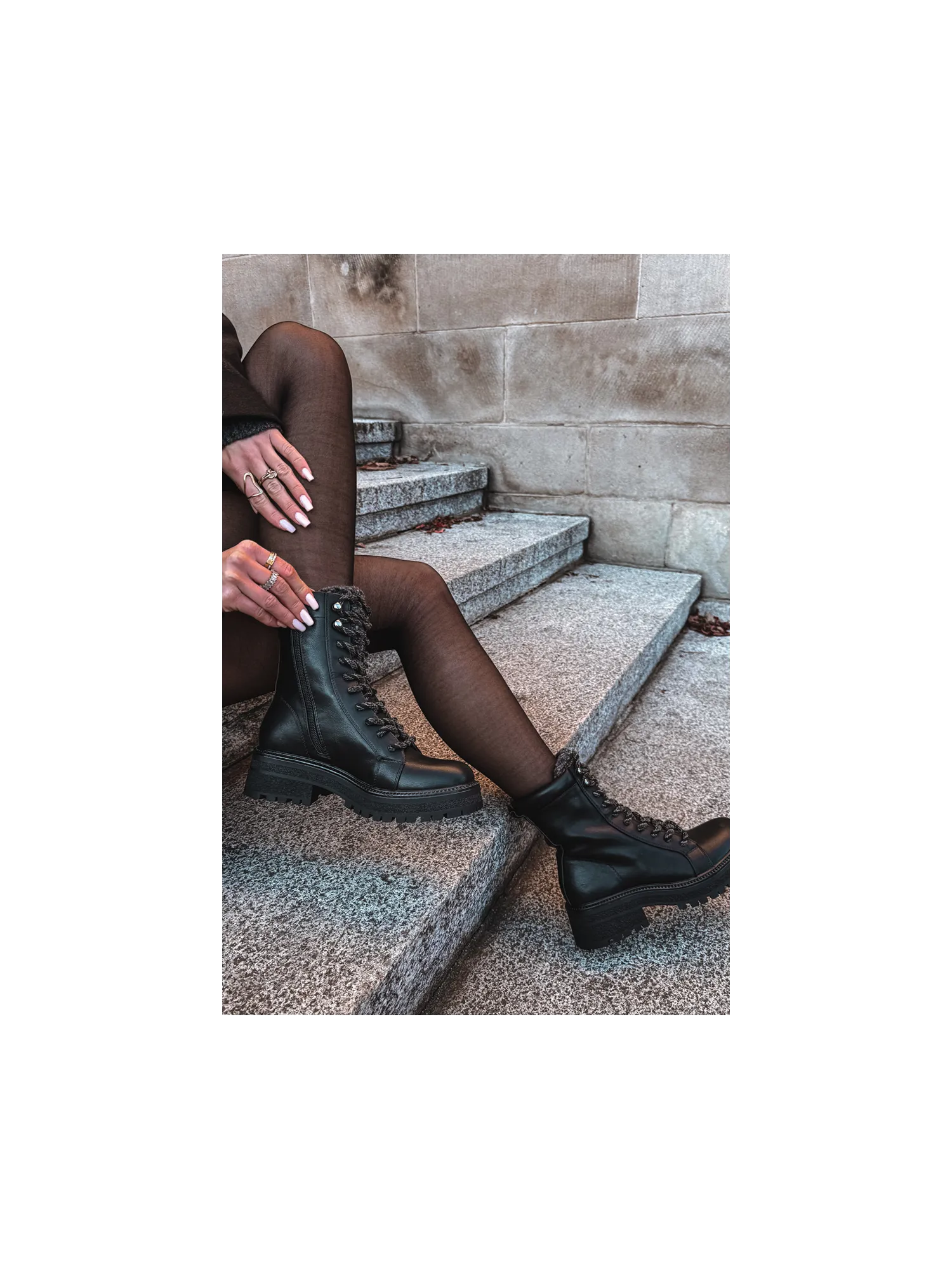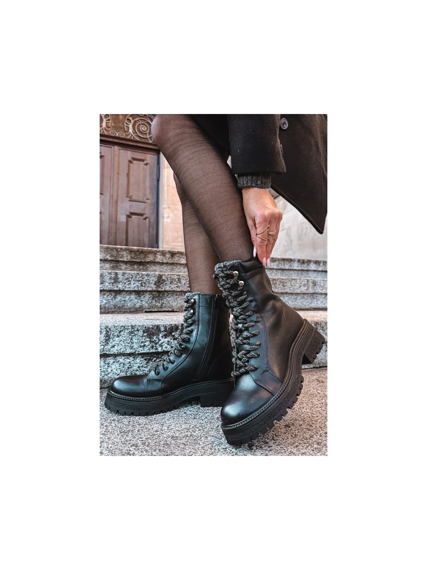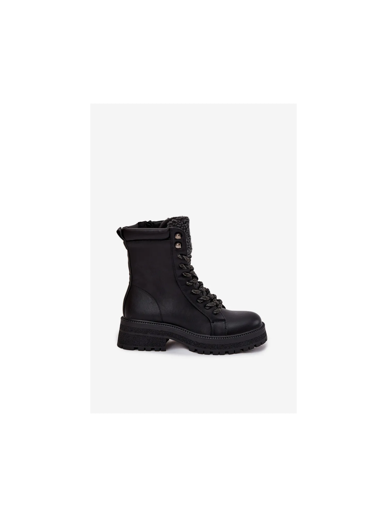 Low-heeled boots made of eco-suede are a practical choice for cold days. The model is distinguished by a decorative shearling at the top of the shaft, which adds charm and provides extra protection against the cold. The lacing allows for a perfect fit to the foot, and the interior insulated with footwear fleece guarantees thermal comfort. Stylish and comfortable, perfect for winter walks and everyday activities. When choosing a size, please refer to the size chart.