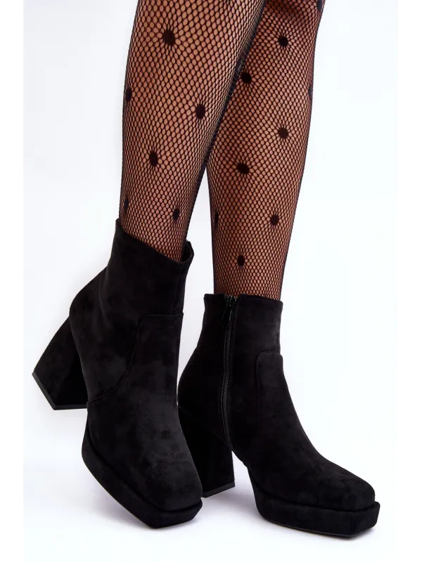 Moteriški batai ant masyvaus, aukšto bloko ir platformos. Pagaminta iš ekologiškos zomšos. Užsegamas užtrauktuku vidinėje viršutinės dalies pusėje. Vidus apšiltintas batsiuvio antklode. Kvadratiniai kojų pirštai. Kojos pirštas sustingęs. Renkantis dydį, vadovaukitės dydžių lentele.