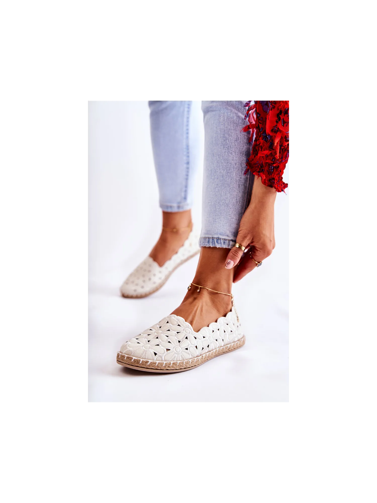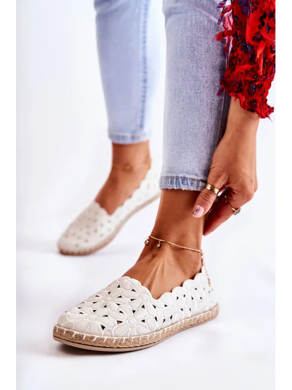 Moteriškos baltos gėlėtos užsegamos balerinos su užsegamomis basutėmis Vennice