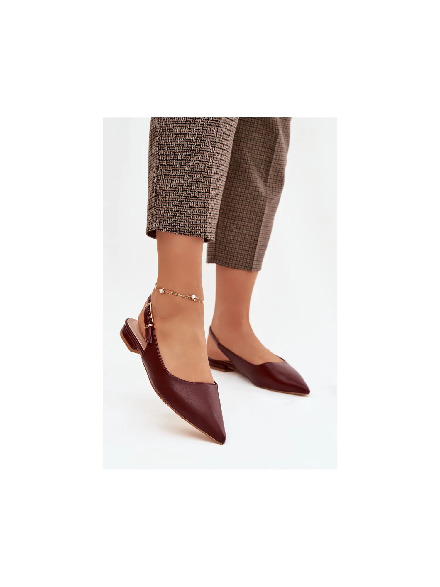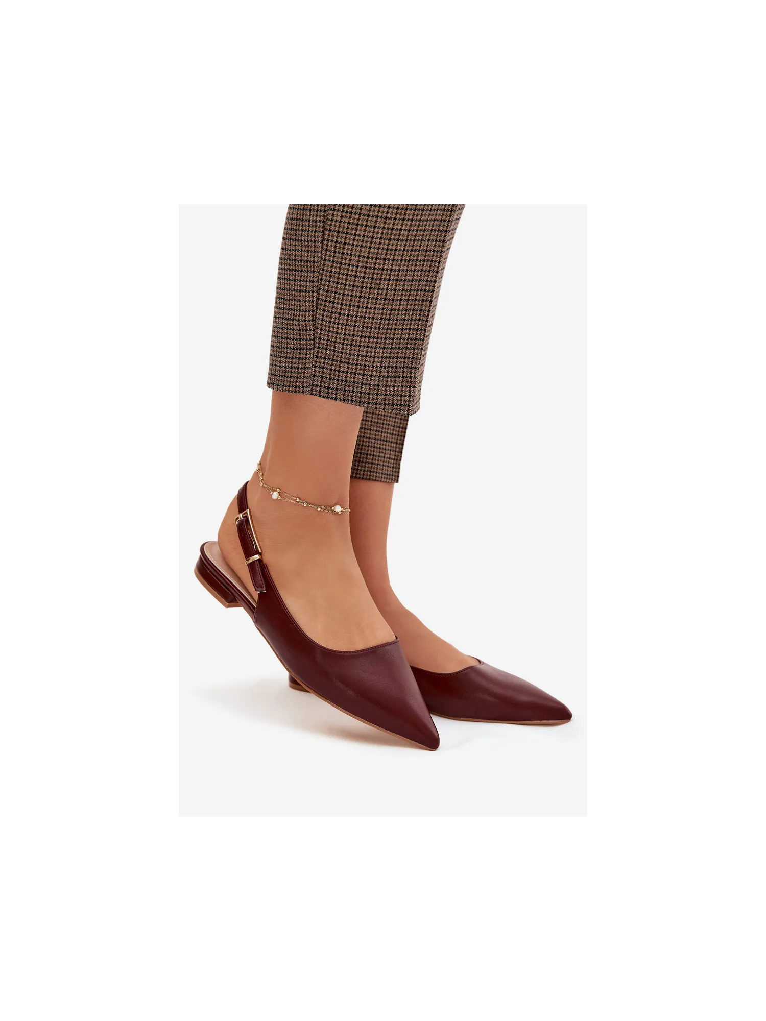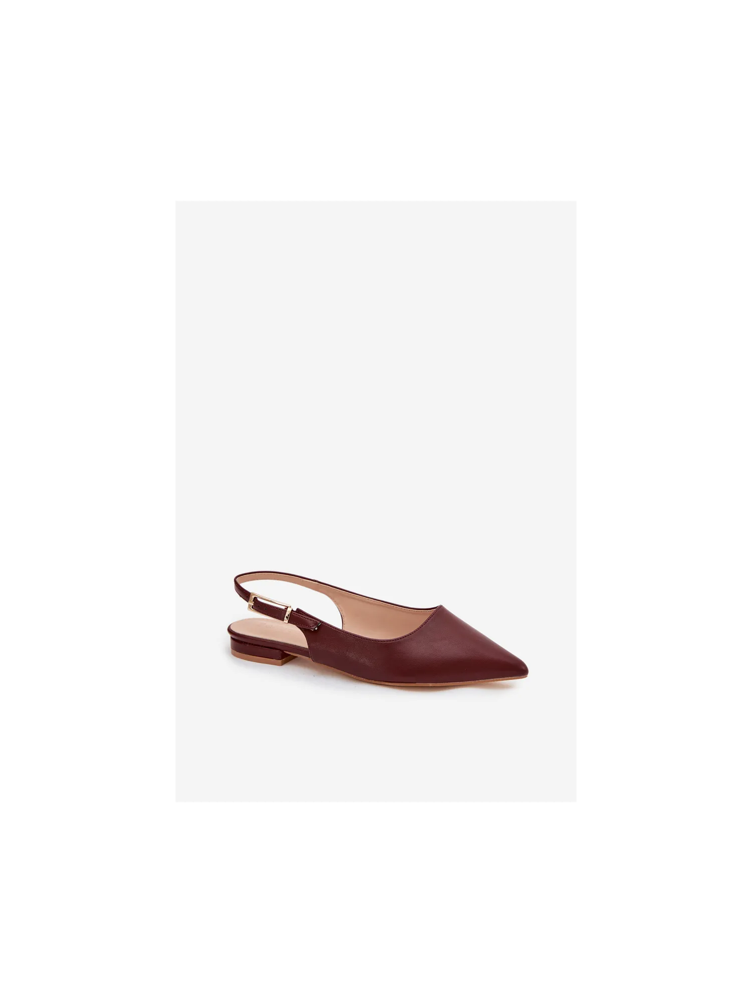 Elegant women's ballerinas made of eco leather are a stylish choice for any occasion. Pointed toes beautifully accentuate the line of the foot. An adjustable strap with a gold buckle allows for a perfect fit and adds an eye-catching detail. The flat heel provides all-day comfort, making these ballerinas suitable for everyday wear, work, or meetings. When choosing a size, please refer to the size chart.
