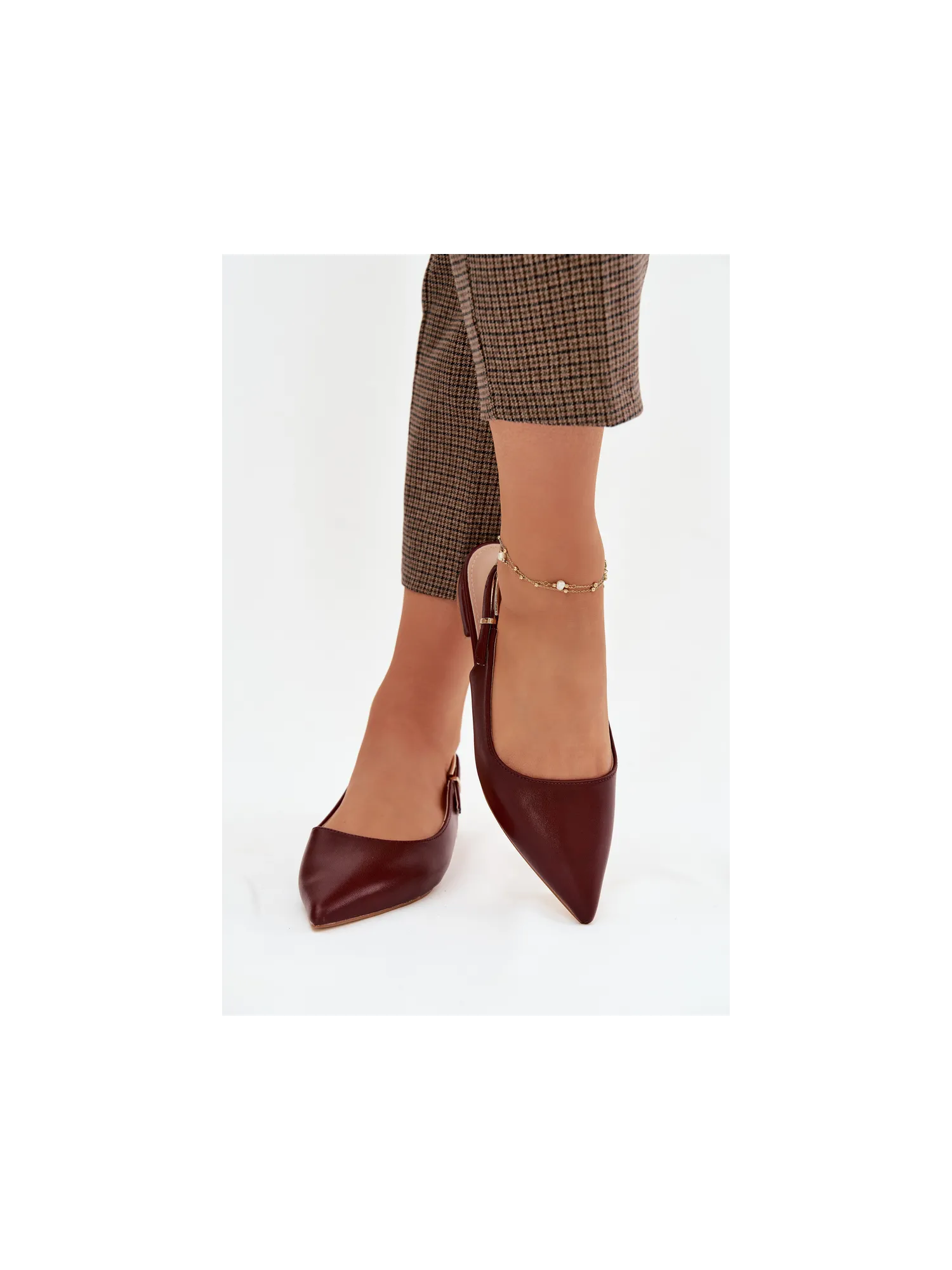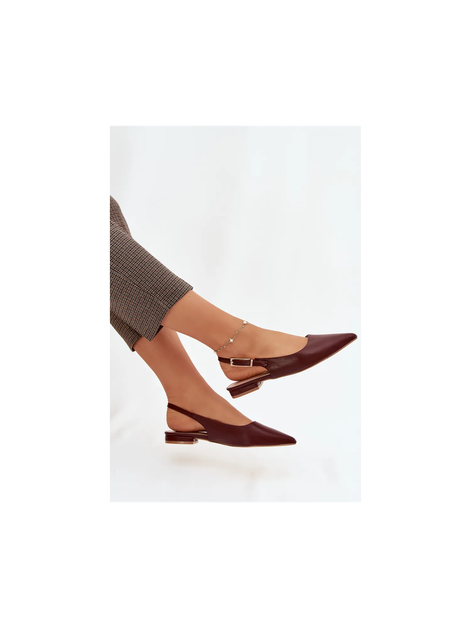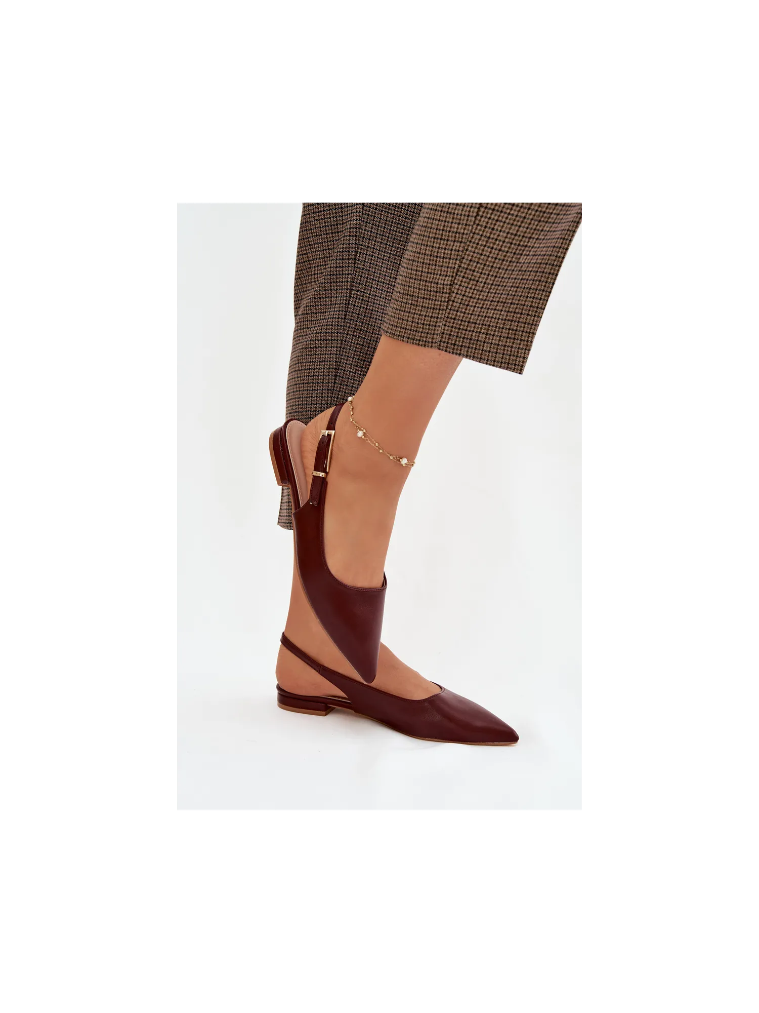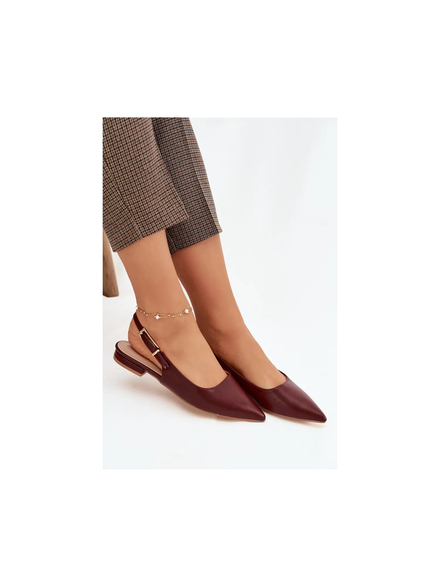 Elegant women's ballerinas made of eco leather are a stylish choice for any occasion. Pointed toes beautifully accentuate the line of the foot. An adjustable strap with a gold buckle allows for a perfect fit and adds an eye-catching detail. The flat heel provides all-day comfort, making these ballerinas suitable for everyday wear, work, or meetings. When choosing a size, please refer to the size chart.