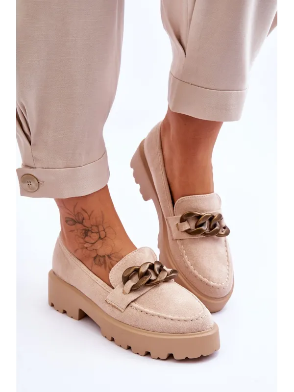 Moteriški batai yra pagaminti iš ekologiškos zomšos. Jų priekyje yra dekoratyvinė grandinėlė. Šis modelis buvo pastatytas ant plokščio kulno ir platformos. Mokasinuose yra eko odos įdėklas. Šių batų kulnas yra šiek tiek standesnis. Puikus modelis pavasario-rudens sezonui!