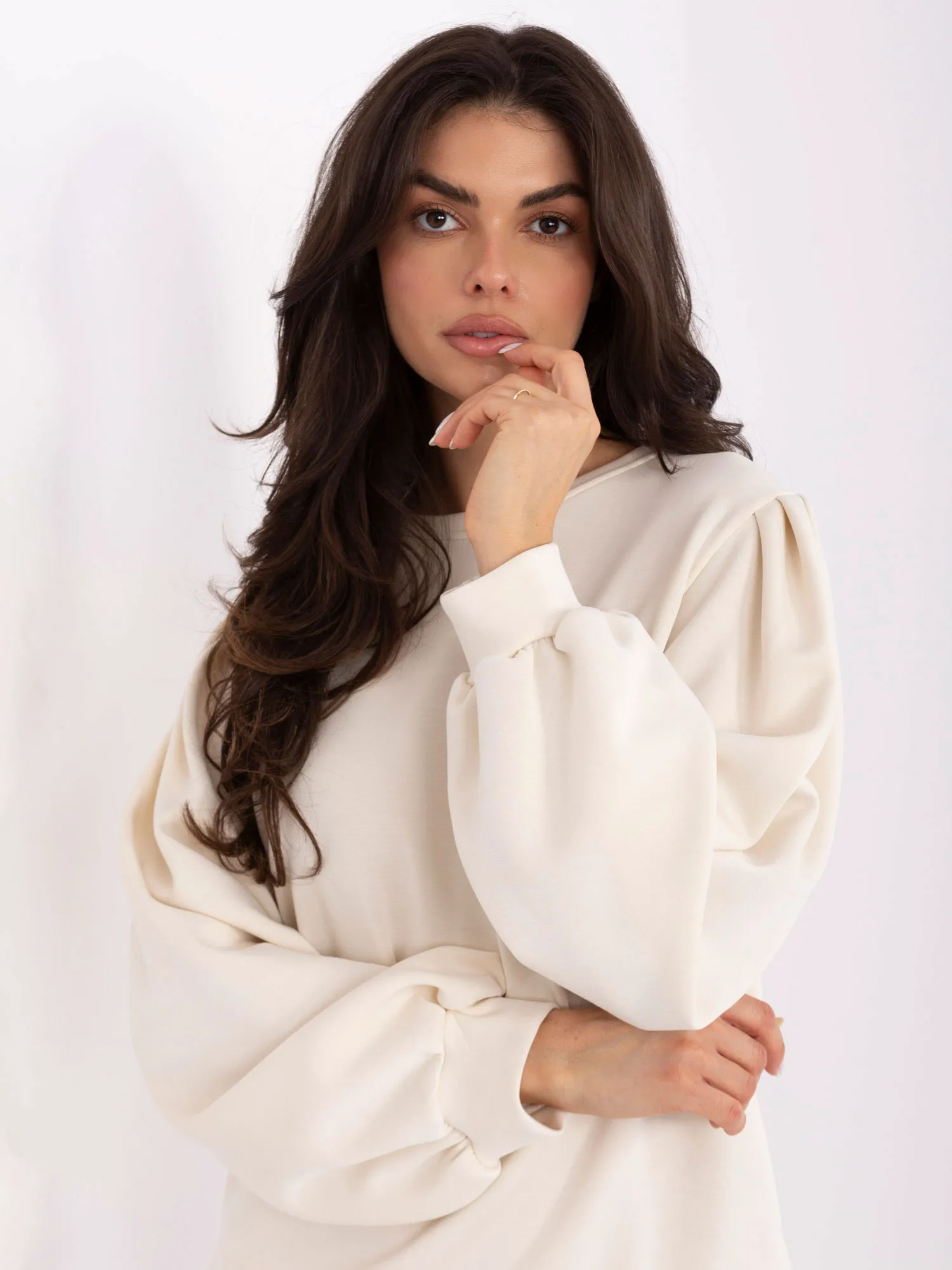 Wymiary bluzy w rozmiarze one size mierzone na płasko: szerokość pod pachami - 53 cm, długość całkowita - 69 cm, szerokość na dole - 50 cm, długość rękawa - 61 cm.