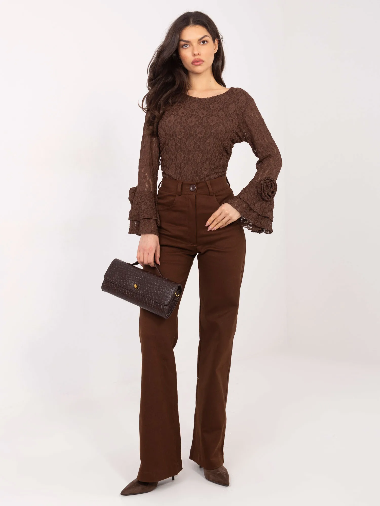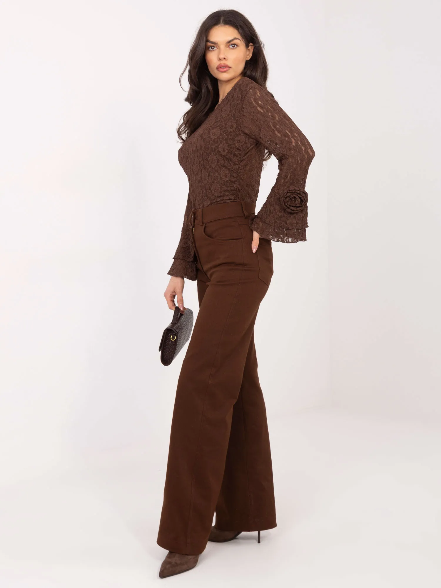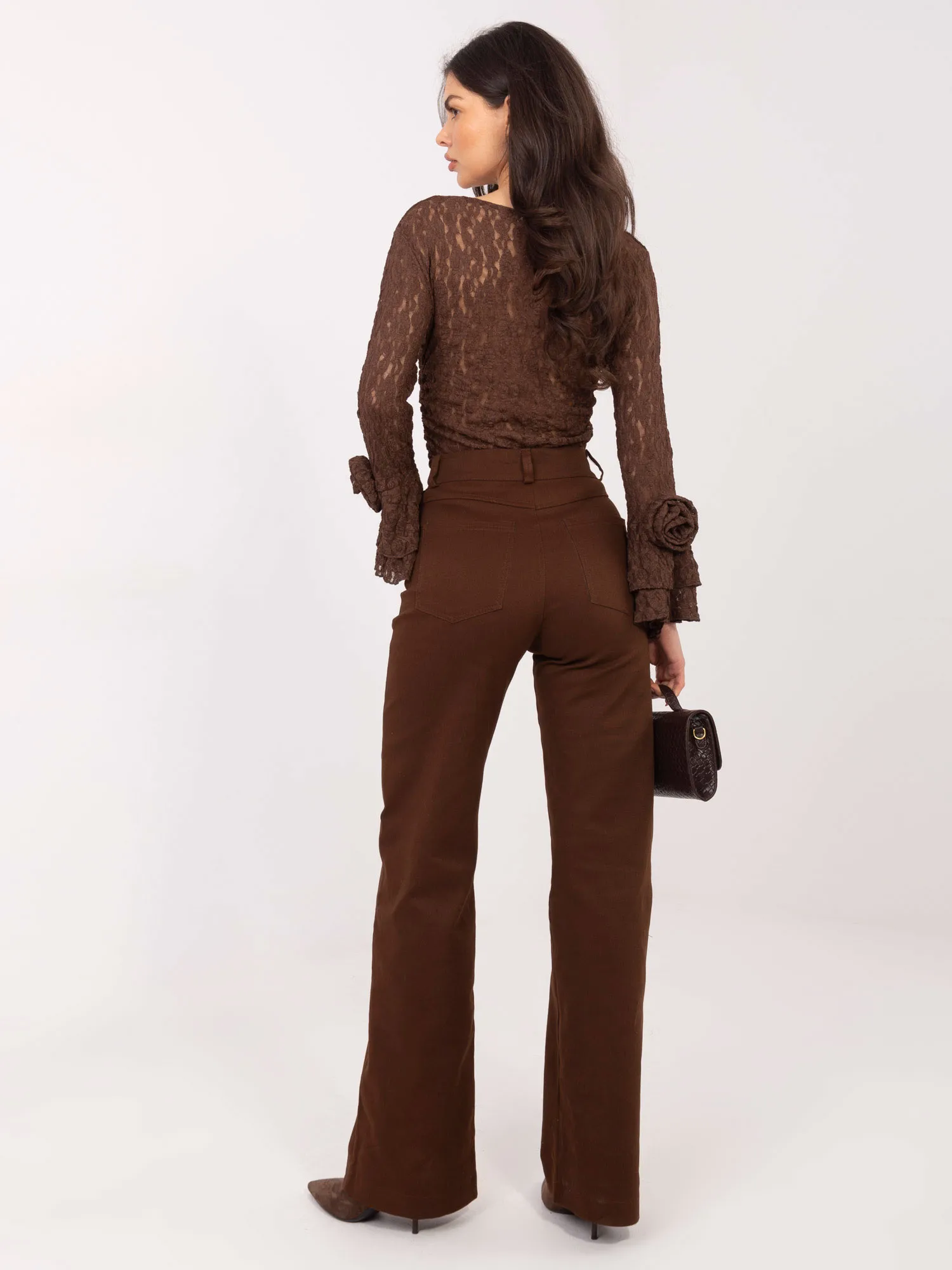 36 dydžio kelnių išmatavimai: išmatuoti plokščiai: juosmens plotis - 32 cm, klubų plotis - 43 cm, juosmens aukštis - 30 cm, bendras ilgis - 112 cm.