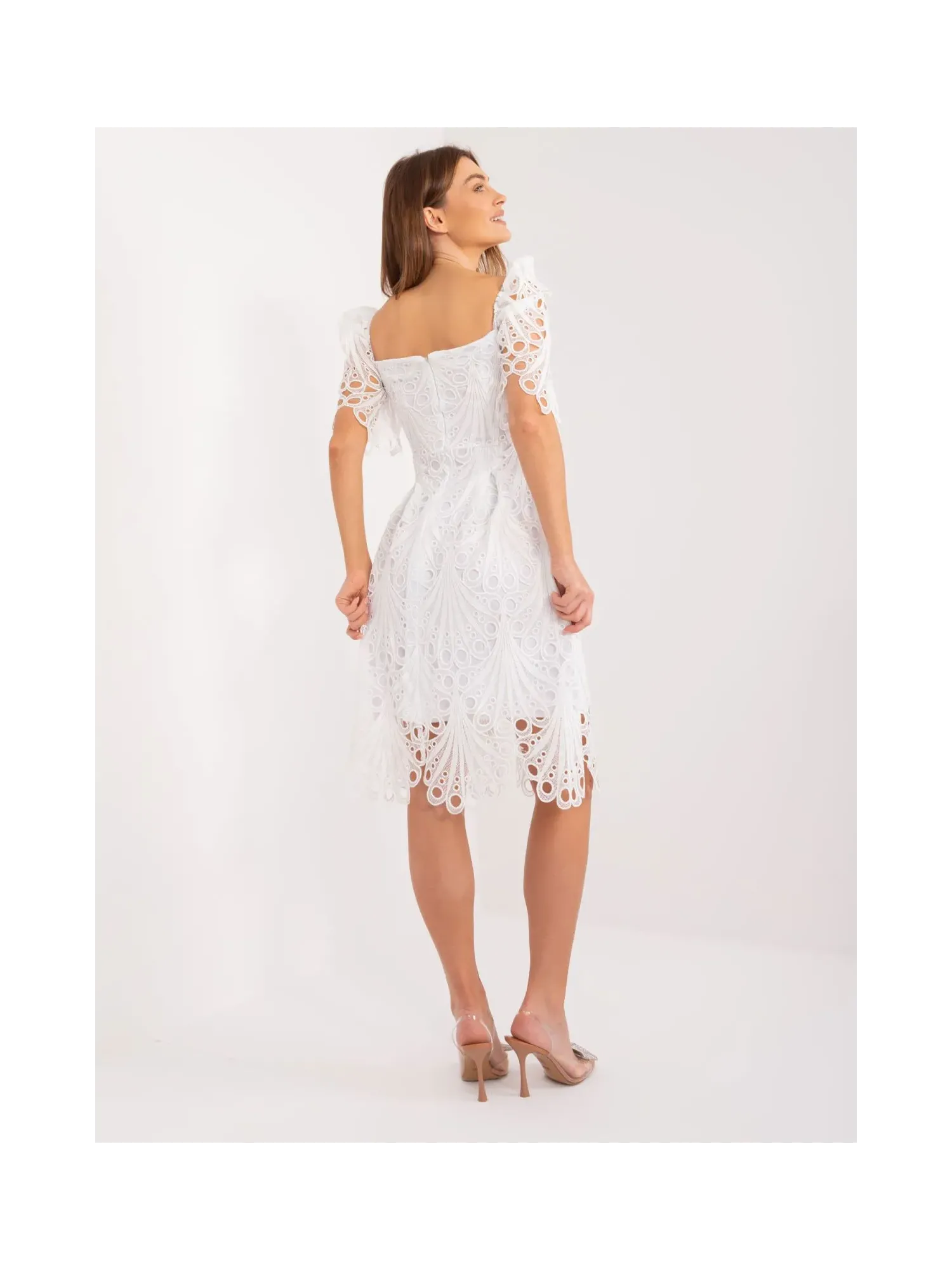 RUE PARIS Biała sukienka w grochy z falbaną.