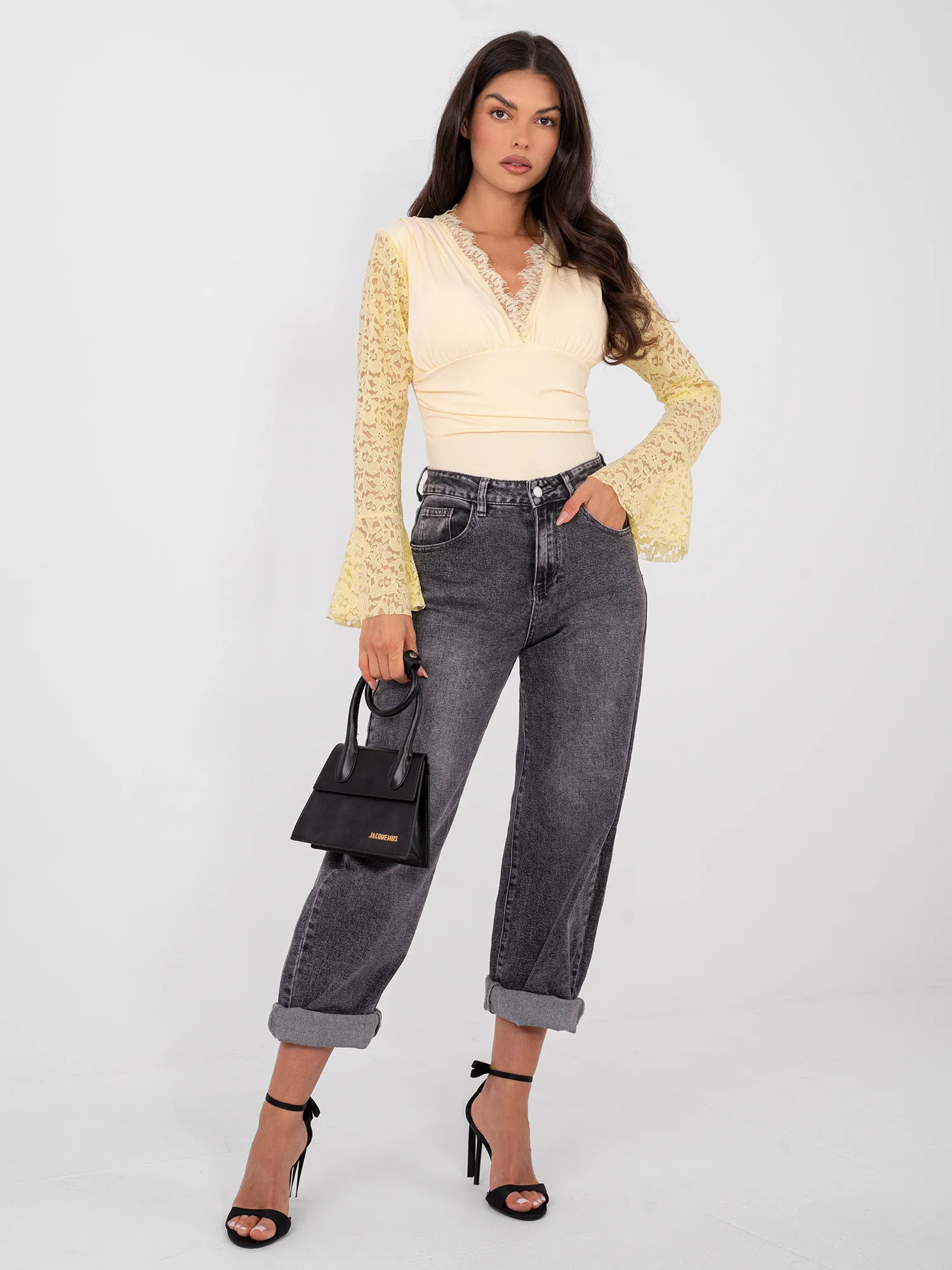 Modelis dėvi pirmąjį dydį. Modelio išmatavimai: ūgis 173 cm, krūtinės apimtis 85 cm, juosmuo 62 cm, klubai 95 cm .