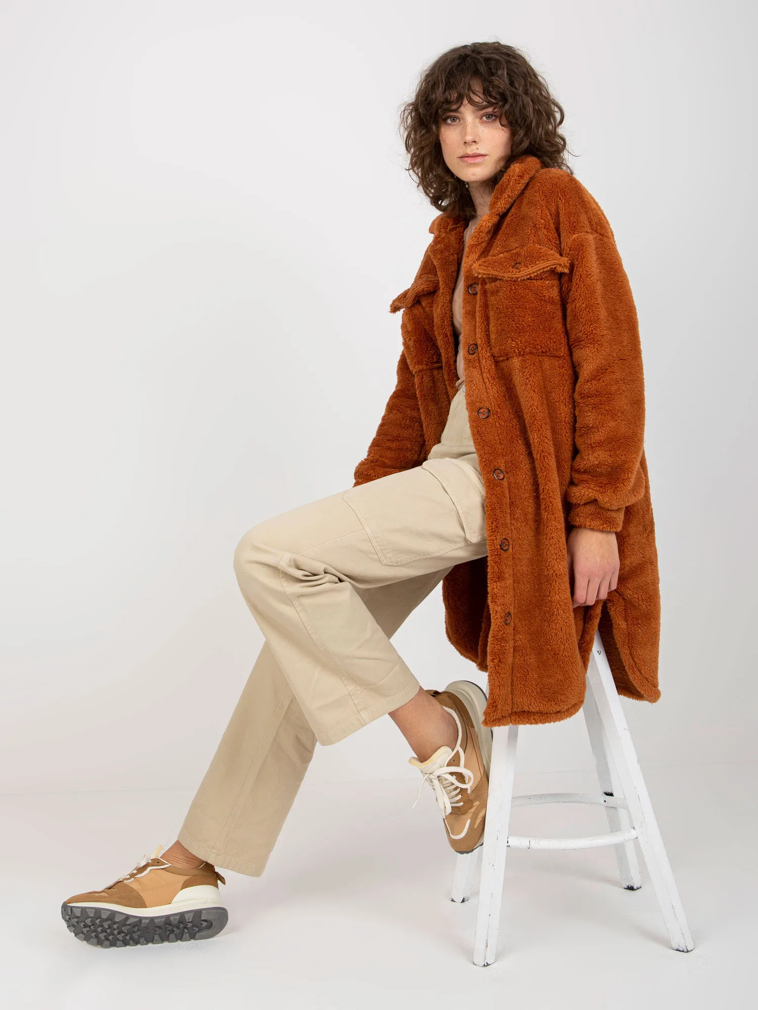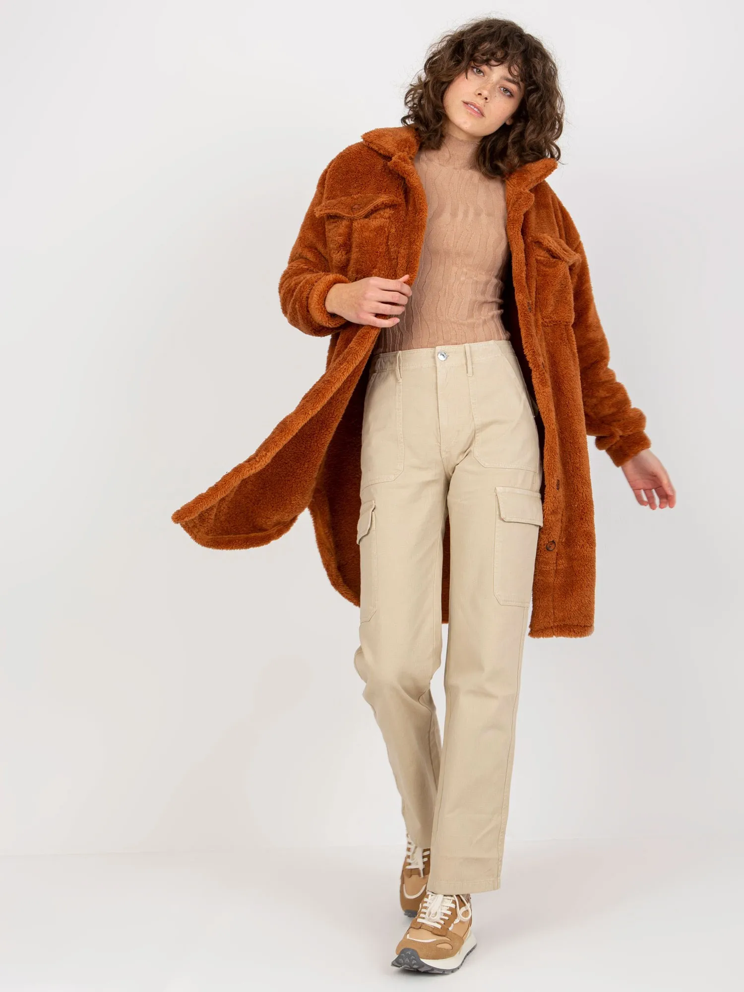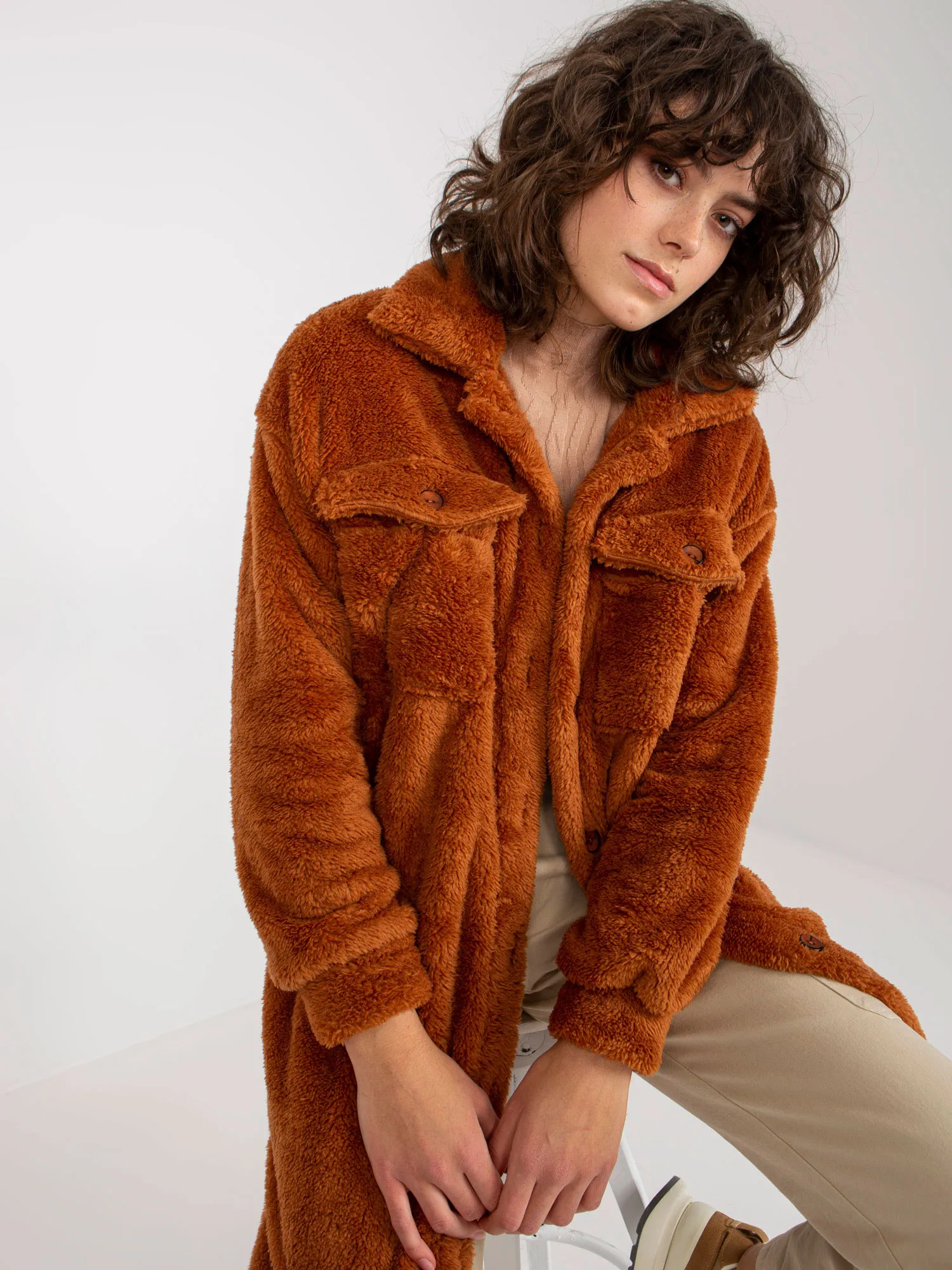 Jasnobrązowa długa koszula futrzana na guziki RUE PARIS .
