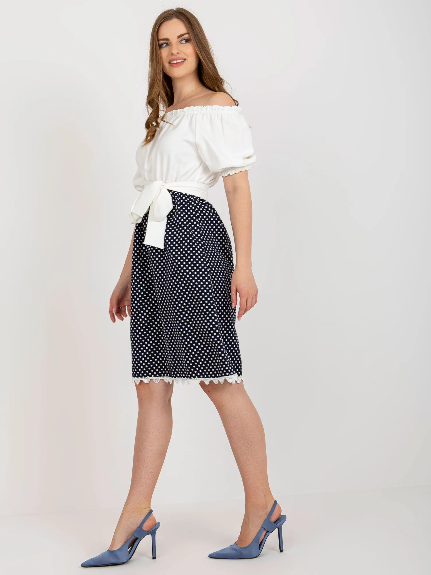 Ecru-granatowa koktajlowa sukienka hiszpanka z paskiem .