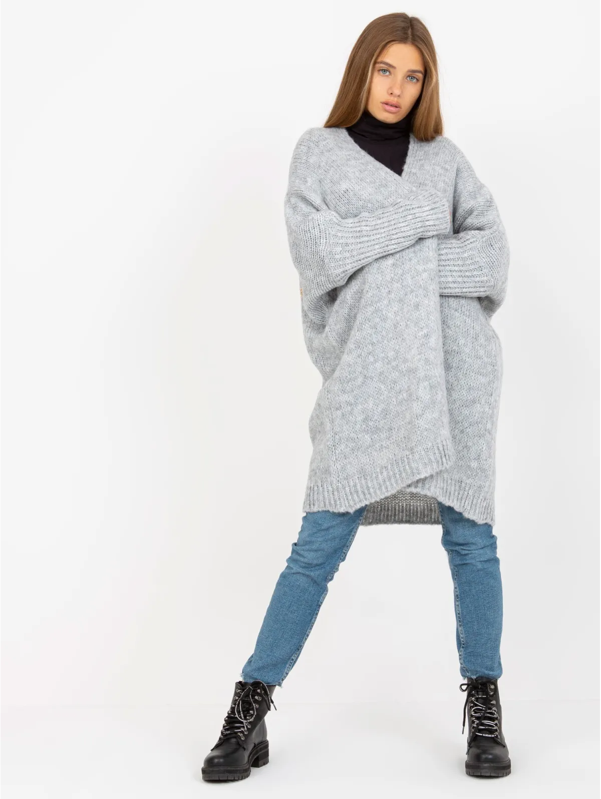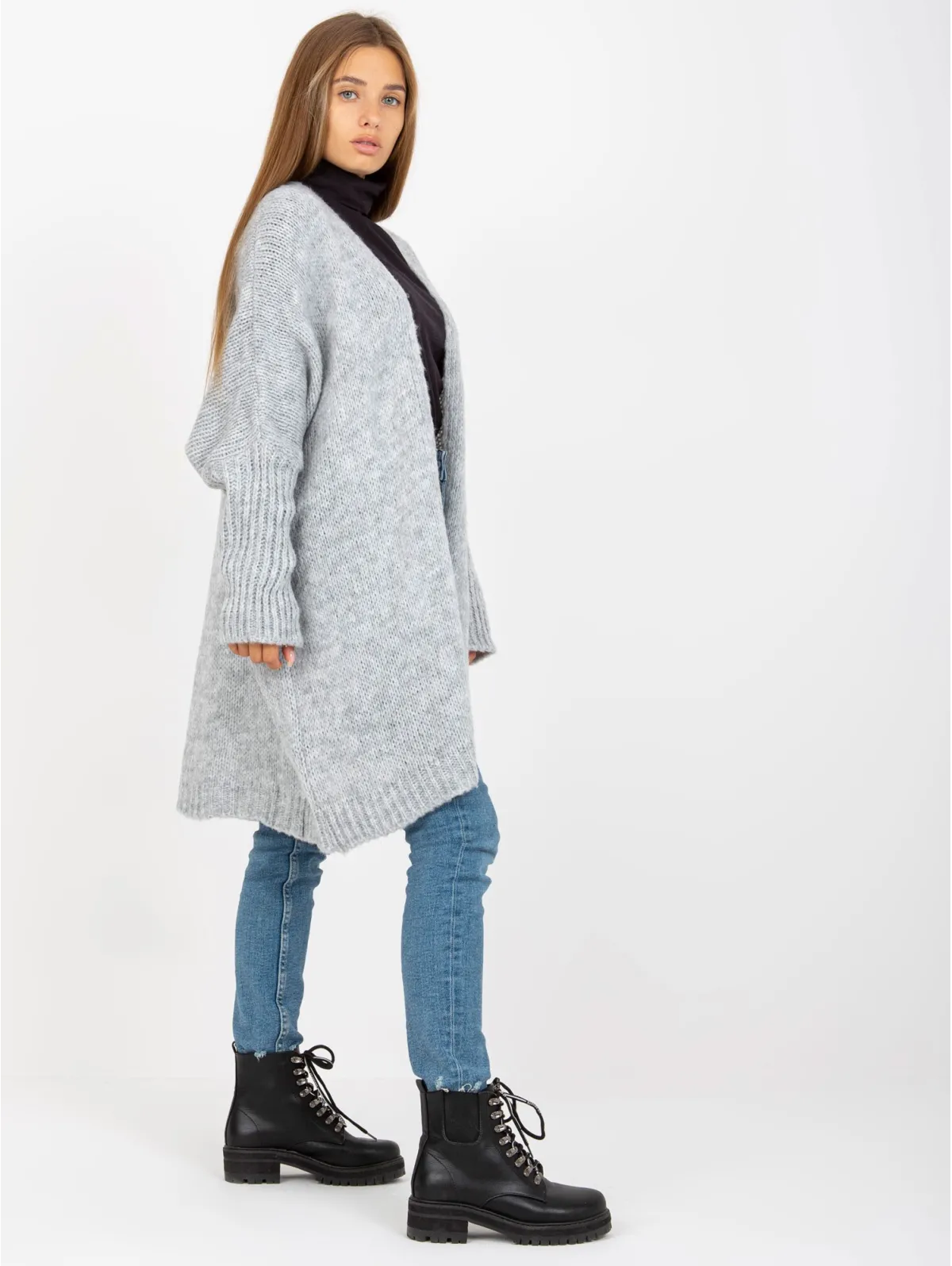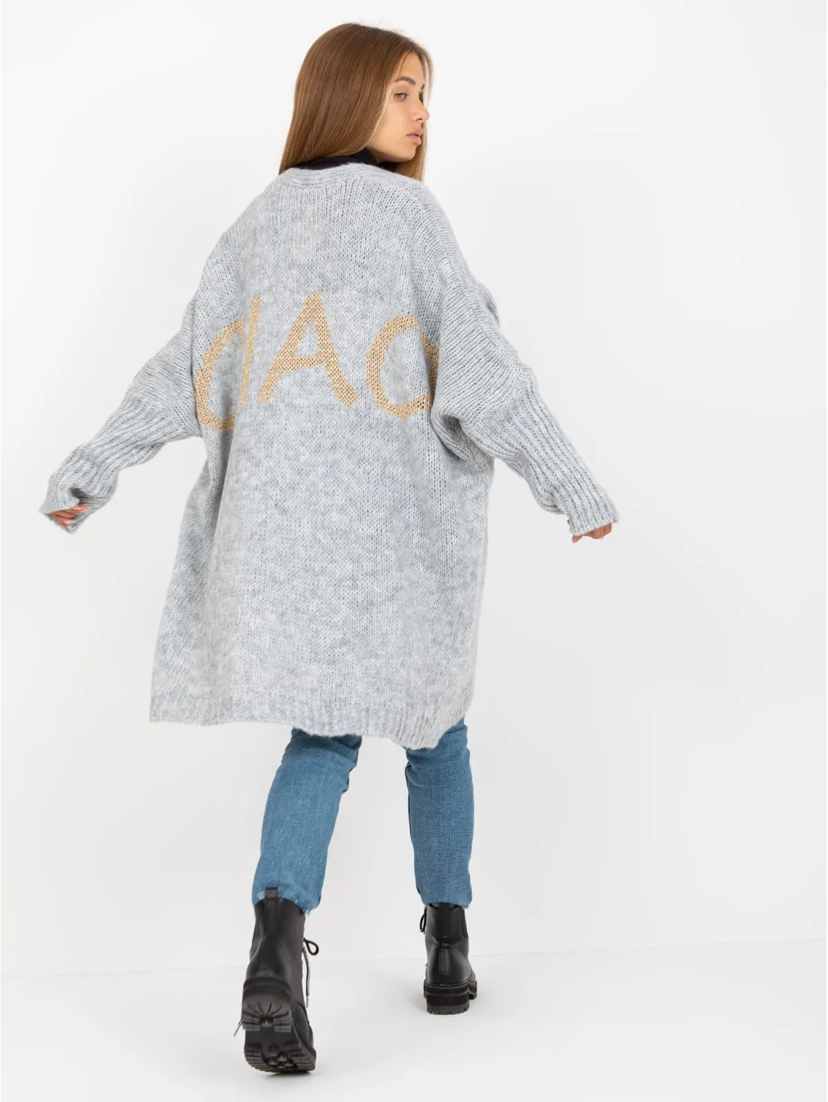 Kardigano one size dydžio išmatavimai: krūtinė - 85 cm, bendras ilgis - 80 cm, rankovių ilgis - 56 cm.