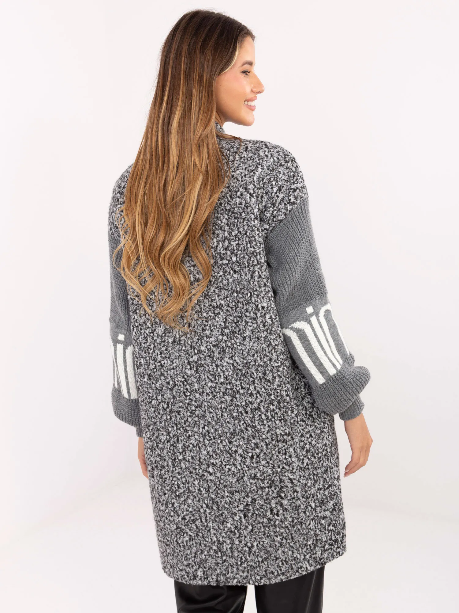 Kardigano matmenys vieno dydžio: plotis po pažastimis - 63 cm, bendras ilgis - 98 cm, rankovių ilgis - 55 cm (nuo siūlės), klubų plotis - 68 cm.