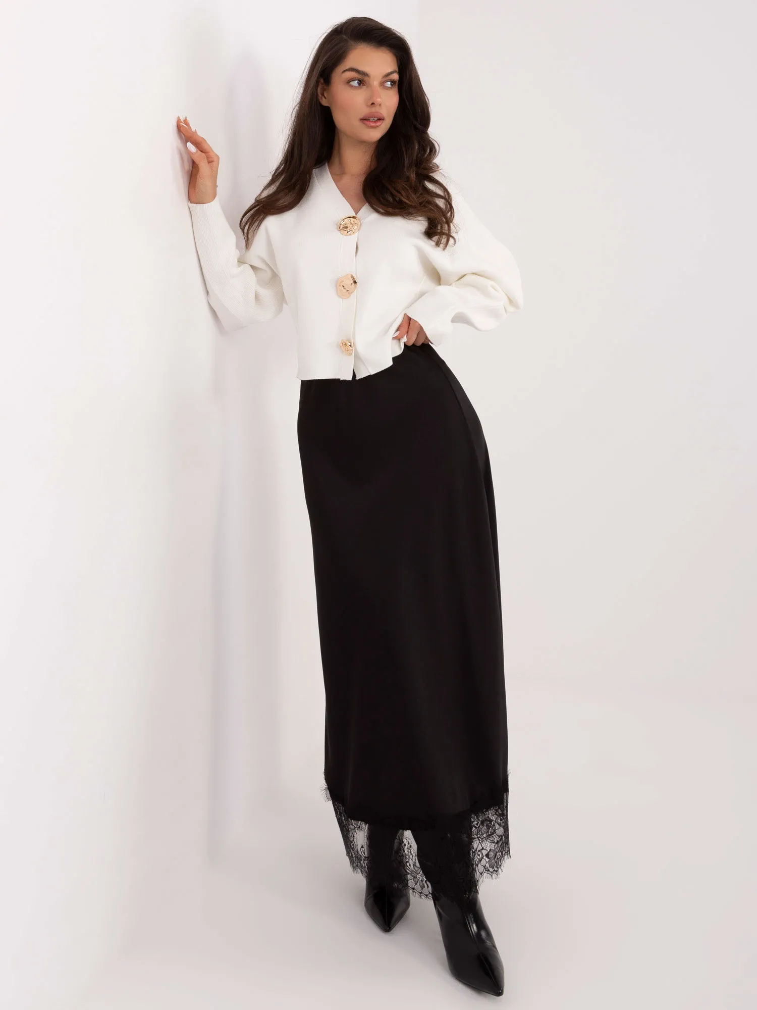 Modelis dėvi pirmąjį dydį. Modelio išmatavimai: ūgis 173 cm, krūtinės apimtis 85 cm, juosmuo 62 cm, klubai 95 cm .