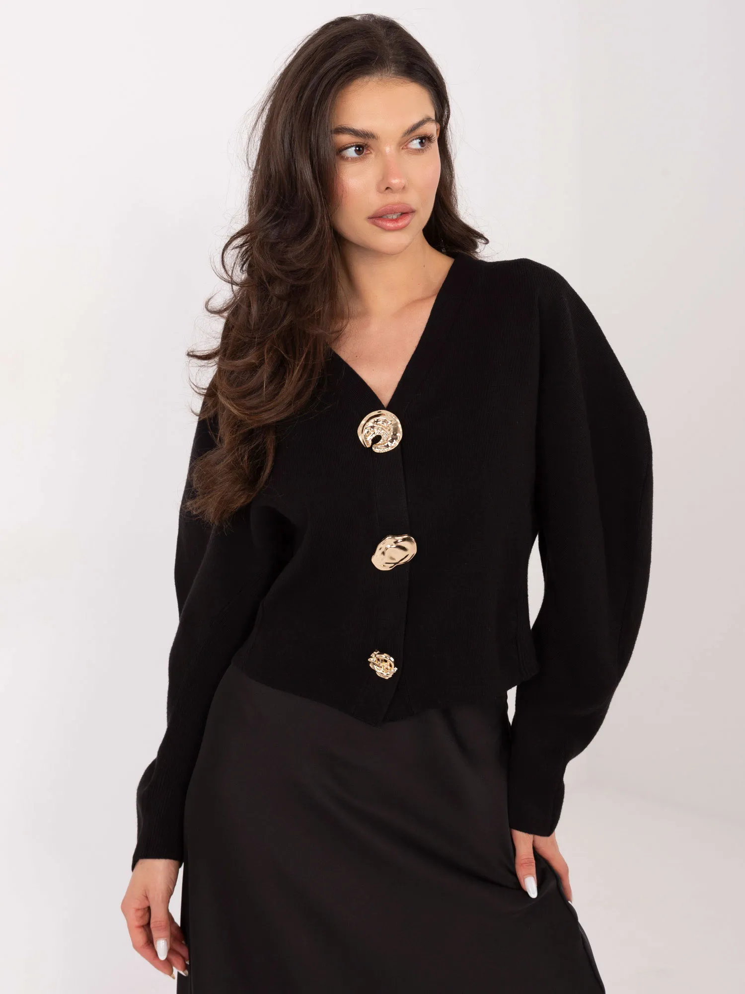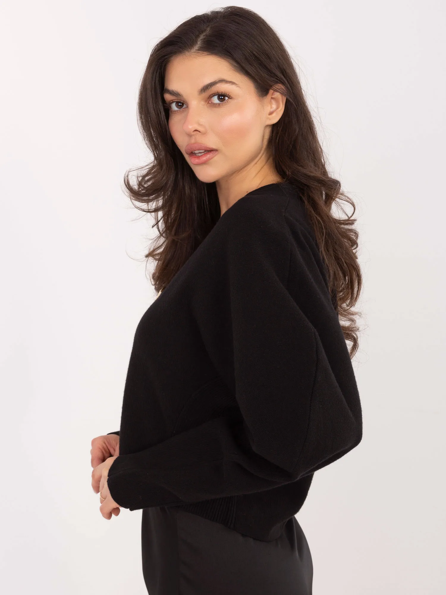 Wymiary swetra w rozmiarze one size mierzone na płasko: szerokość pod pachami - 51 cm, szerokość w biodrach - 42 cm, długość rękawa - 70 cm (od szwu), długość całkowita - 53 cm.