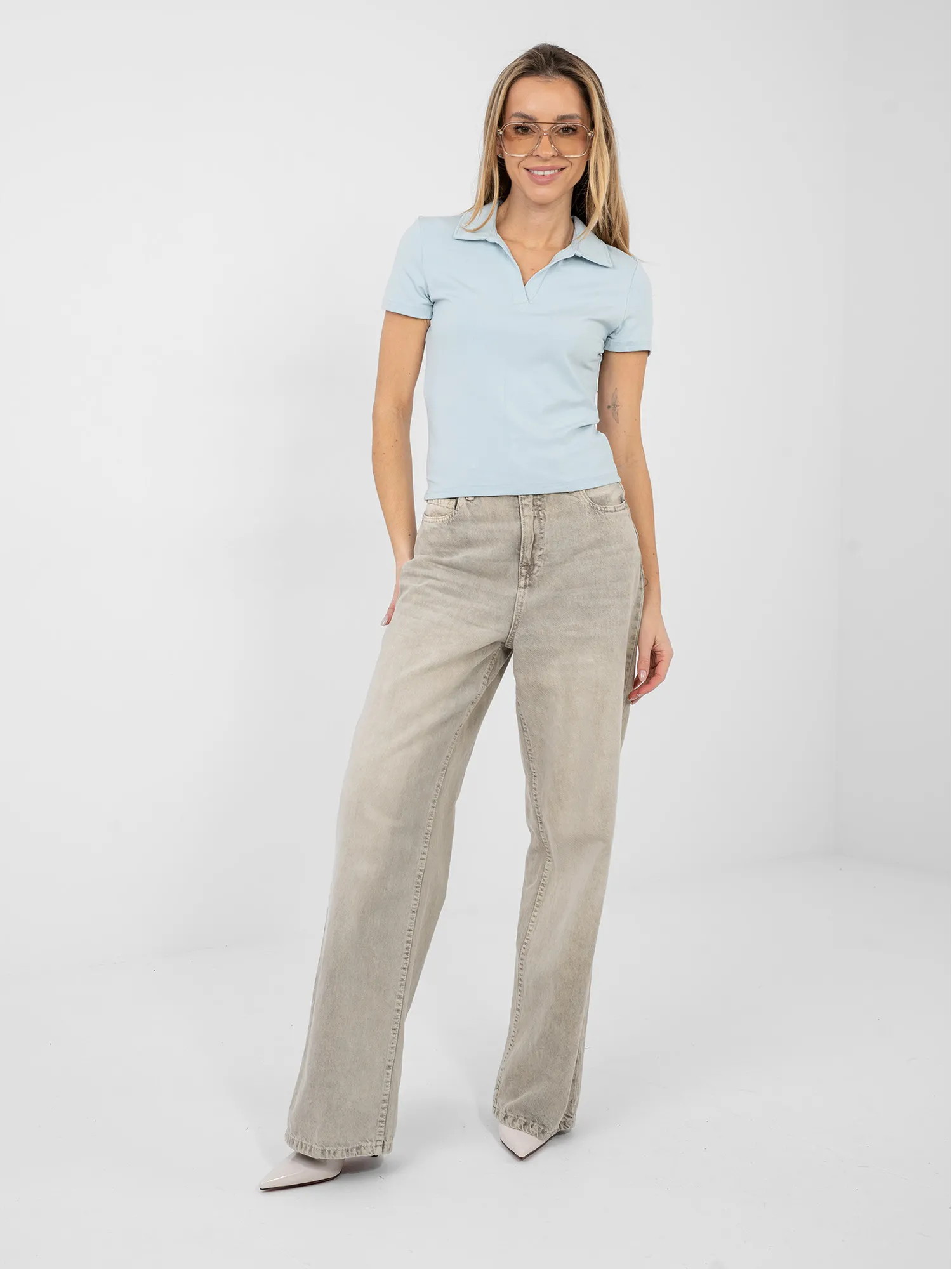 Modelis dėvi pirmąjį dydį. Modelio išmatavimai: ūgis 169 cm, krūtinės apimtis 88 cm, juosmuo 68 cm, klubai 89 cm .