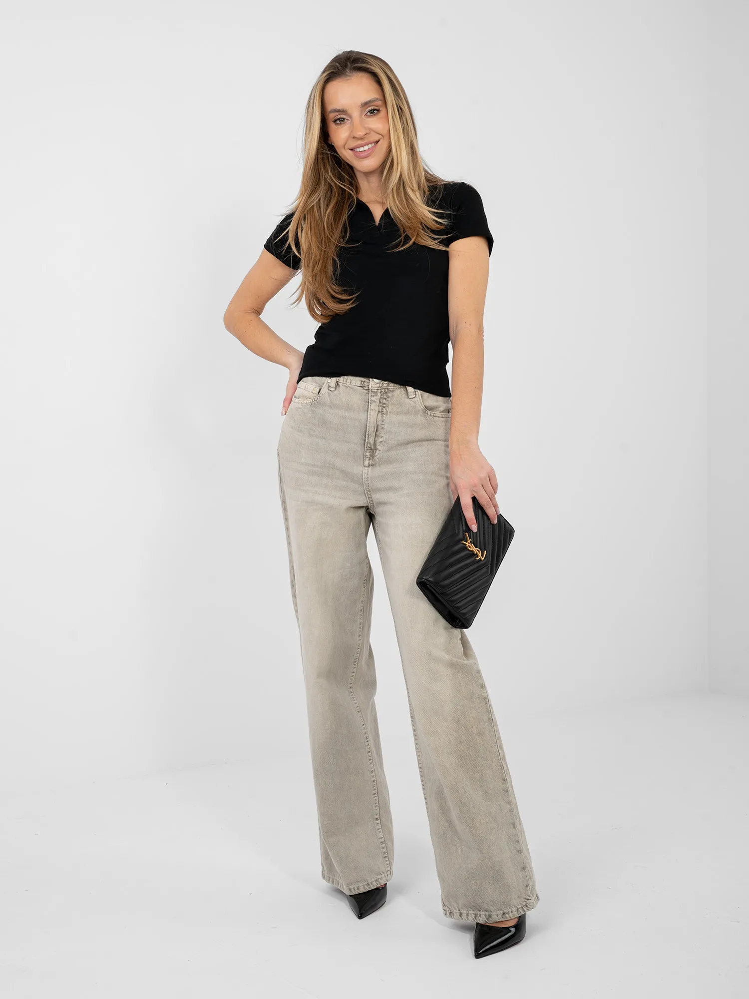 Modelis dėvi pirmąjį dydį. Modelio išmatavimai: ūgis 169 cm, krūtinės apimtis 88 cm, juosmuo 68 cm, klubai 89 cm .