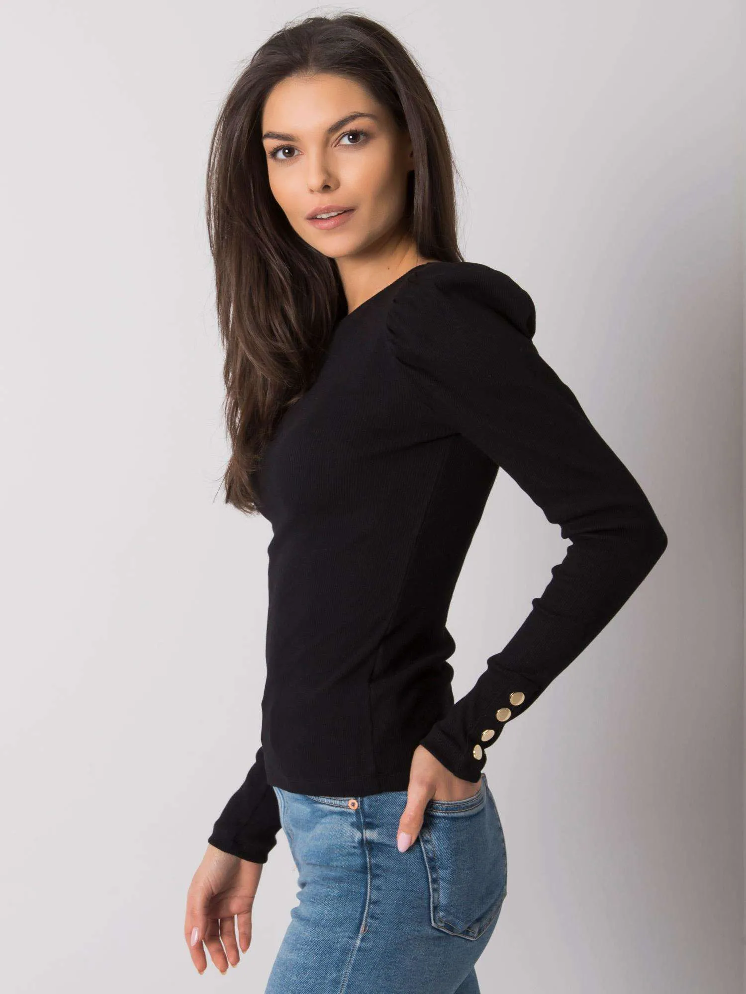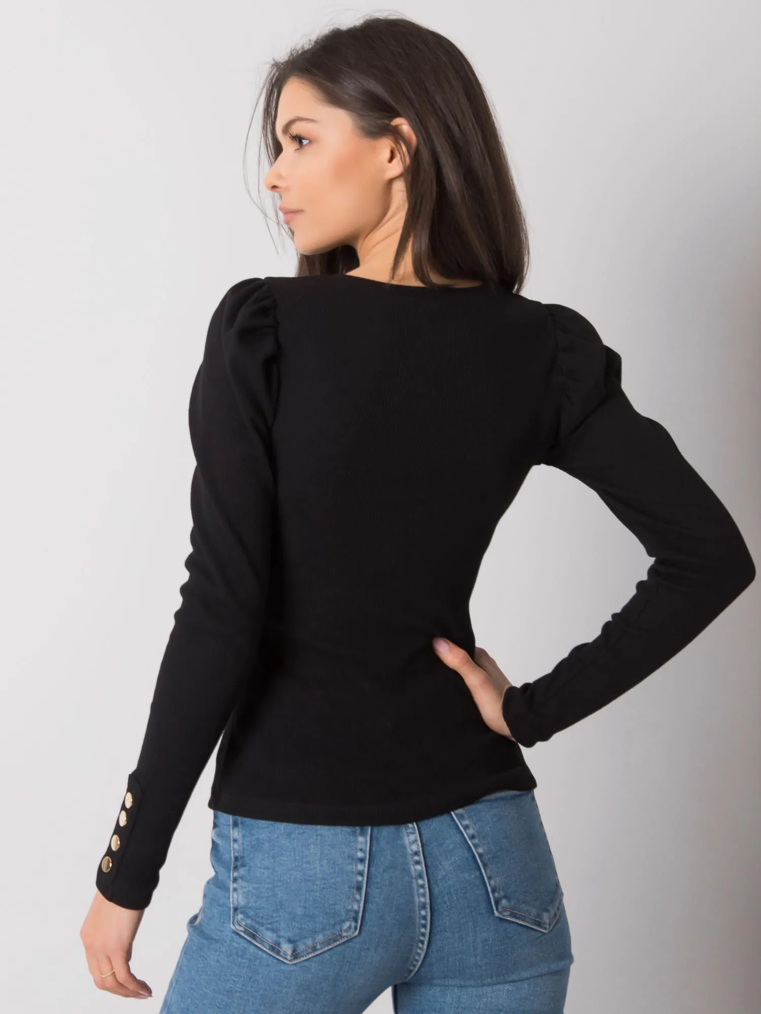 RUE PARIS Czarna bluzka damska z długim rękawem.