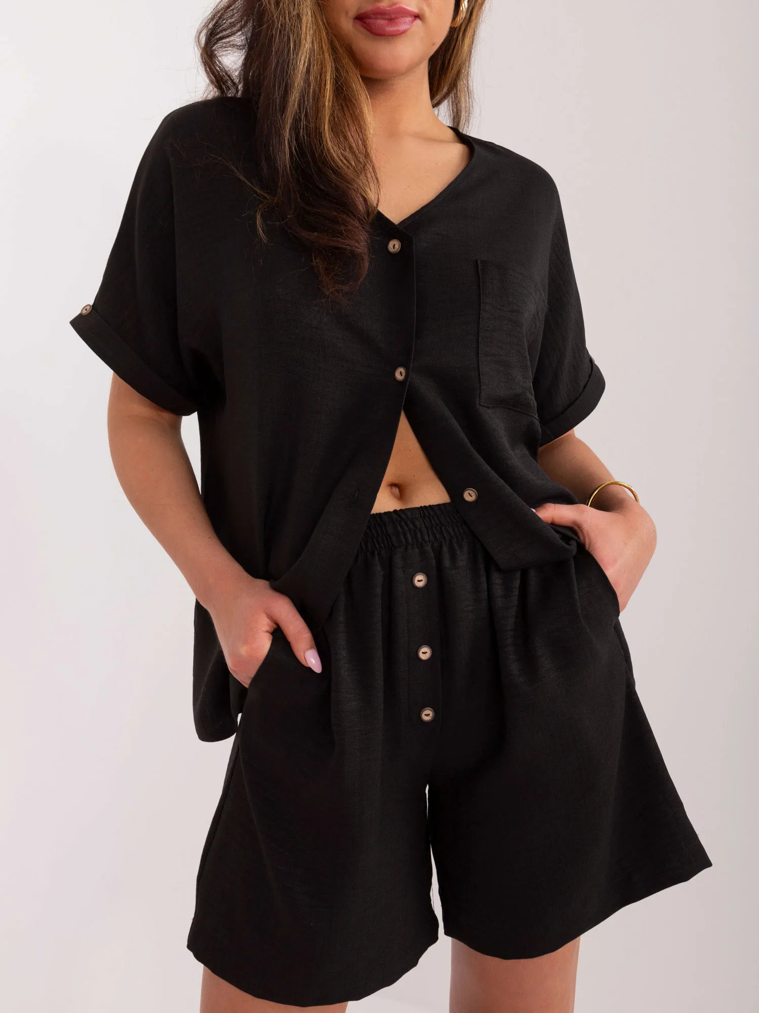 S/M dydžio rinkinio matmenys išmatuoti plokščiai: palaidinės plotis po pažastimis - 63 cm, palaidinės ilgis - 65 cm, šortų plotis ties juosmeniu - 31 cm, juosmens aukštis - 32 cm, ilgis šortai - 45 cm.