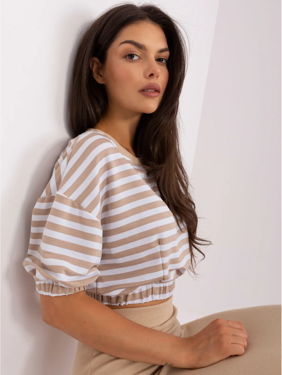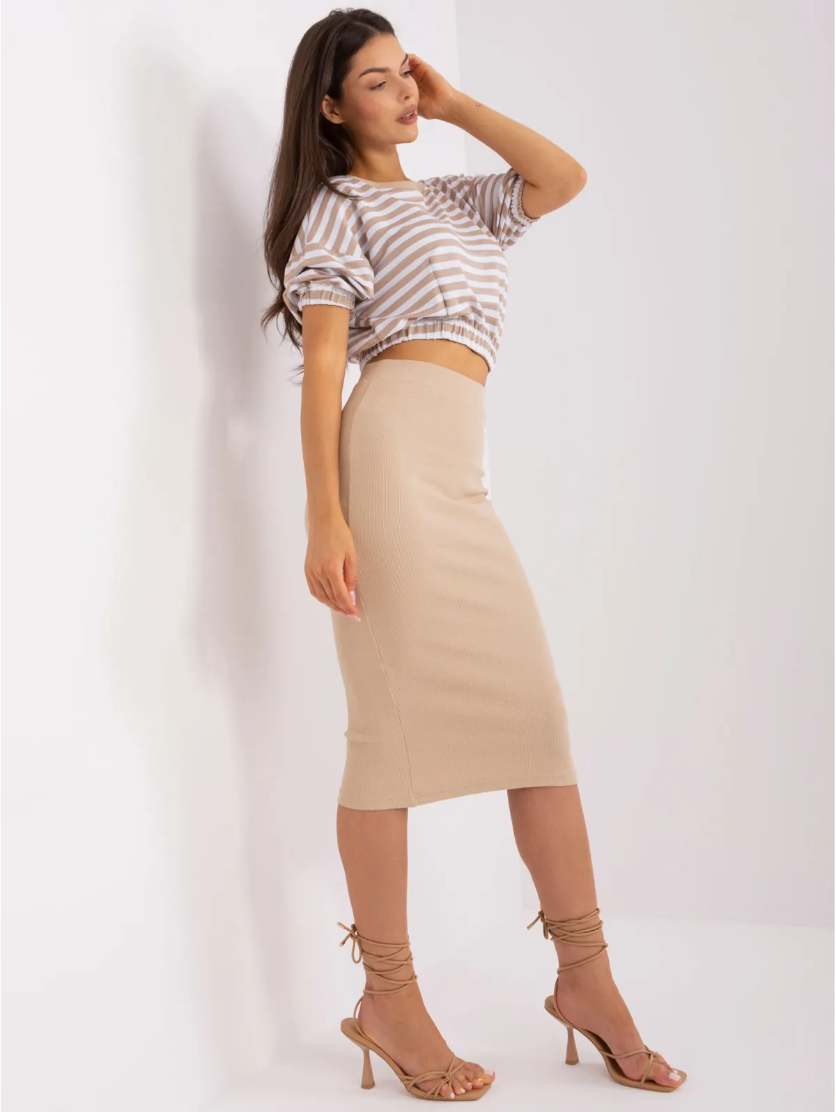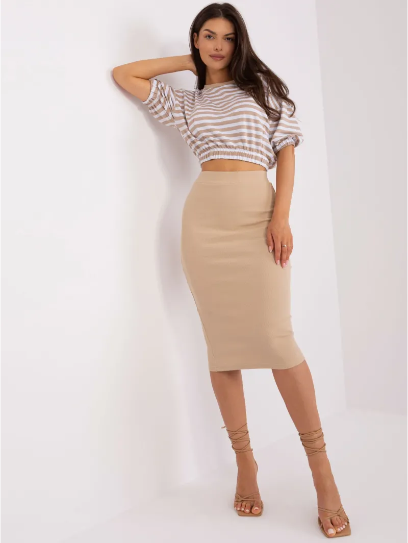 Midi sijonas ir dryžuota palaidinė su guma