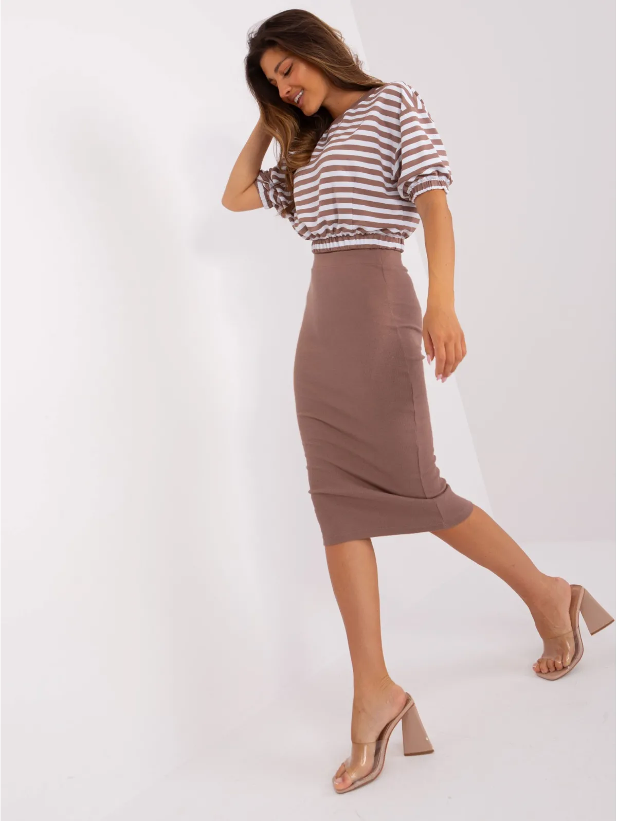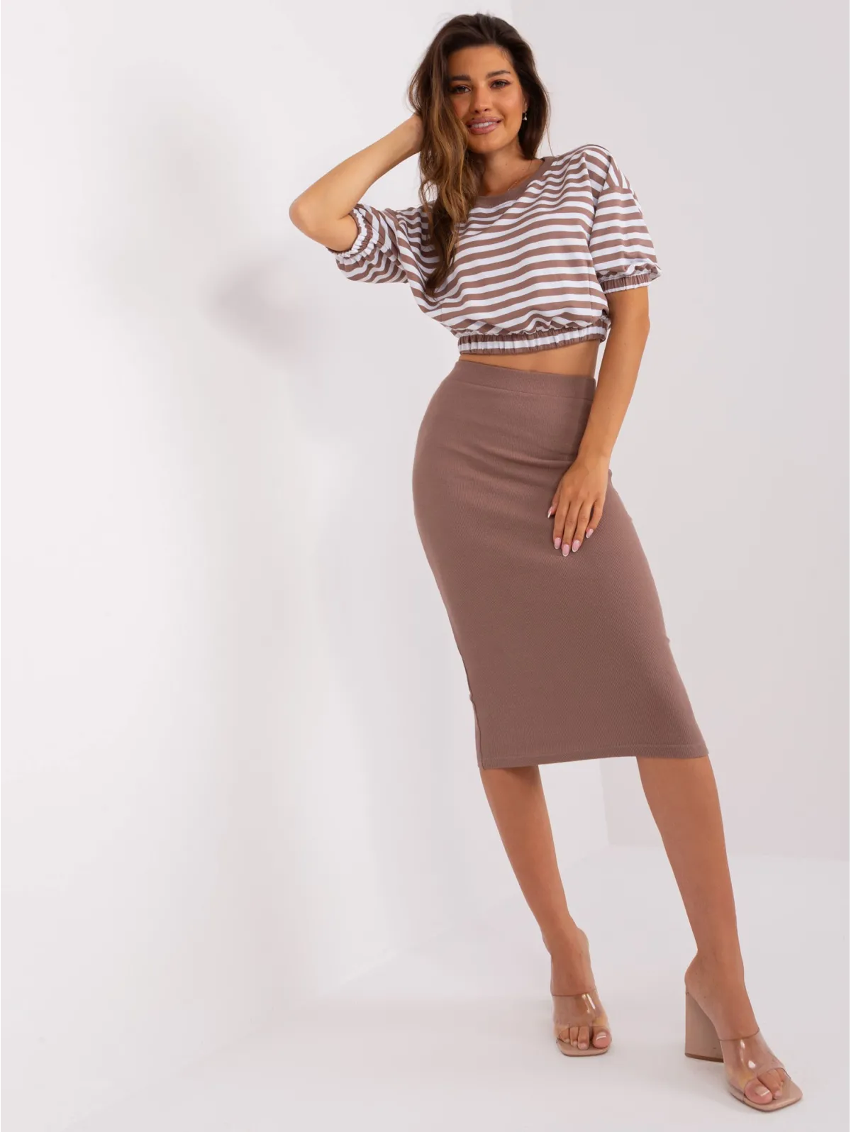 Laisvalaikio kostiumo one size dydžio išmatavimai: palaidinės krūtinės plotis - 55 cm, palaidinės ilgis - 47 cm, sijono plotis ties juosmeniu - 33 cm, sijono ilgis - 74 cm.