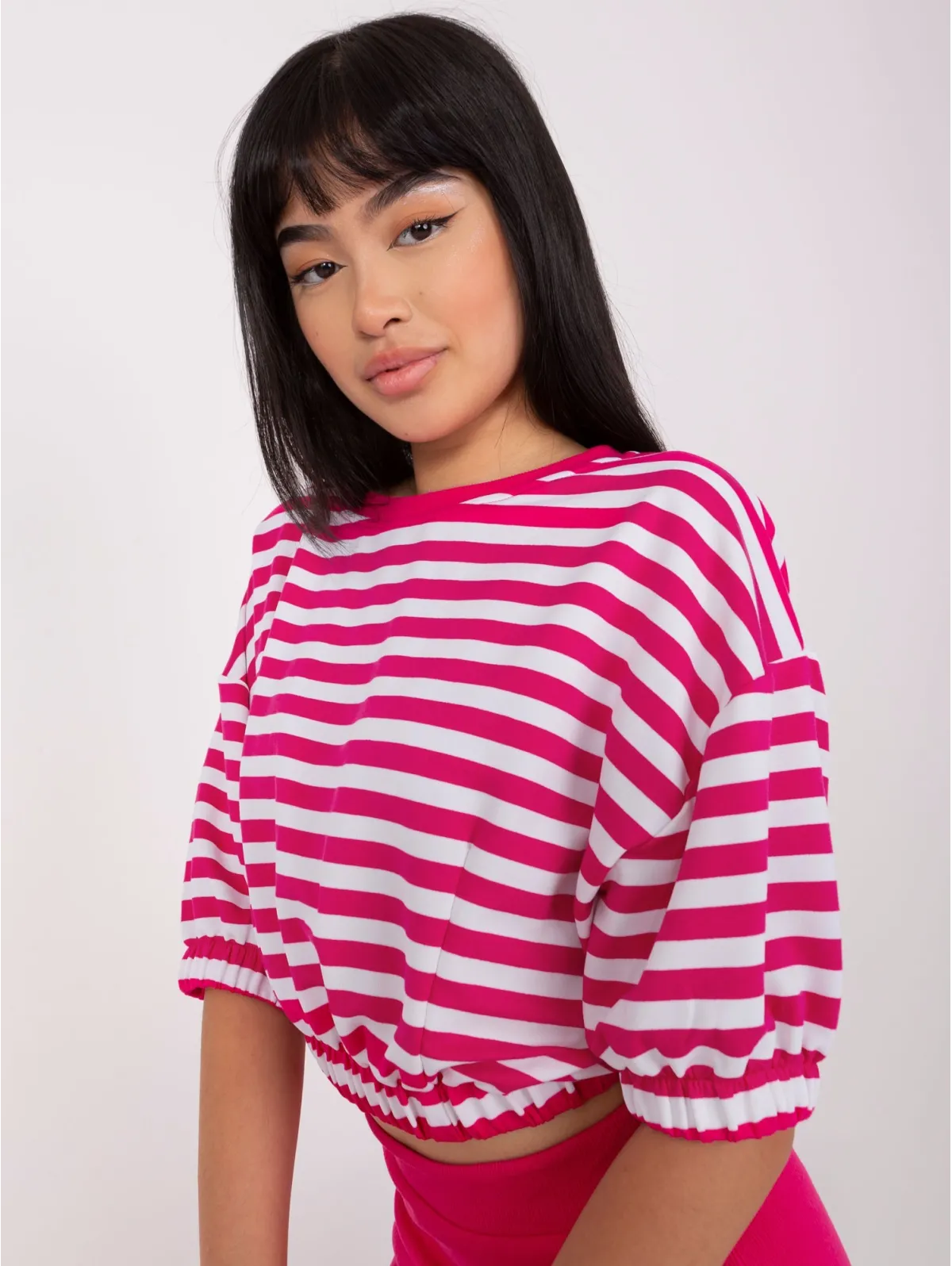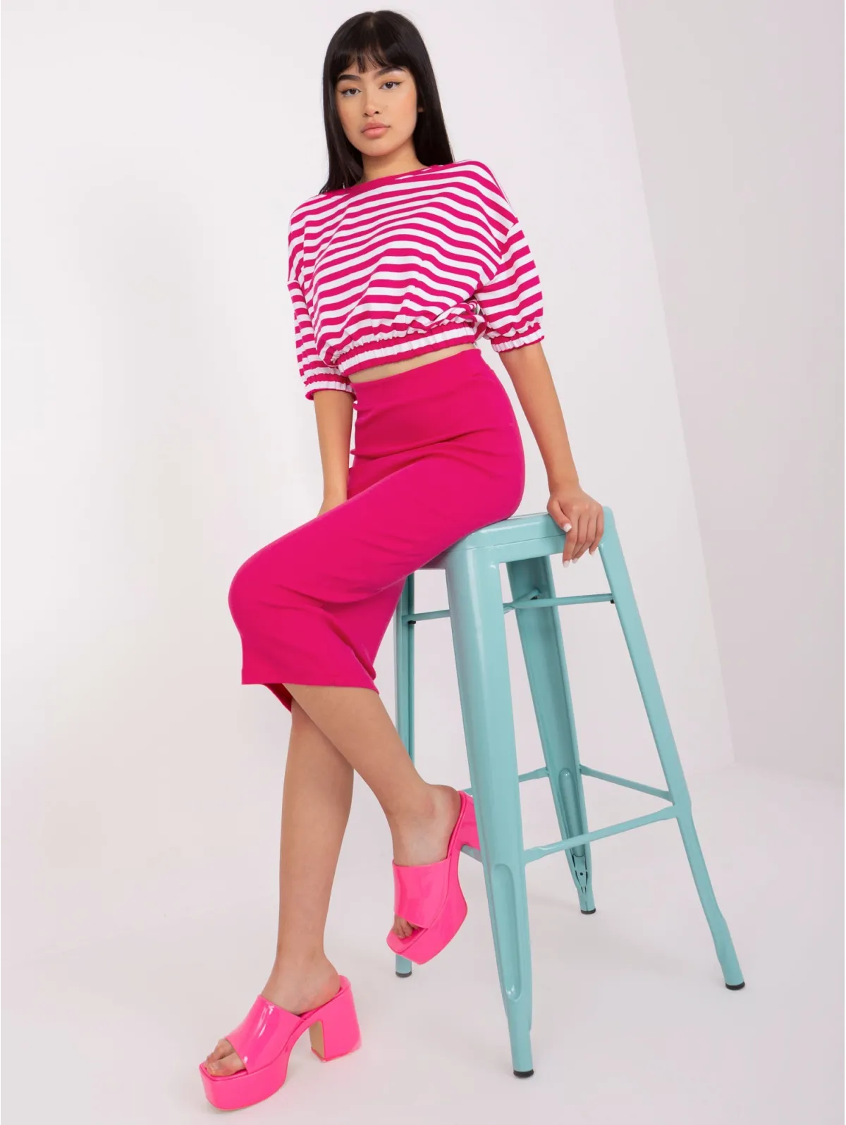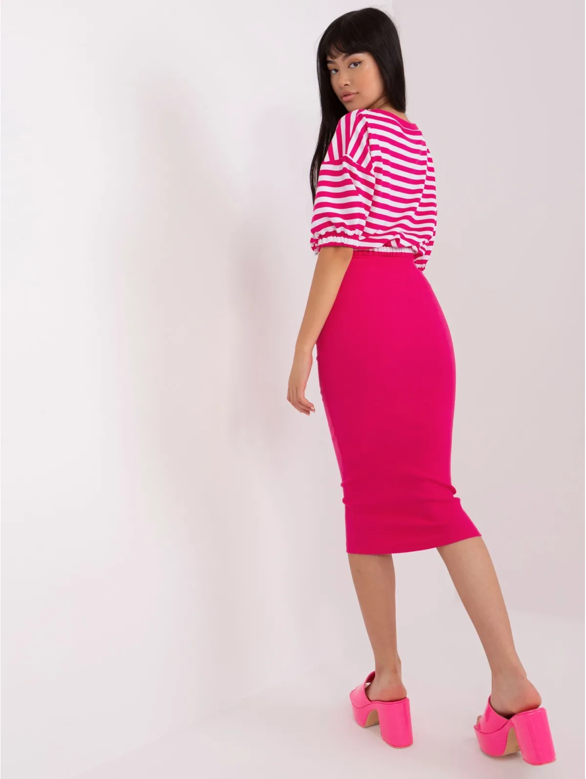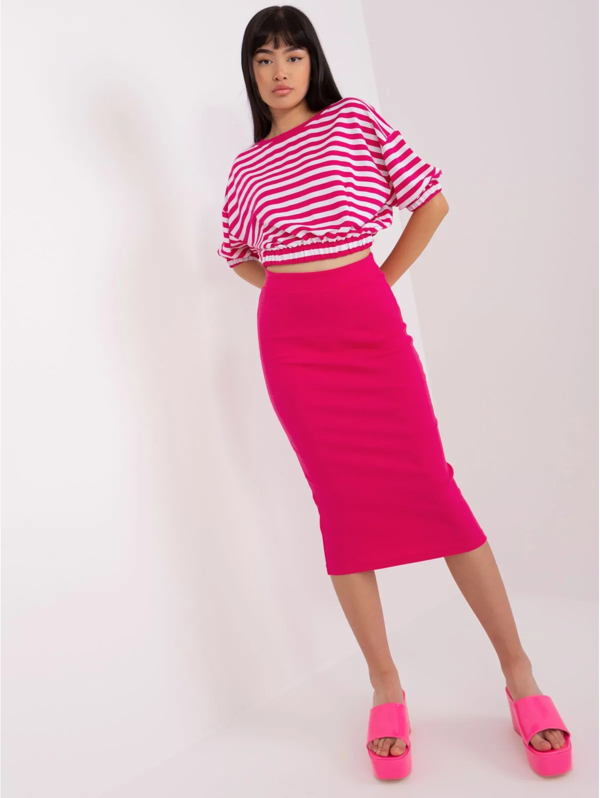 Midi sijonas ir dryžuota palaidinė su guma