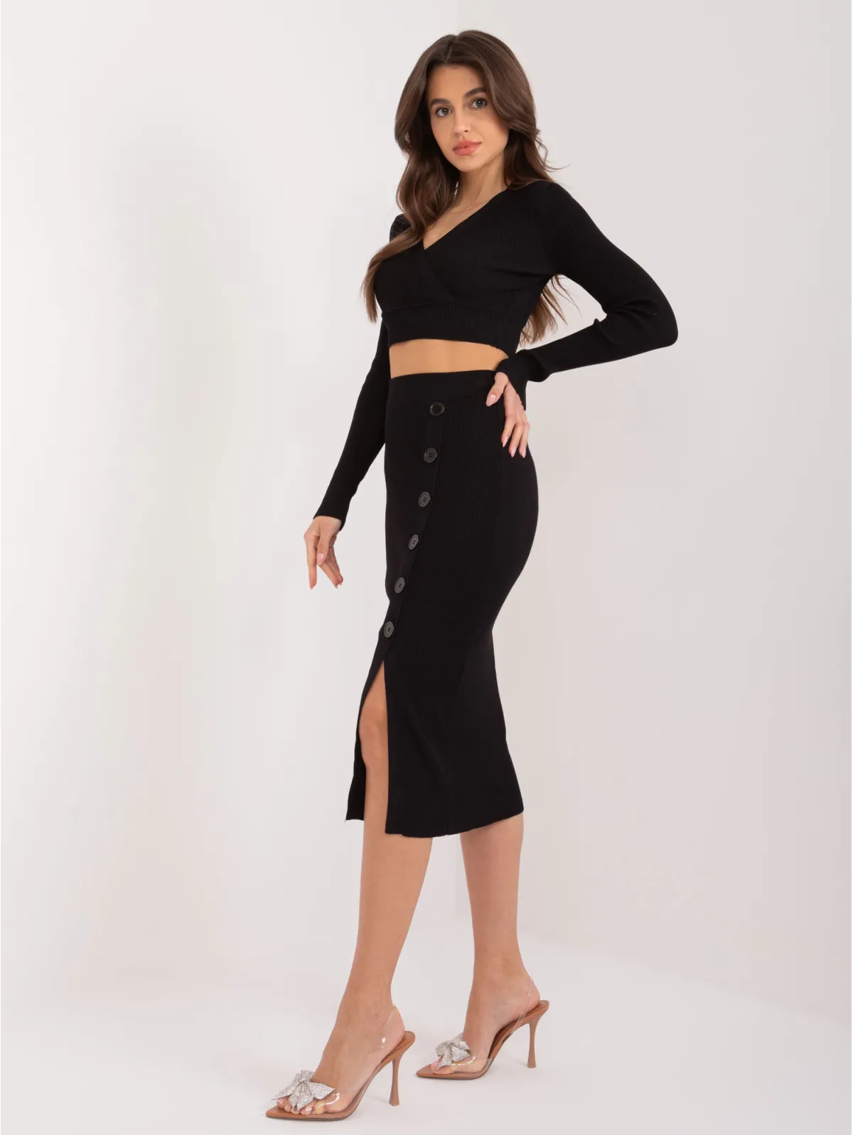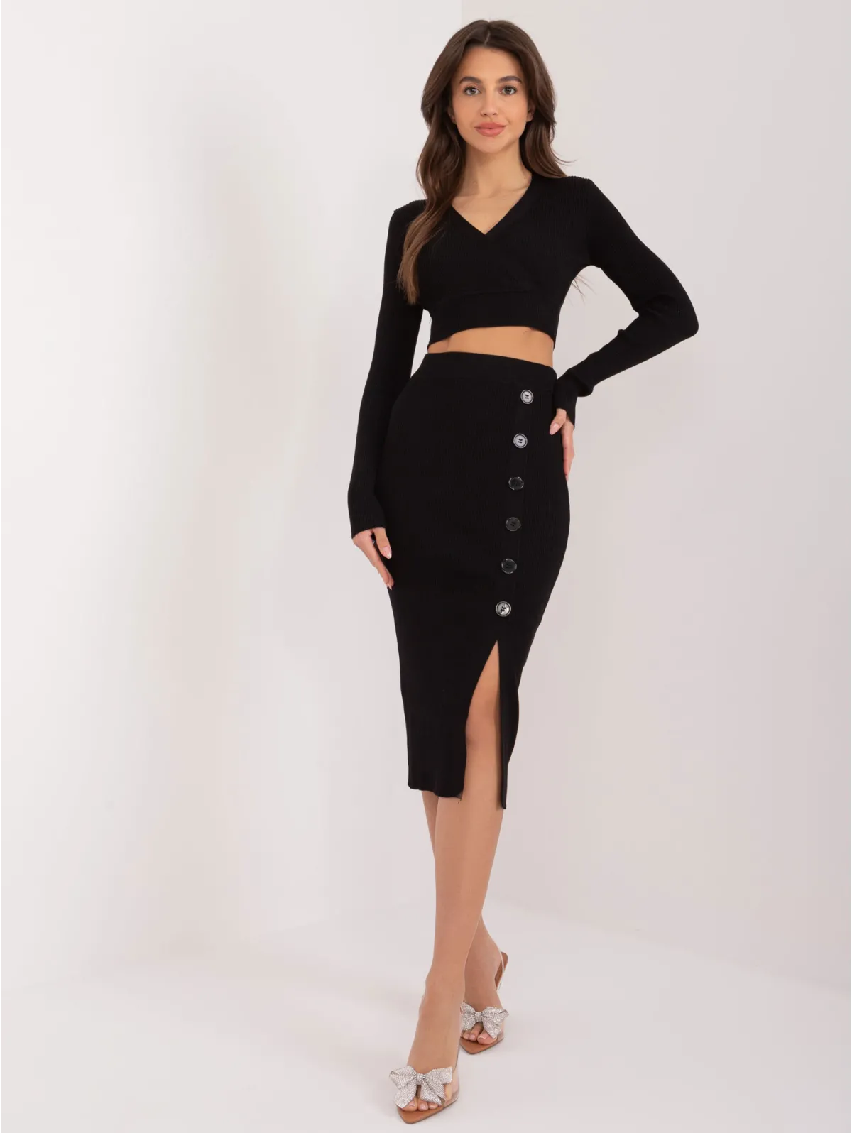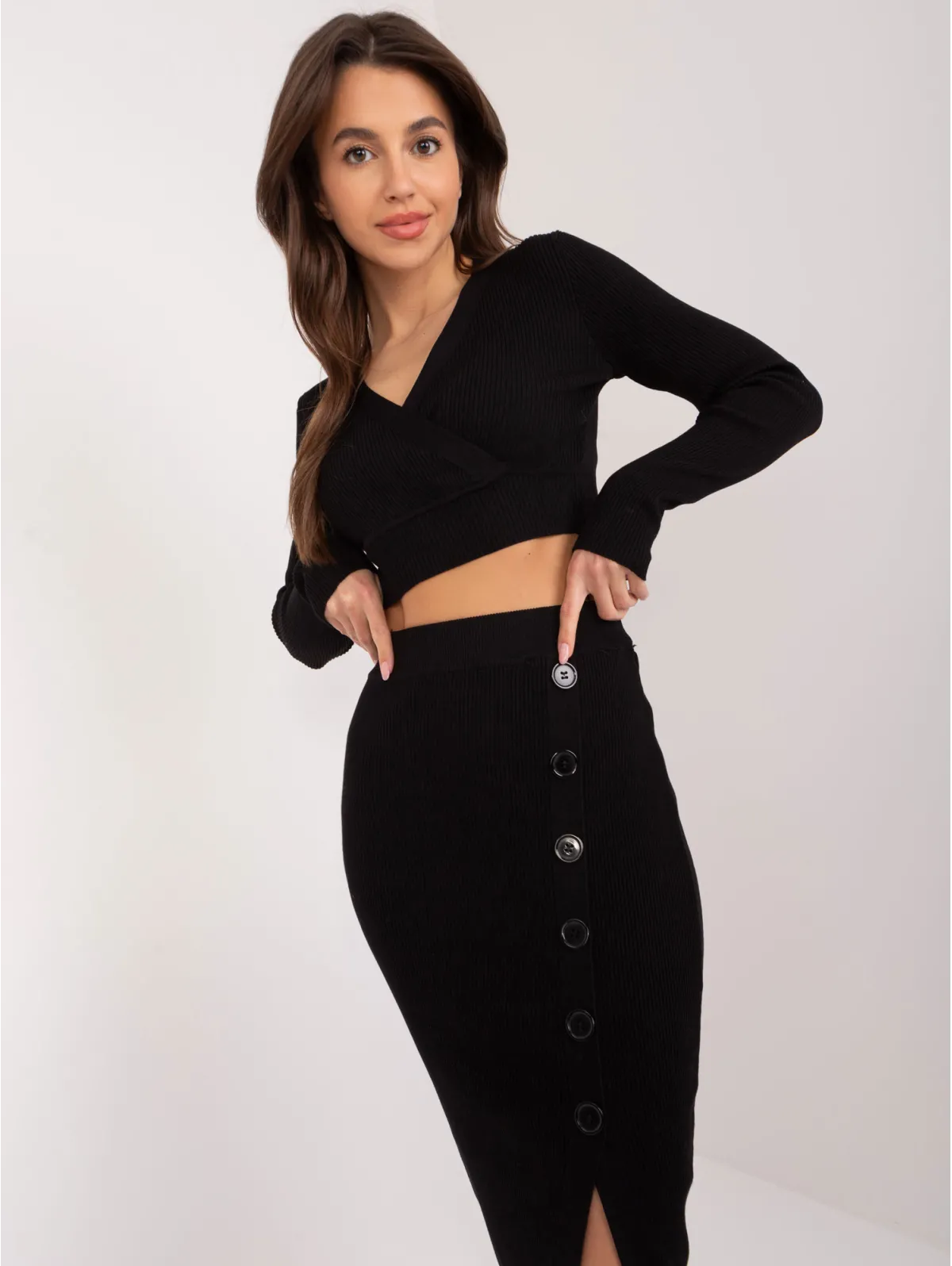 Tekstūrinio rašto kostiumėlis su sagomis ant sijono