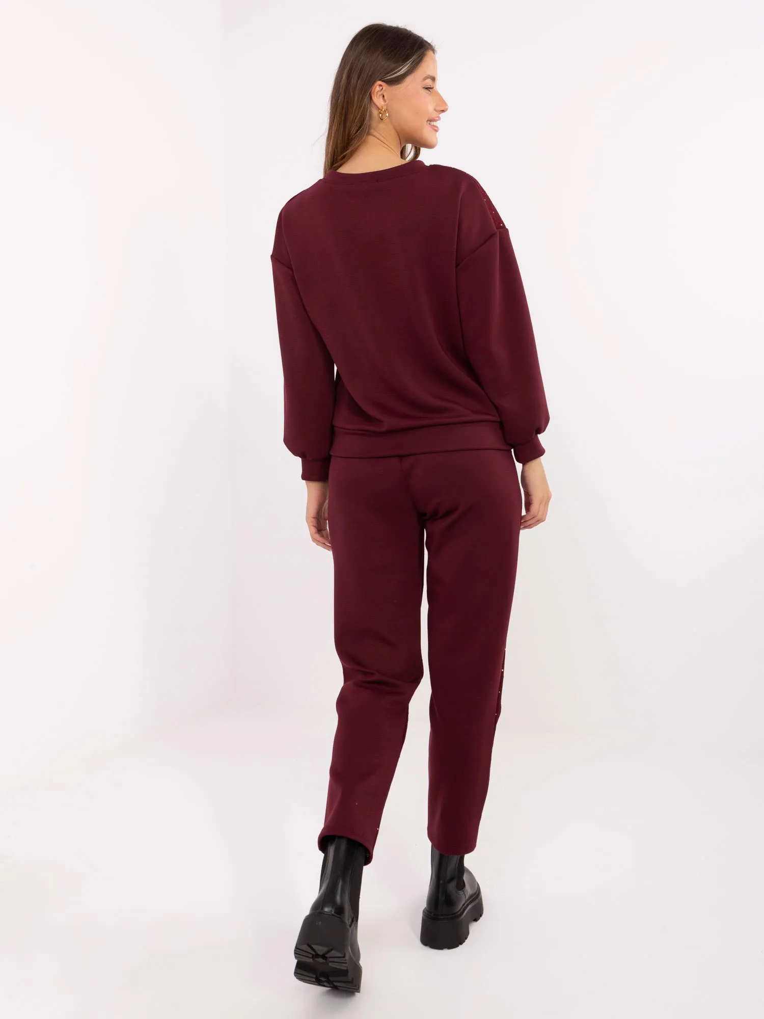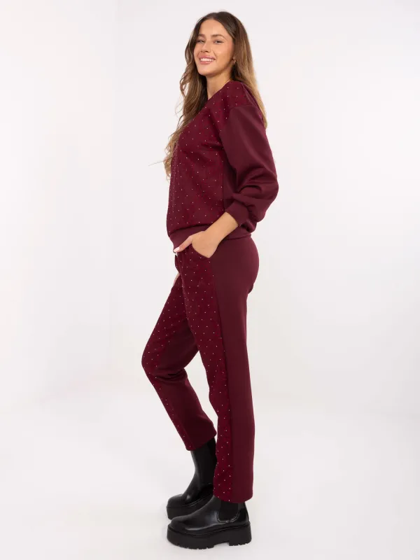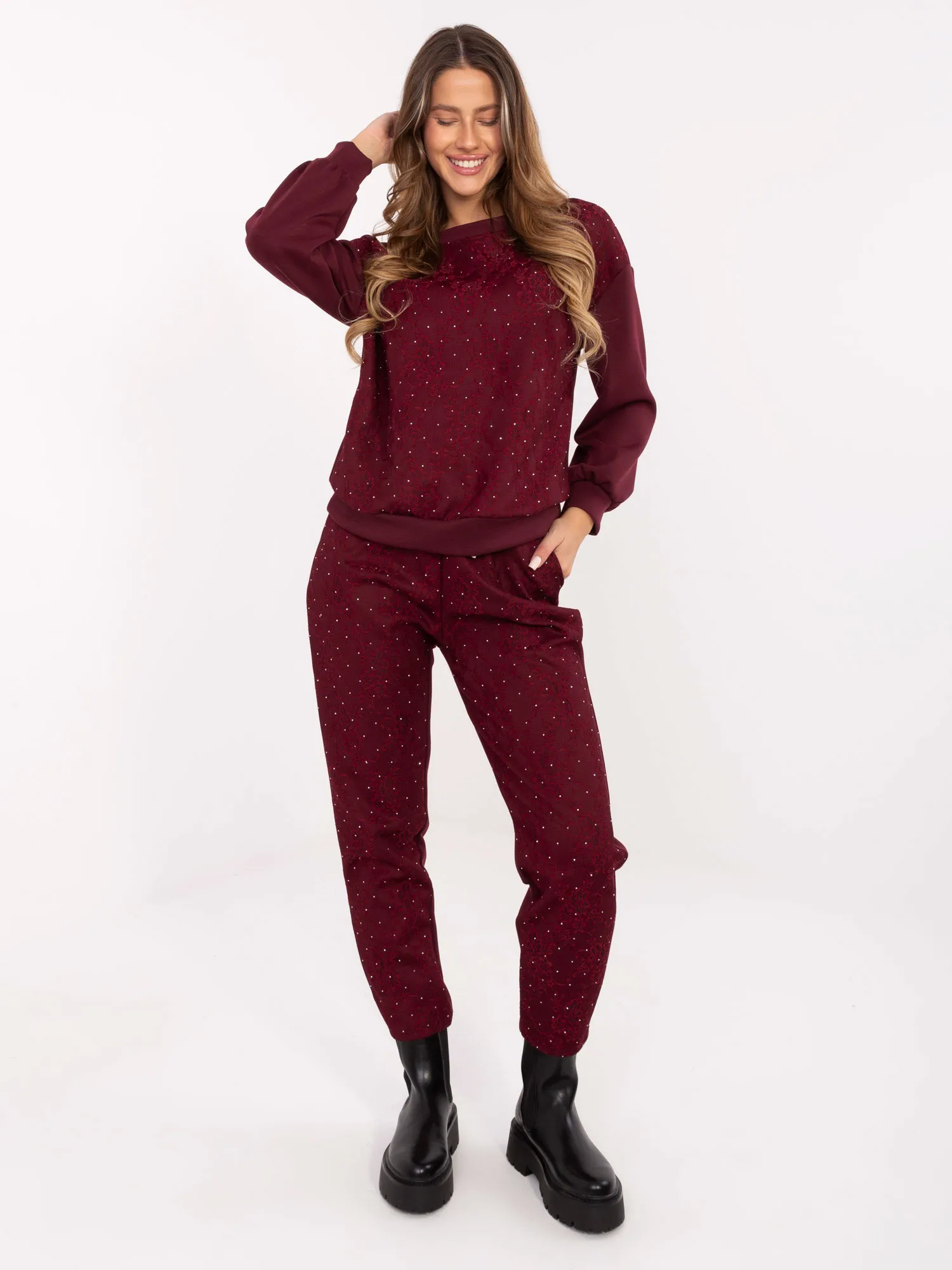 Komplekto matmenys vieno dydžio: plotis po pažastimis - 55 cm, megztinio ilgis - 65 cm, rankovių ilgis - 48 cm (nuo siūlės), klubų plotis - 45 cm, kelnių plotis ties juosmeniu - 37 cm (ištiestų), kelnių plotis ties juosmeniu - 91 cm (po tempimo), klubų plotis - 54 cm, kelnių ilgis - 99 cm.