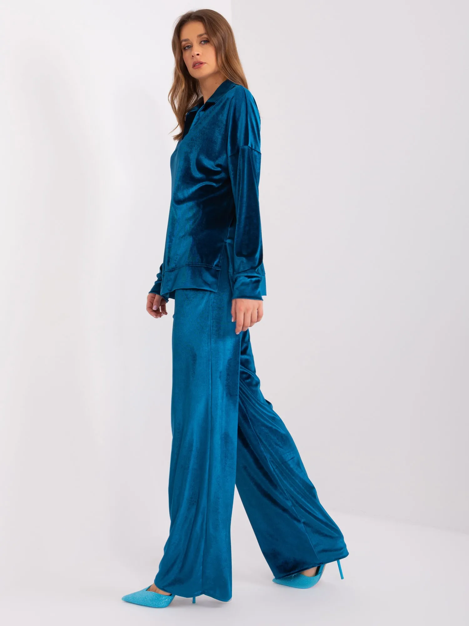 S/M dydžio rinkinio matmenys išmatuoti plokščiai: palaidinės plotis po pažastimis - 60 cm, rankovės ilgis - 65 cm, palaidinės ilgis - 66 cm, kelnių plotis ties juosmeniu - 31 cm, juosmens aukštis - 31 cm, kelnių ilgis - 111 cm.