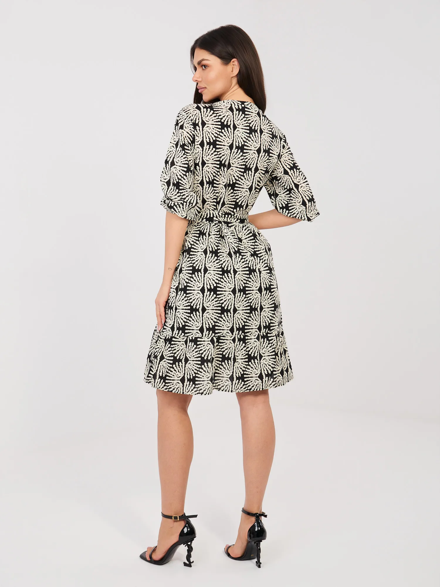 Modelka ma na sobie rozmiar S. Wymiary modelki: wzrost 173 cm, biust 85 cm, talia 62 cm, biodra 95 cm.