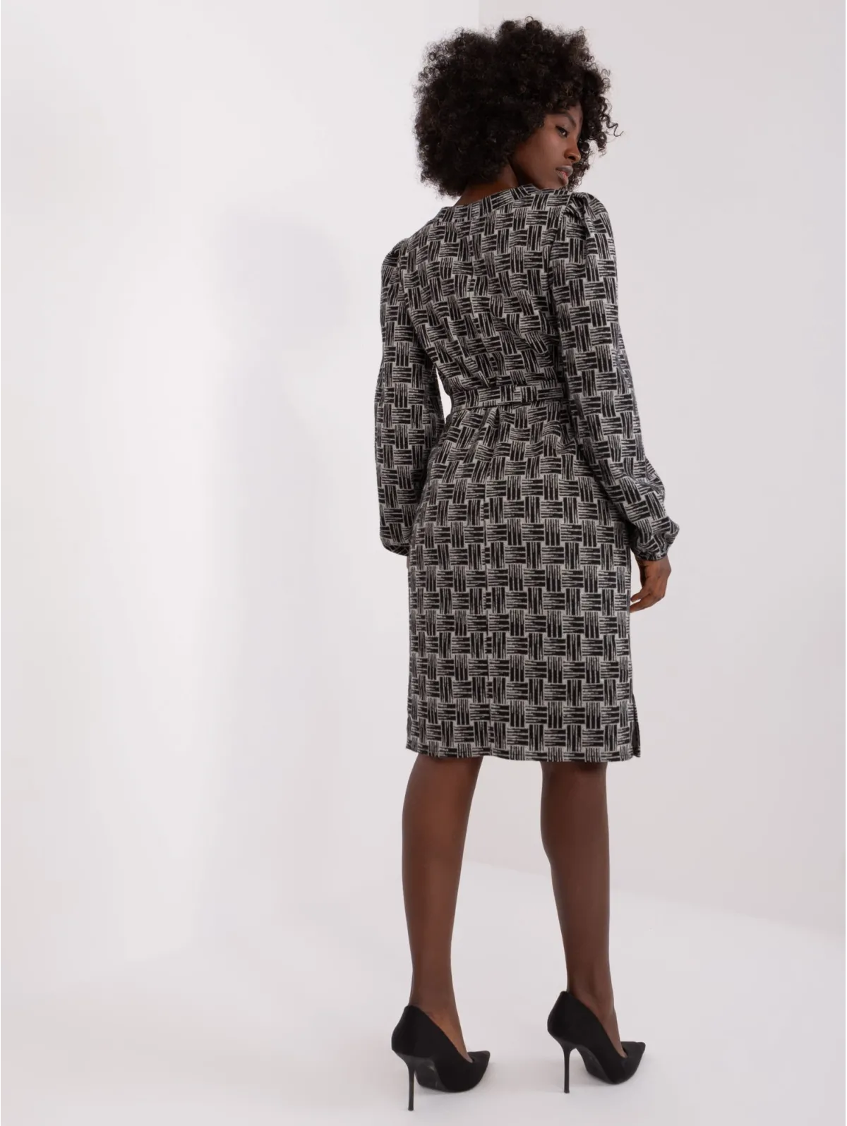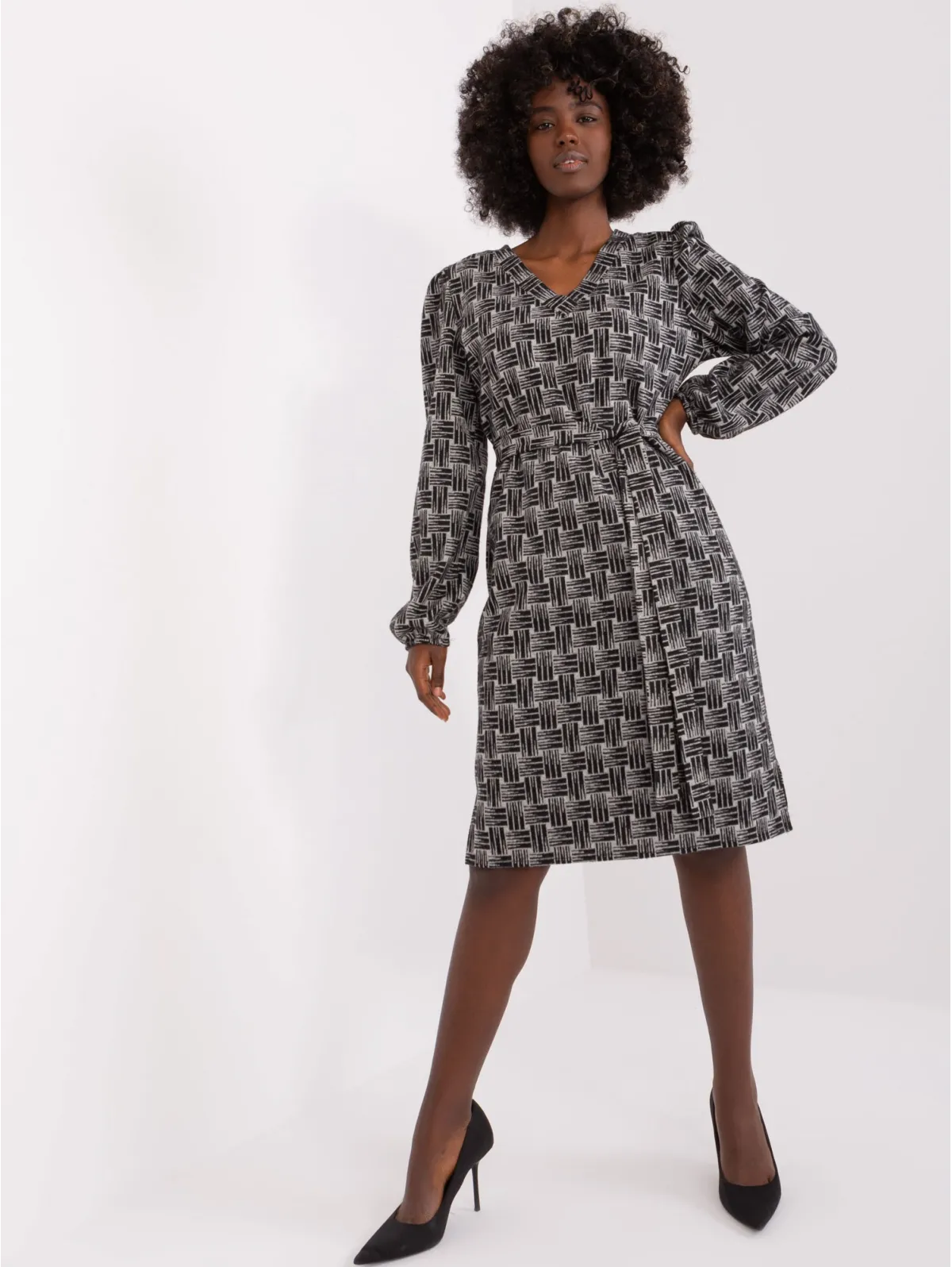 Suknelės matmenys S/M dydžiu matuojant plokščią: pažasties plotis - 47 cm, bendras ilgis - 93 cm, rankovių ilgis - 61 cm