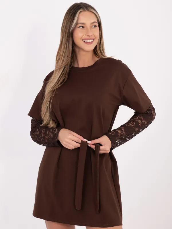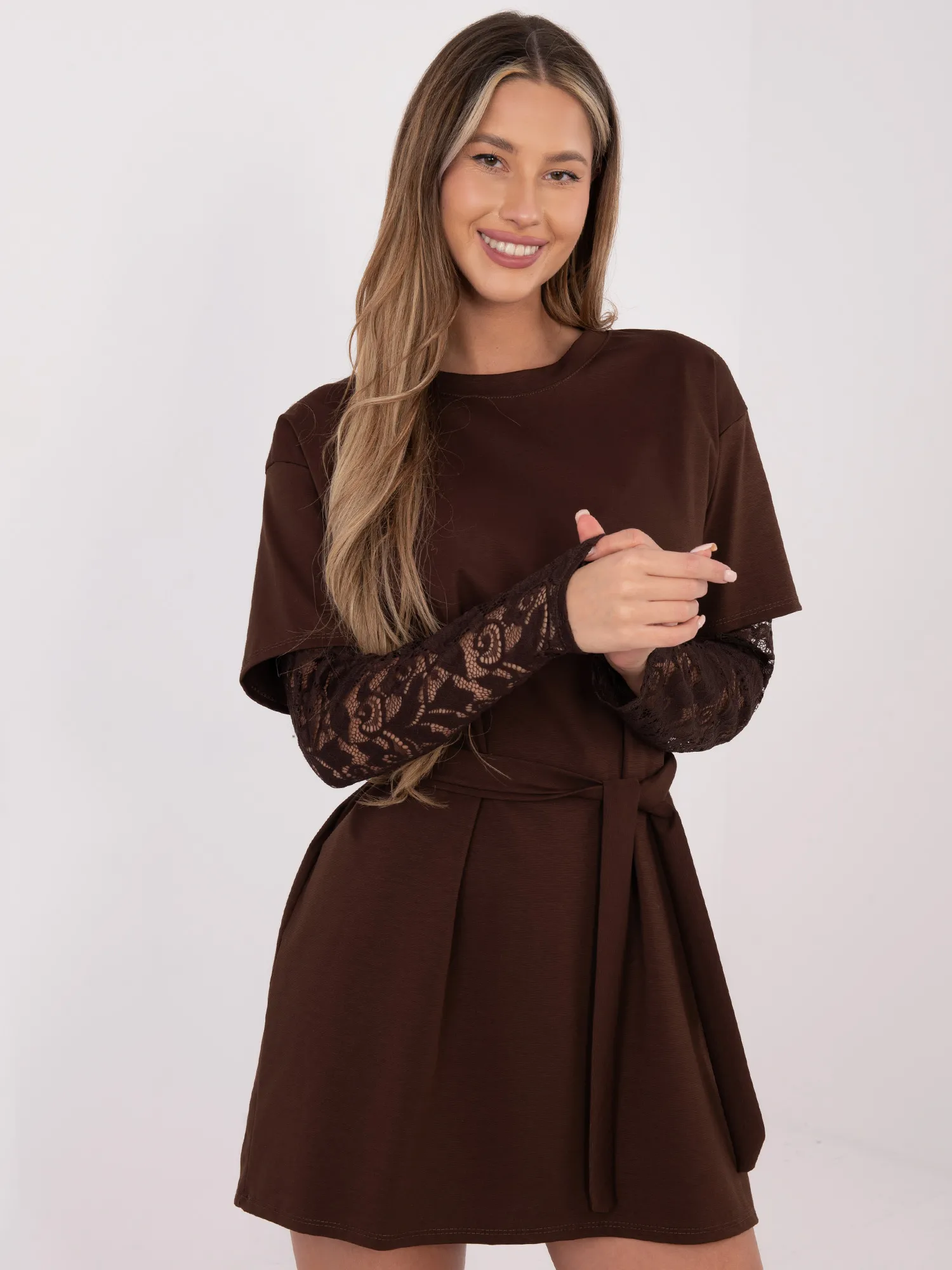 Suknelės matmenys vieno dydžio, matuojant plokščiai: plotis po pažastimis - 56 cm, plotis ties klubais - 59 cm, plotis ties juosmeniu - 57 cm, bendras ilgis - 82 cm, rankovių ilgis - 54 cm (nuo siūlės).