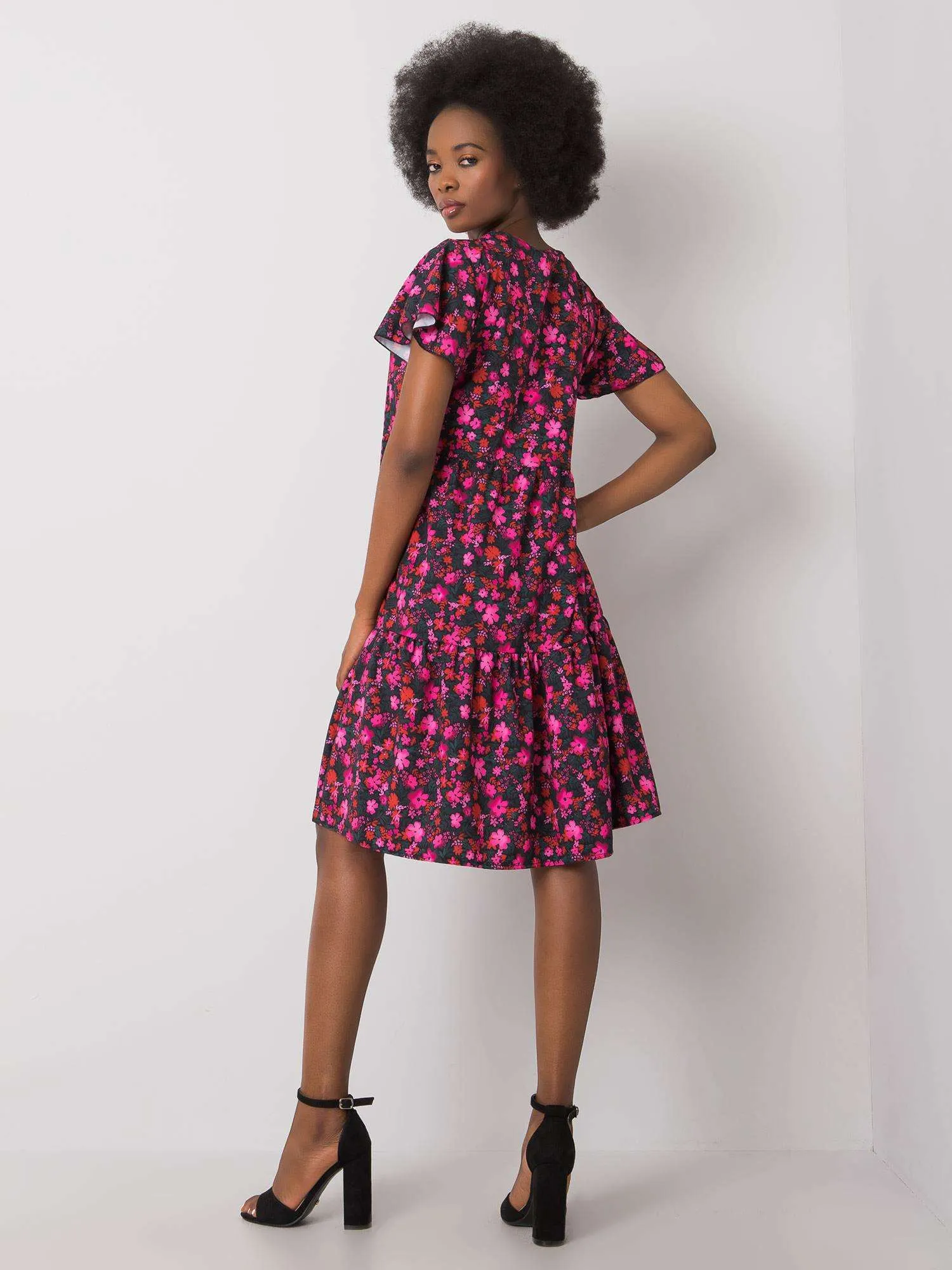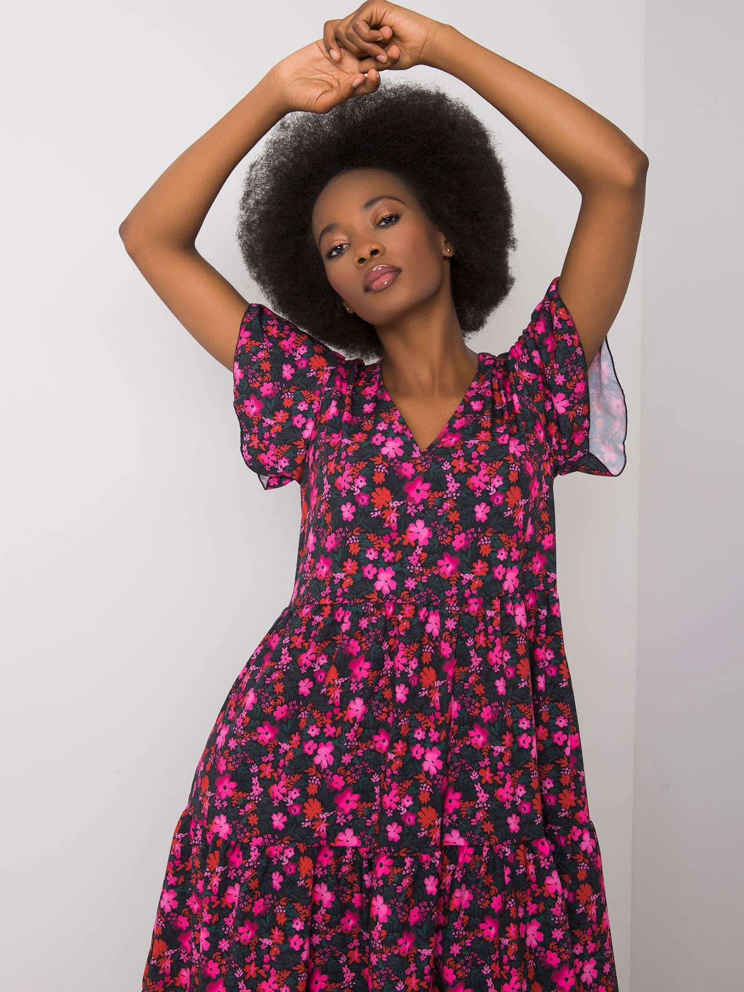 RUE PARIS Różowa sukienka z printami i falbaną.