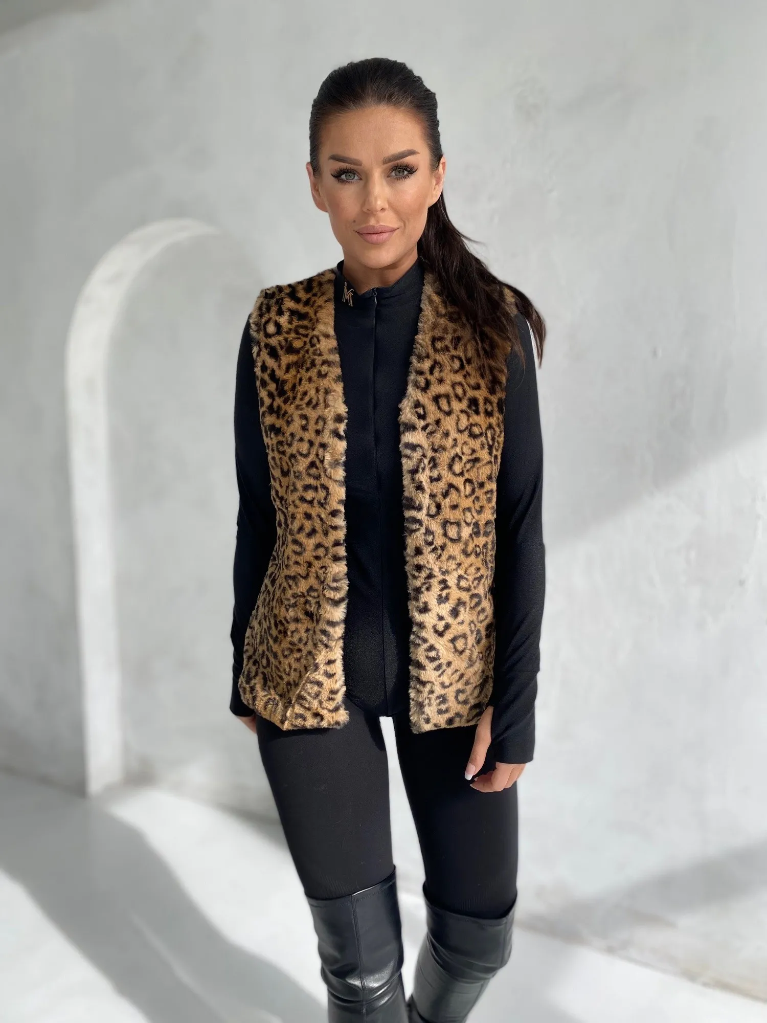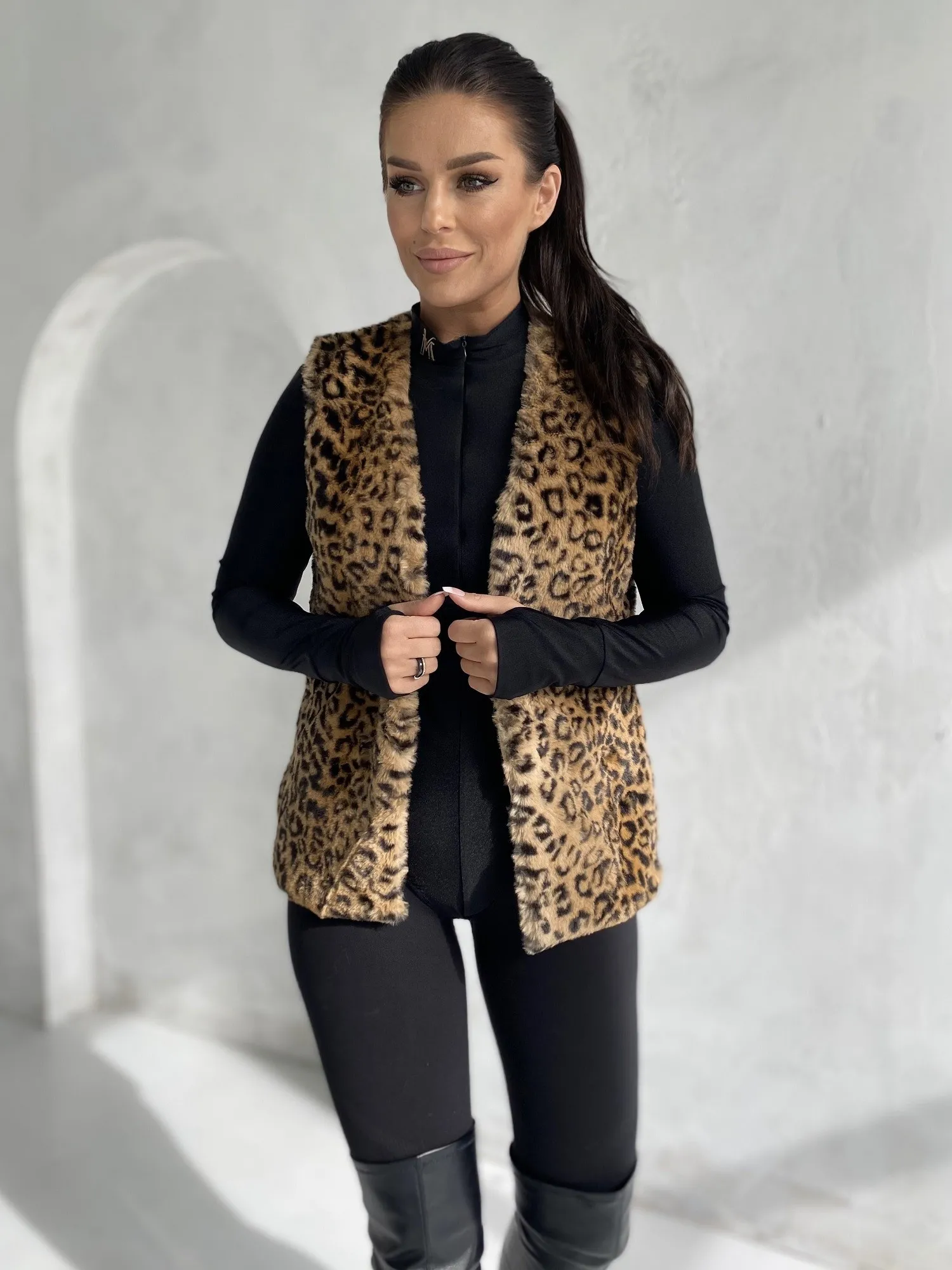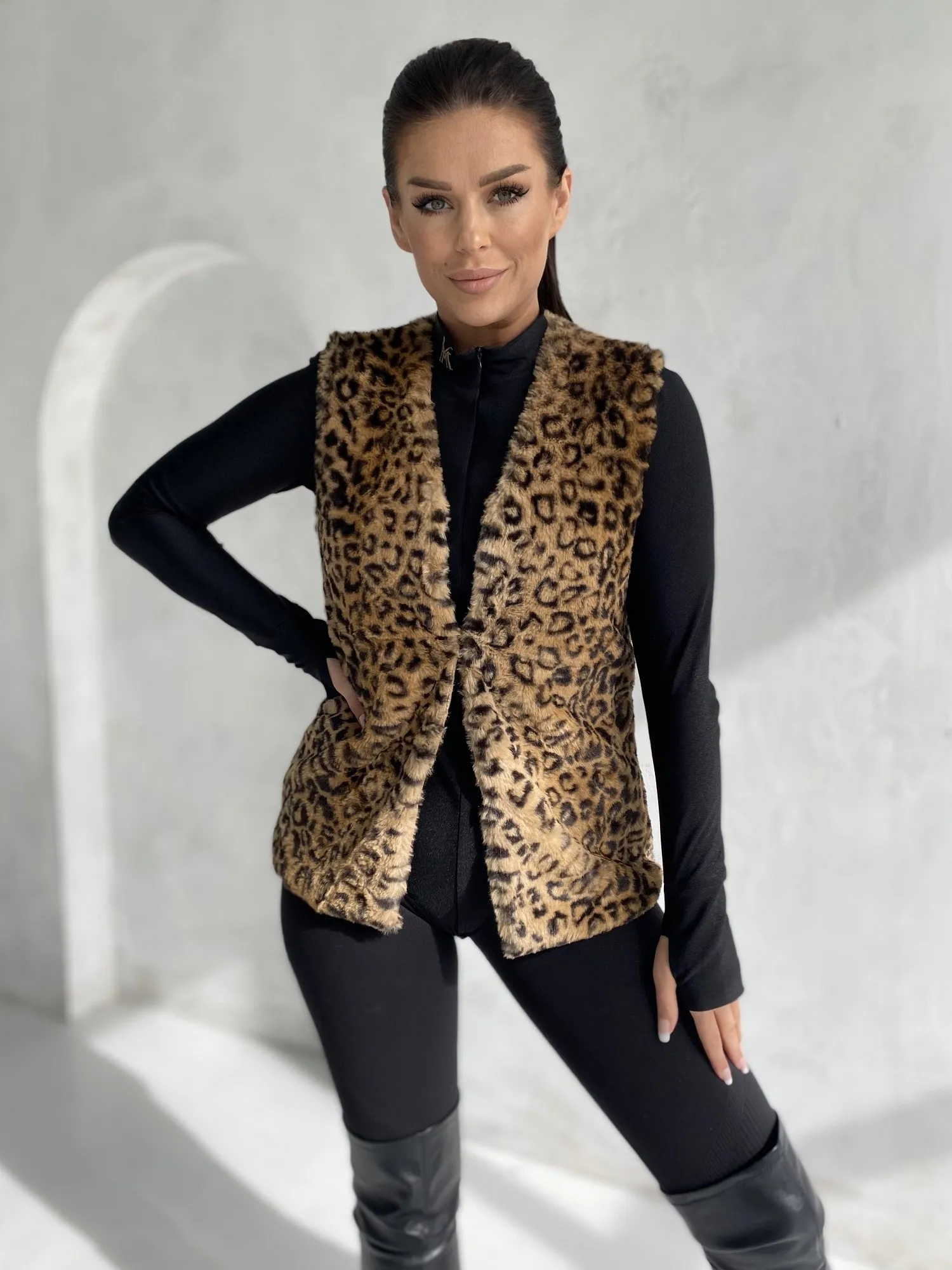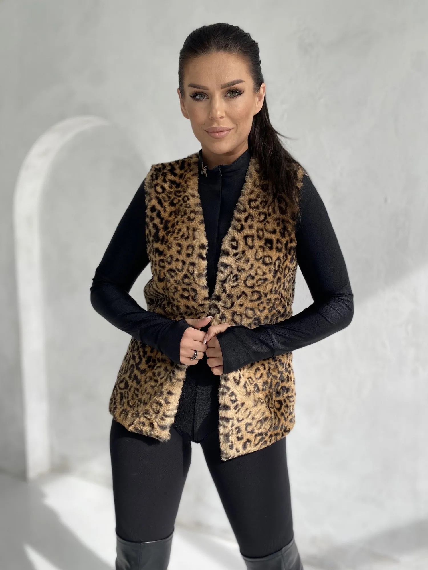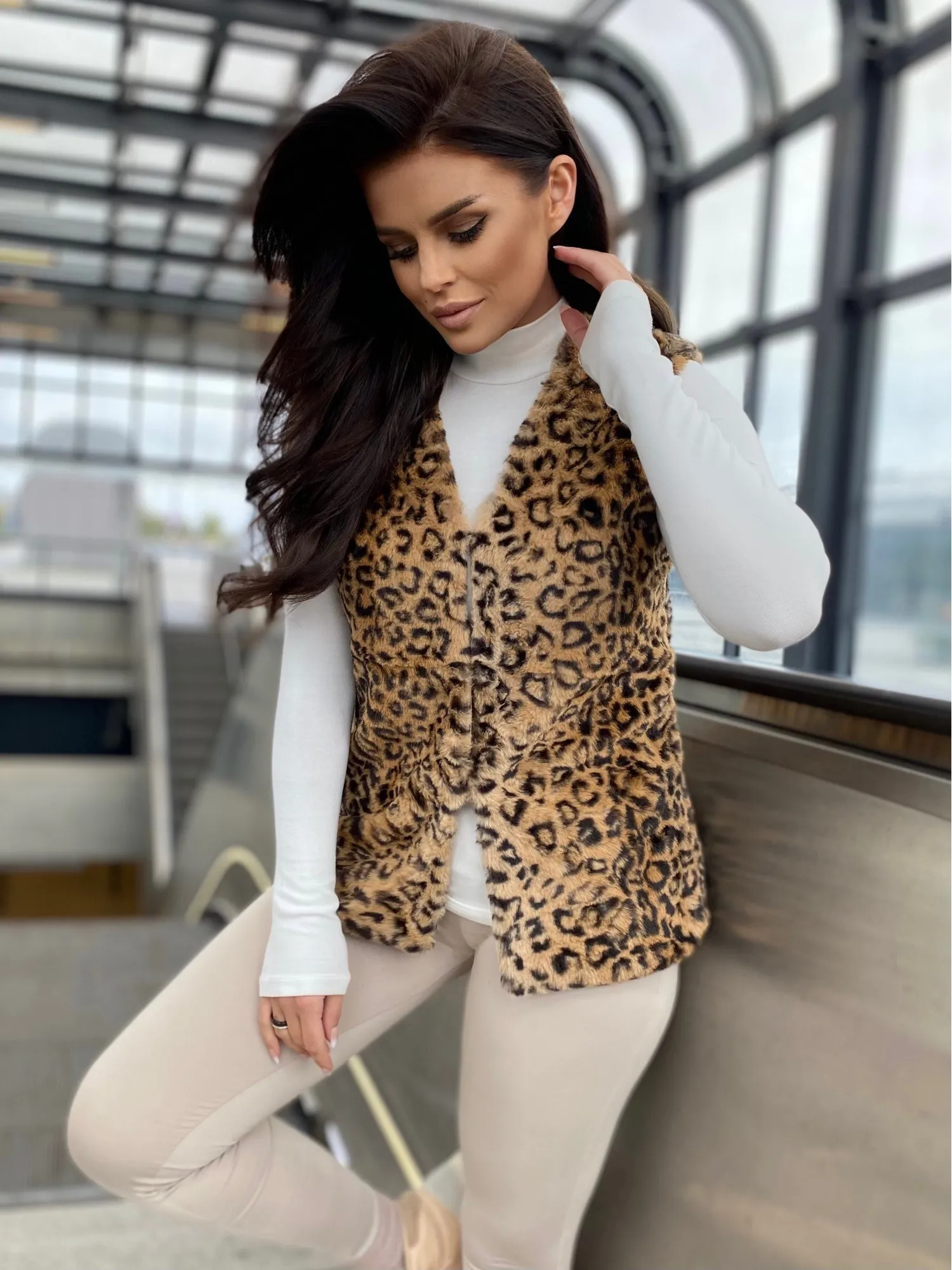 Modelis dėvi S dydį. Modelio išmatavimai: ūgis 172 cm, krūtinės apimtis 89 cm, juosmuo 65 cm, klubai 93 cm.