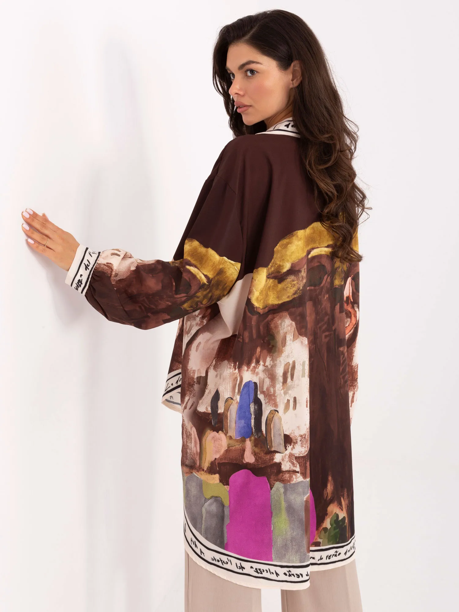 Modelis dėvi vieno dydžio dydį. Modelio išmatavimai: ūgis 173 cm, krūtinė 85 cm, juosmuo 62 cm, klubai 95 cm