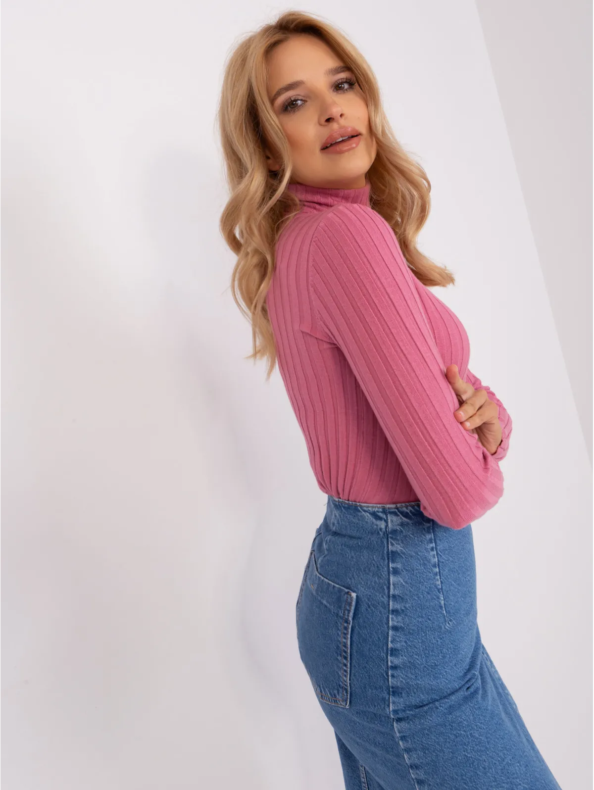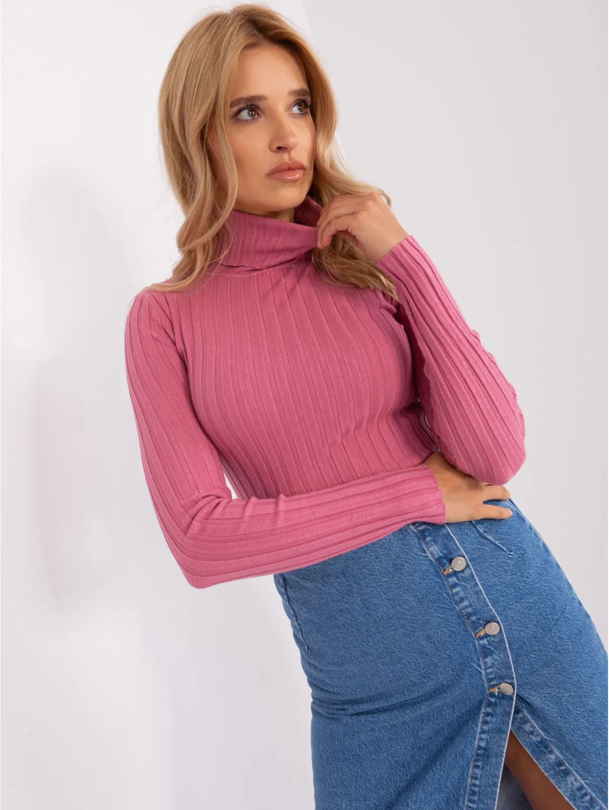 Dulkių rožinės spalvos prigludęs megztinis apykakle .