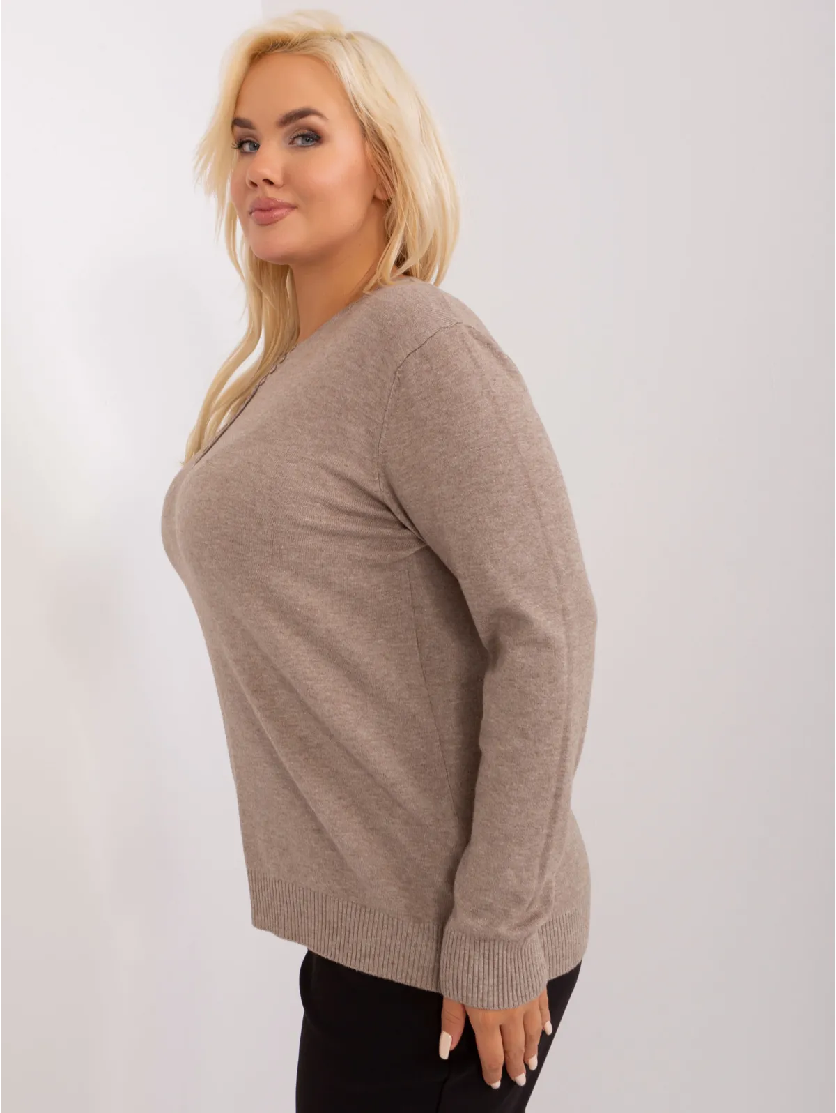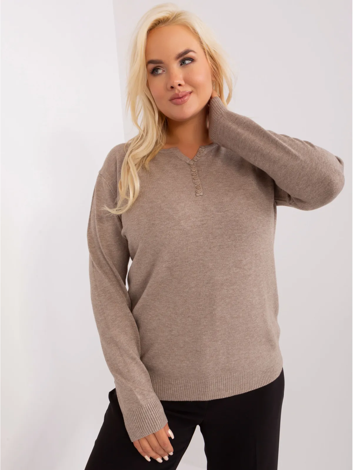 Tamsiai smėlio spalvos plius dydžio megztinis su sagomis .
