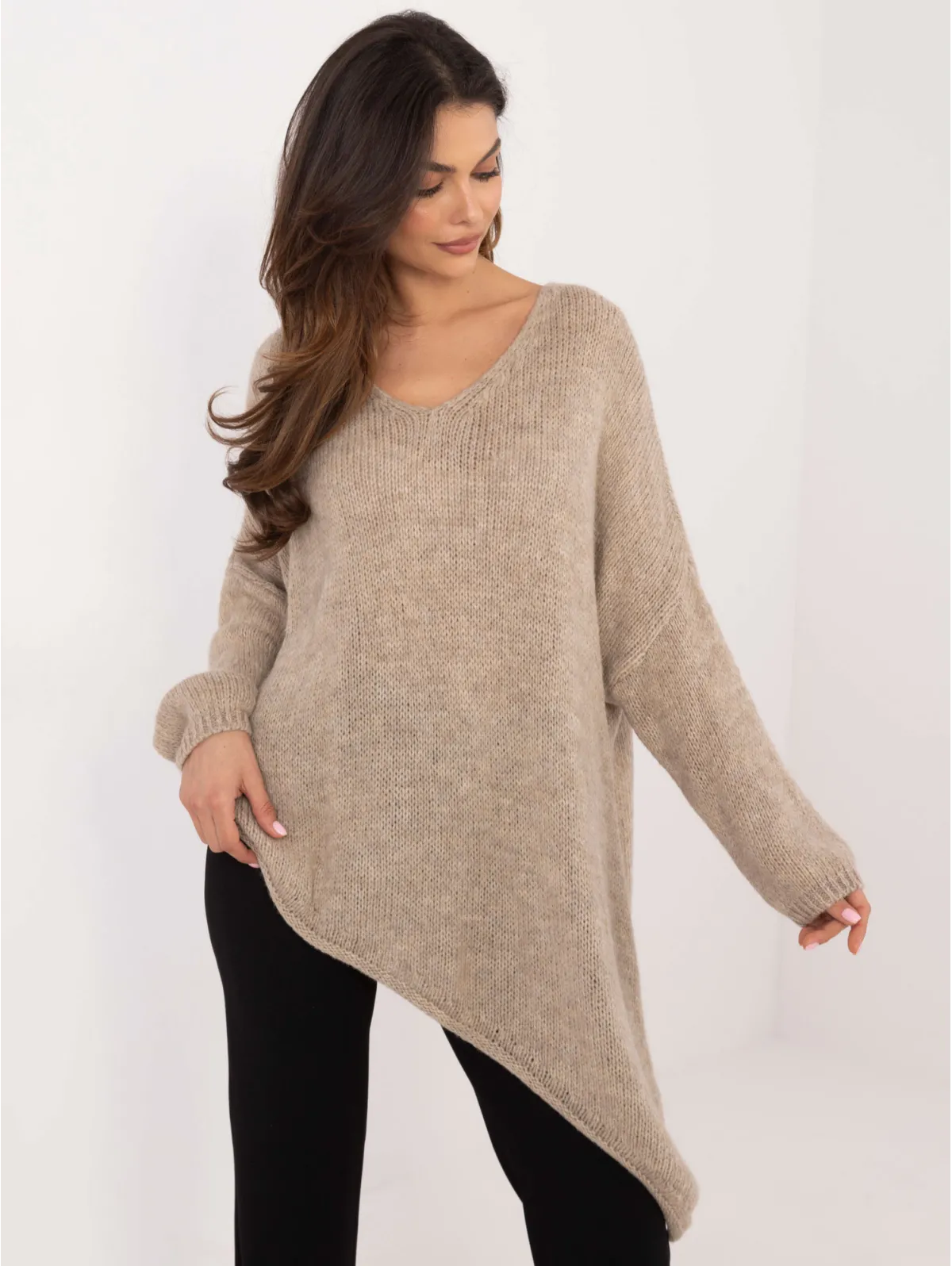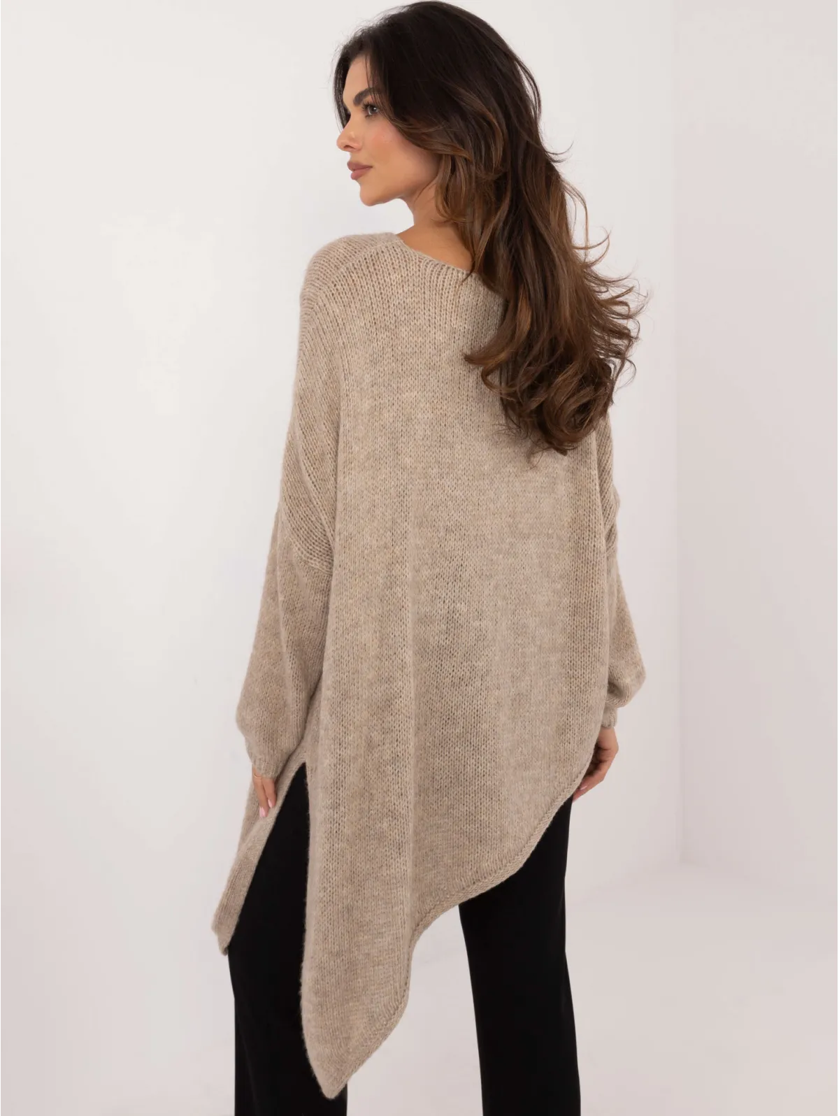 Megztinio matmenys vieno dydžio matuojant plokščiai: pažasties plotis - 80 cm, bendras ilgis - 91 cm (kairėje pusėje), bendras ilgis - 55 cm (dešinėje pusėje), rankovių ilgis - 57 cm.