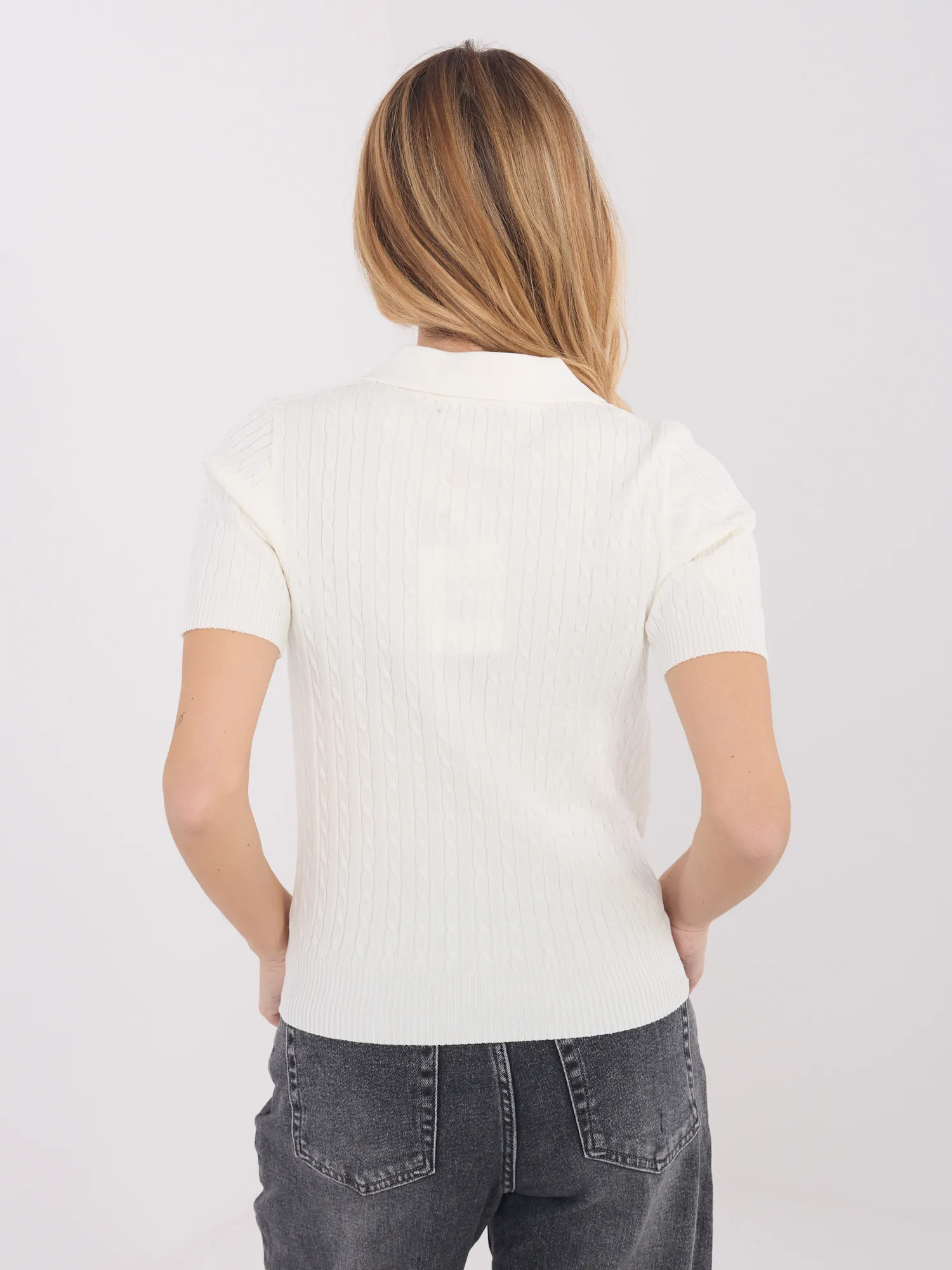 Megztinio vieno dydžio matmenys, išmatuoti plokščiai: plotis po pažastimis - 38 cm, plotis ties klubais - 31 cm, rankovių ilgis - 22 cm (nuo siūlės), bendras ilgis - 56 cm (tampri medžiaga).