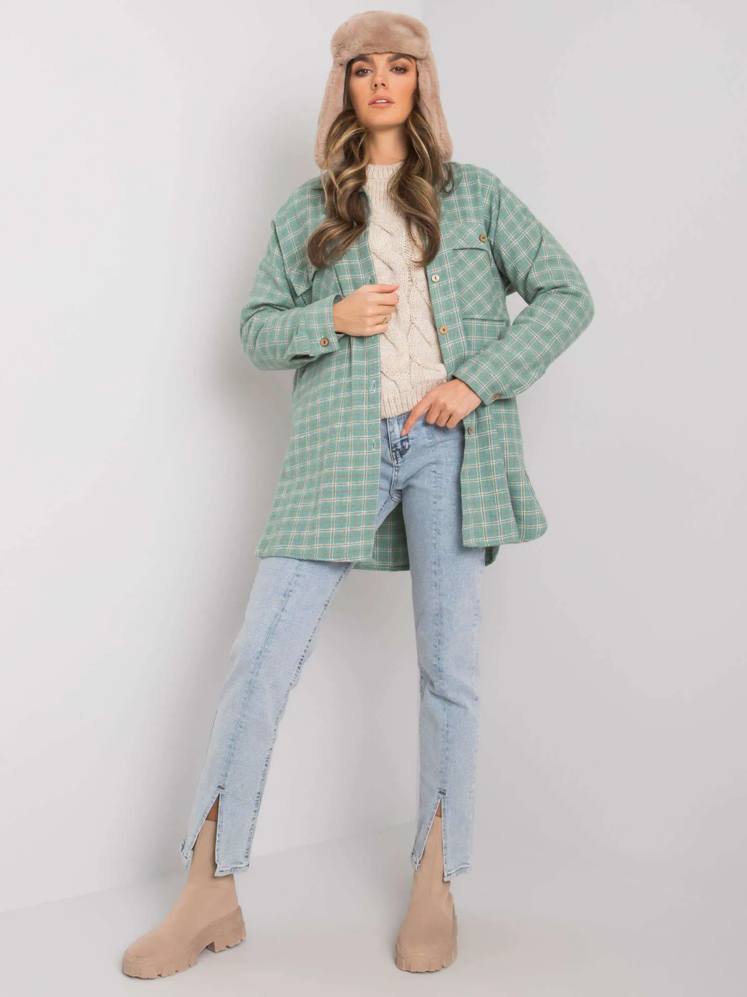 Modelis dėvi 1 dydį Modelio išmatavimai: ūgis 172 cm, krūtinė 103 cm, juosmuo 73 cm, klubai 103 cm.