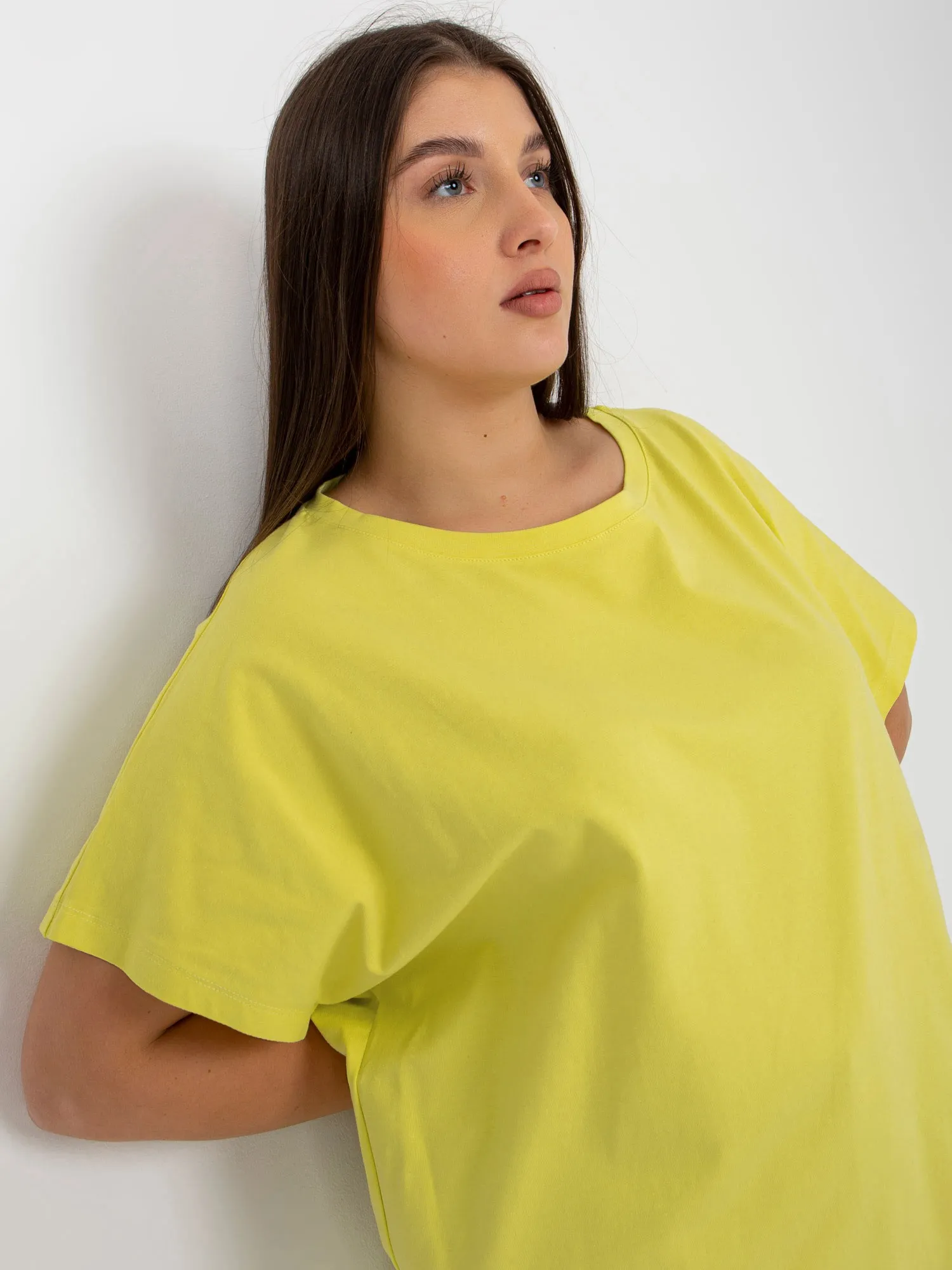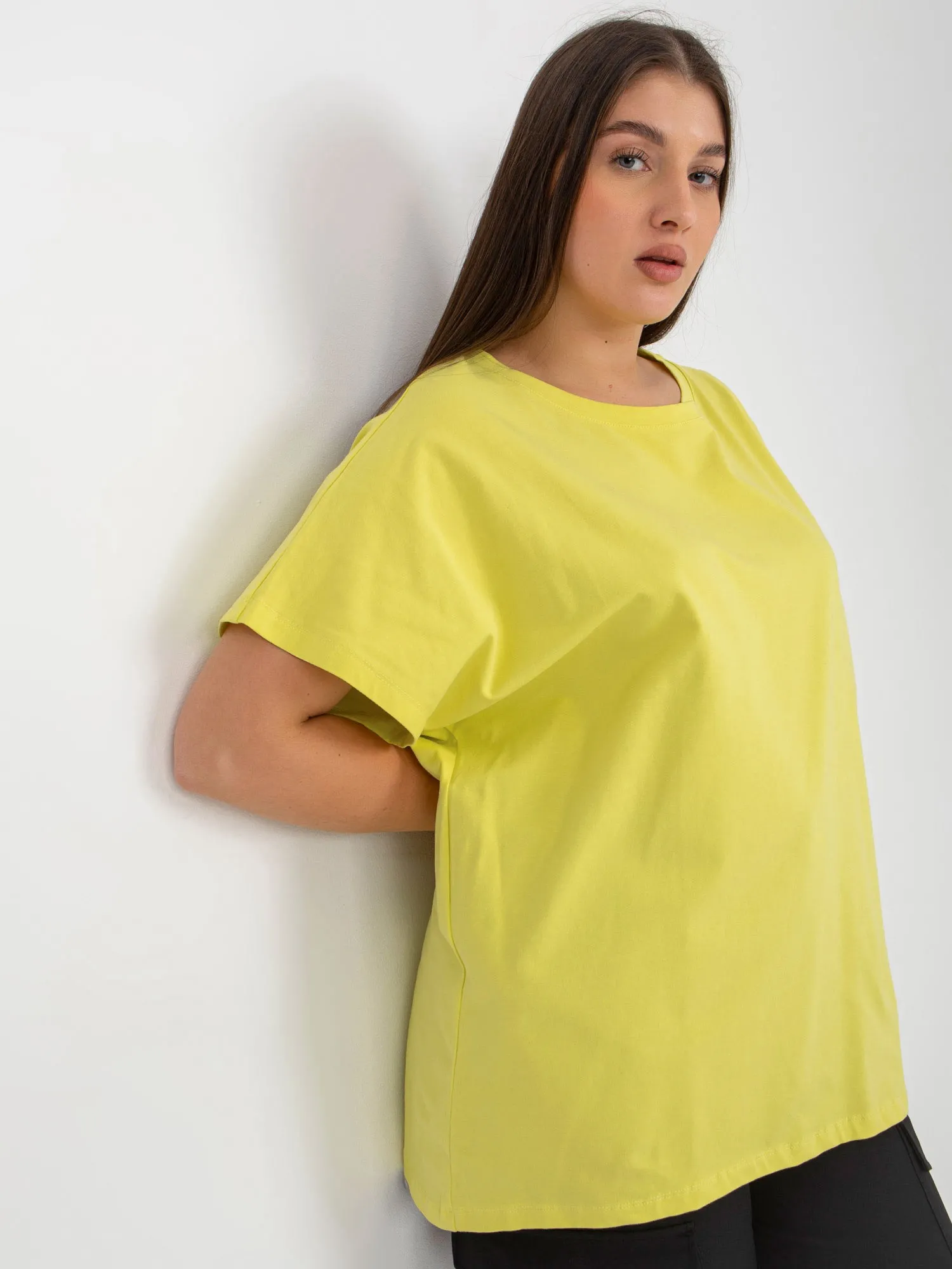 Šviesiai gelsvai žalios spalvos moteriški plius dydžio marškinėliai laisvo kirpimo .