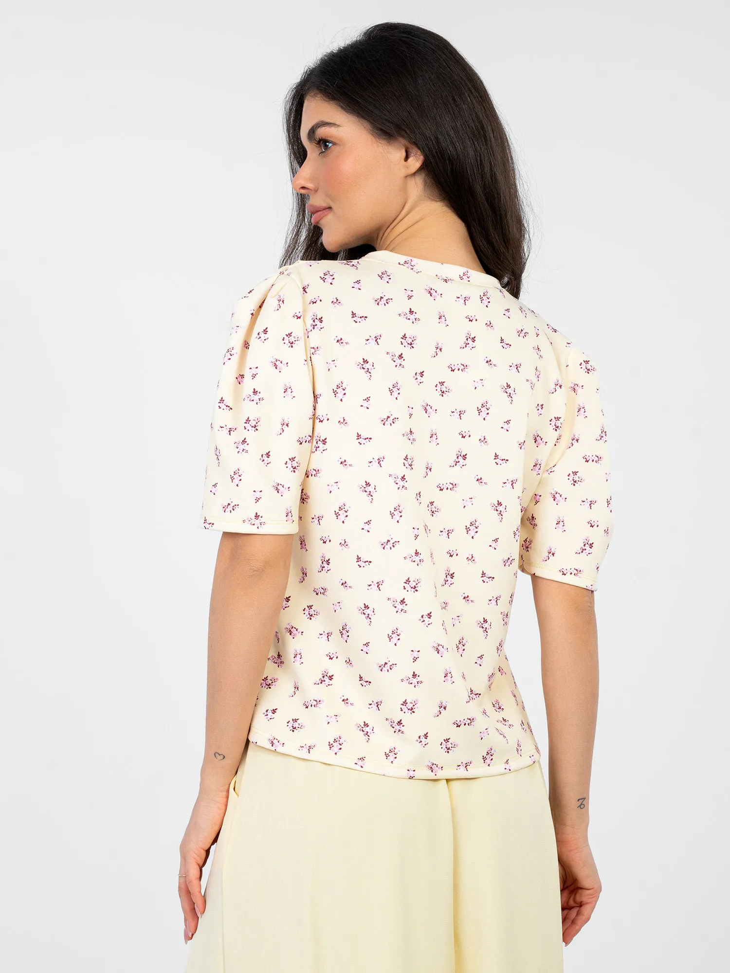 Modelis dėvi pirmąjį dydį. Modelio išmatavimai: ūgis 173 cm, krūtinės apimtis 85 cm, juosmuo 62 cm, klubai 95 cm.