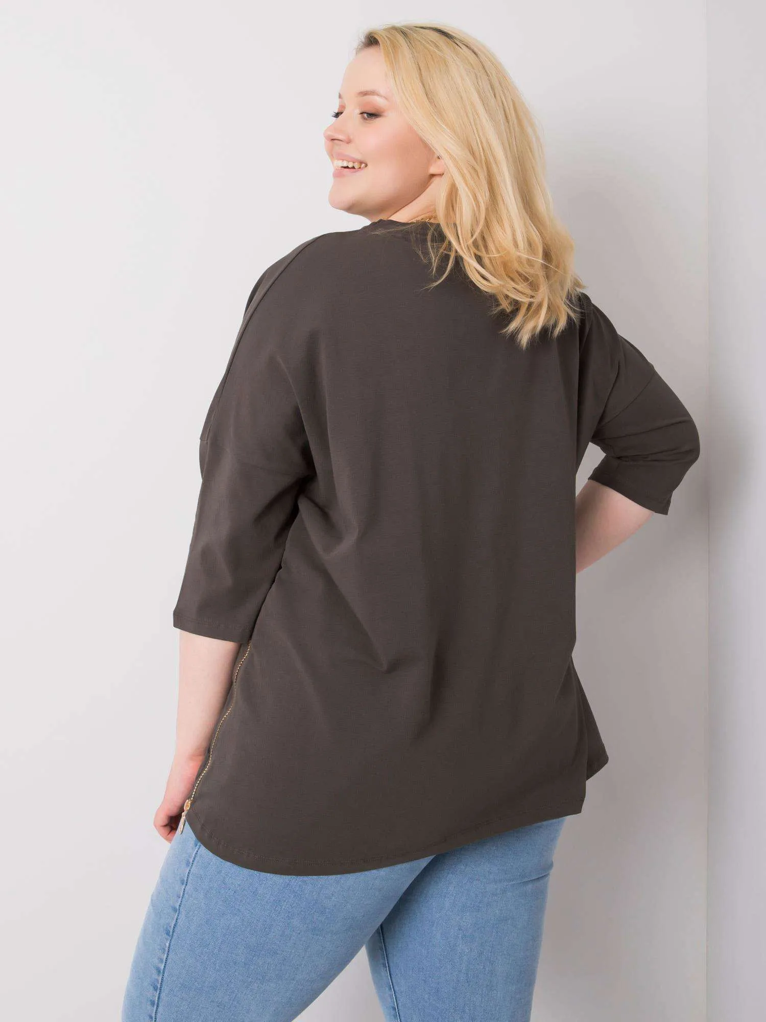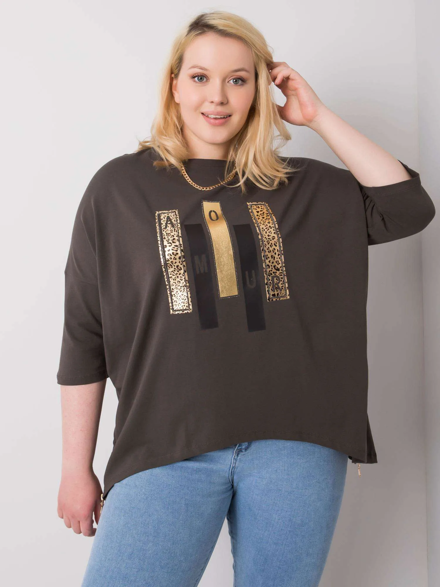 Ciemna khaki bluzka damska z nadrukiem.