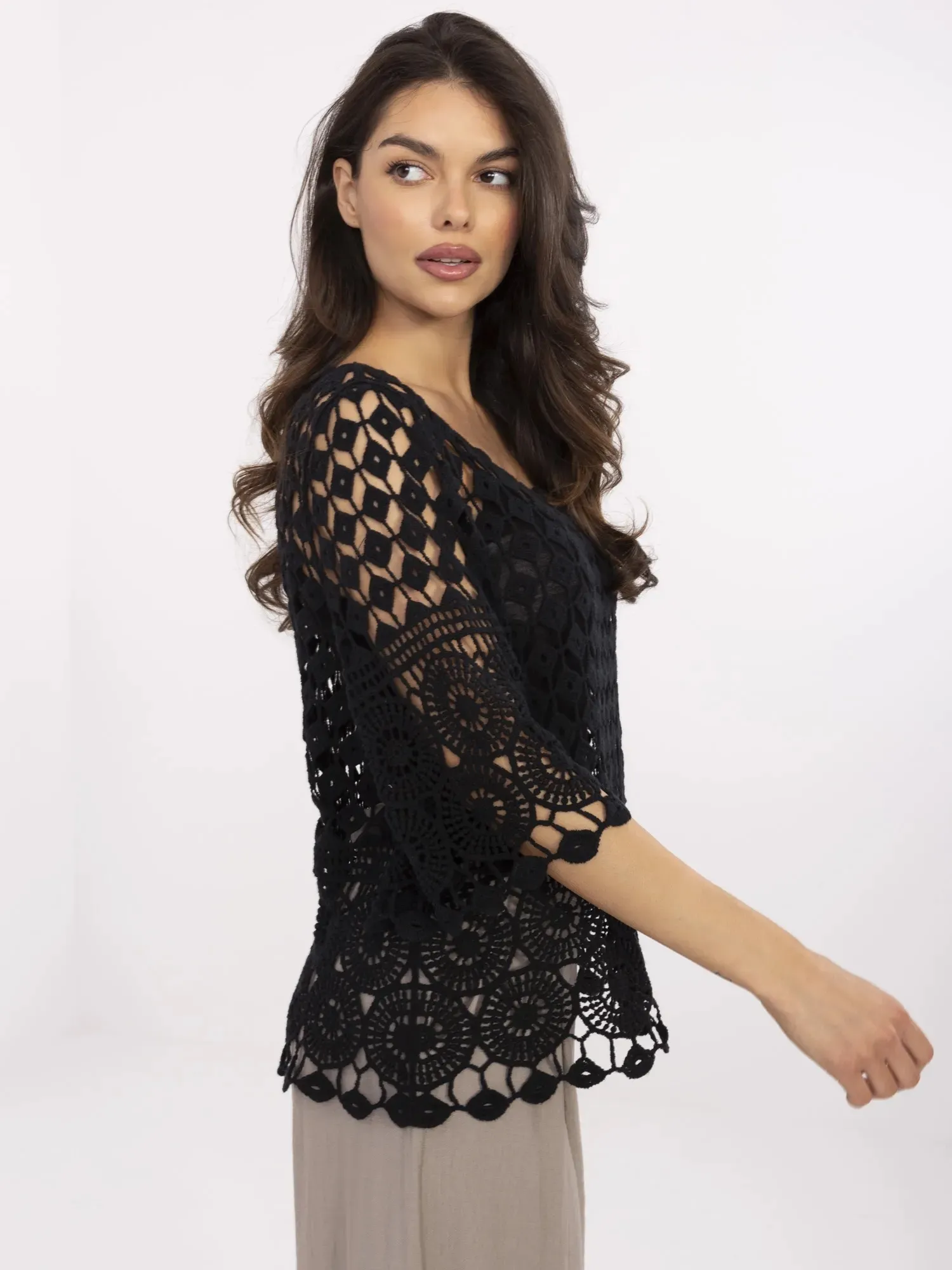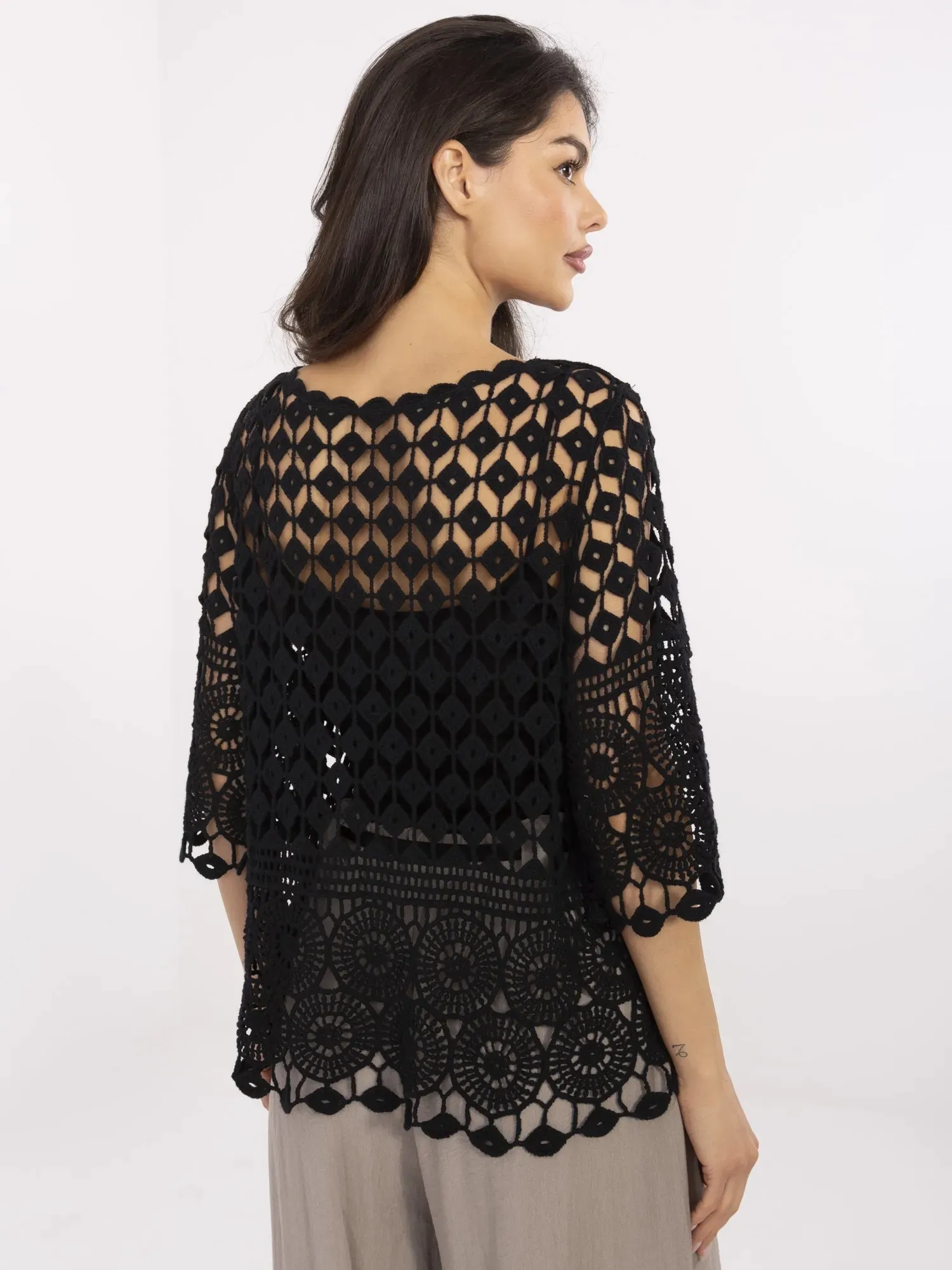 Wymiary bluzki w rozmiarze one size mierzone na płasko: szerokość pod pachami - 57 cm długość rękawa - 37 cm (od szwu), długość całkowita - 62 cm, szerokość w biodrach - 62 cm.