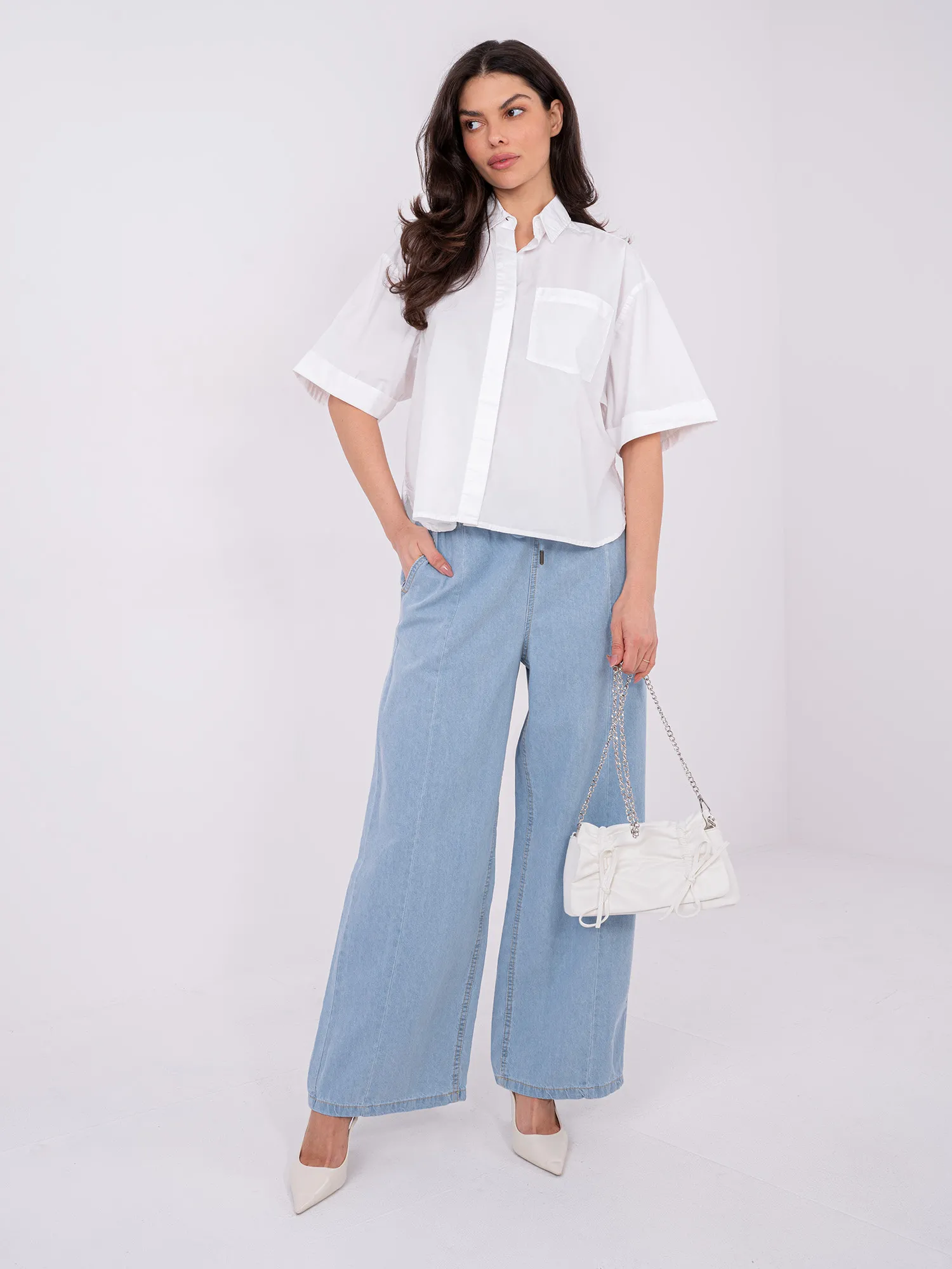 Modelis dėvi S dydį. Modelio išmatavimai: ūgis 173 cm, krūtinės apimtis 85 cm, juosmuo 62 cm, klubai 95 cm .
