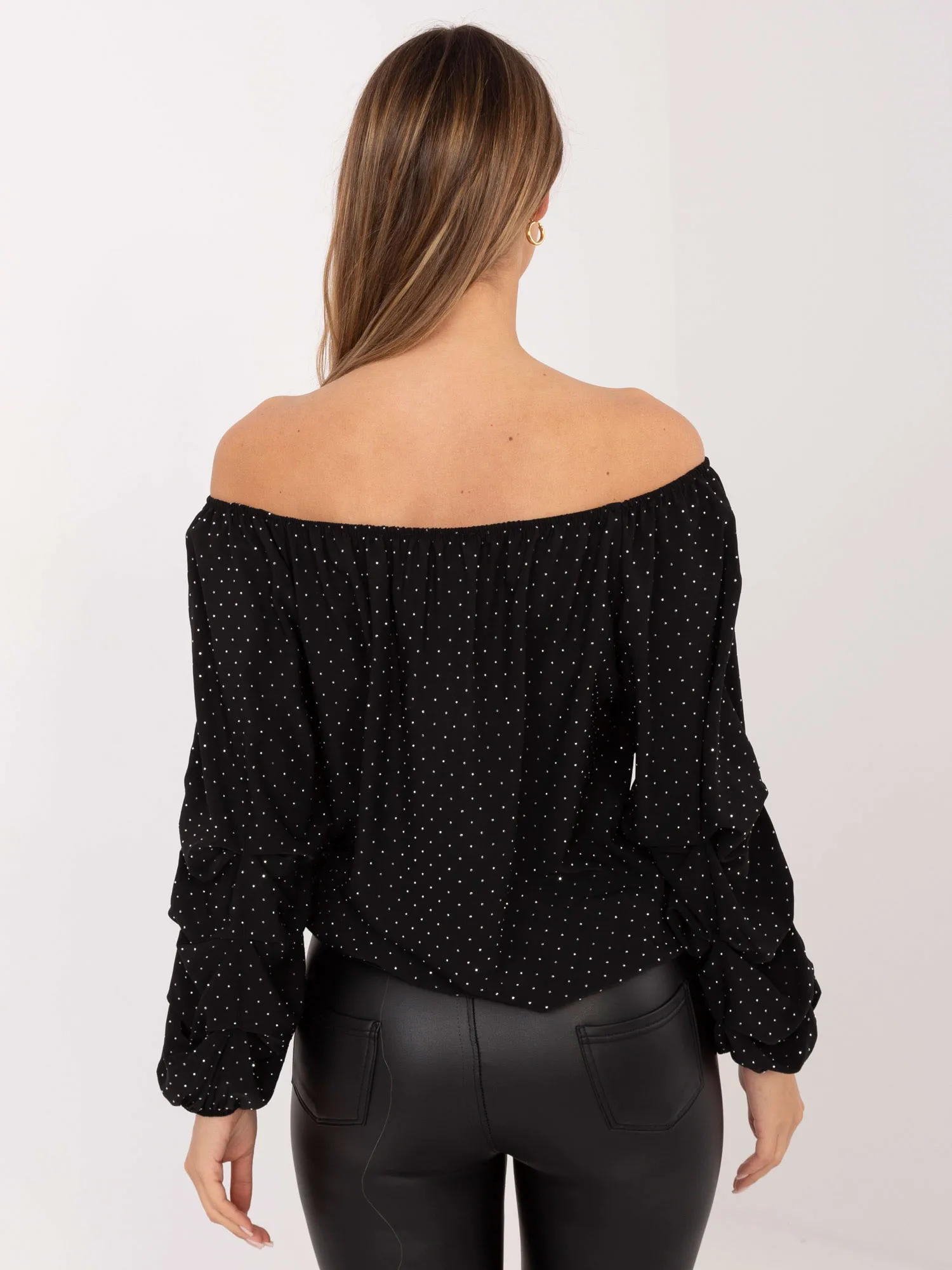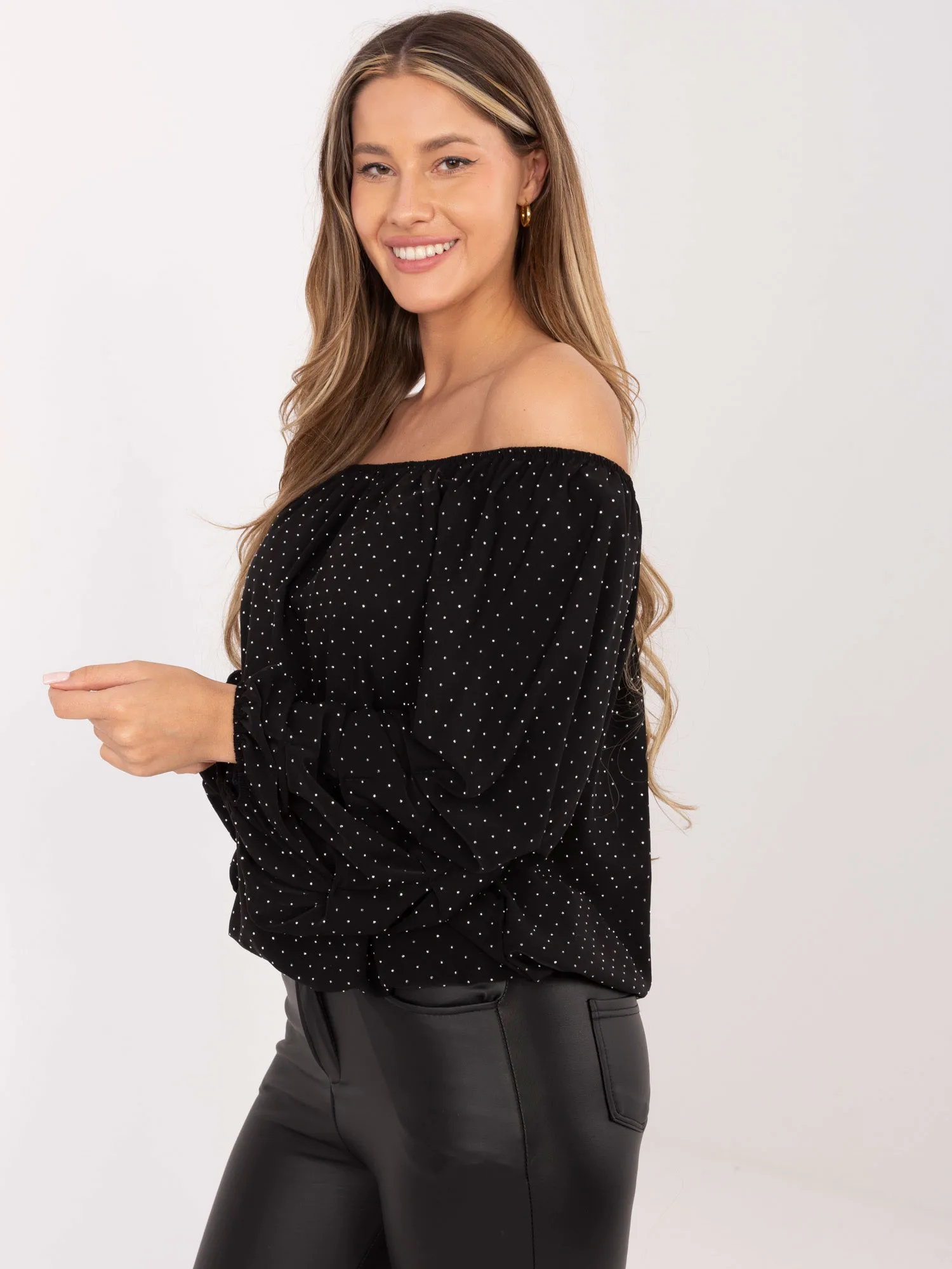 Wymiary bluzki w rozmiarze one size: szerokość pod pachami - 60 cm, długość rękawa - 56 cm (od szwu), szerokość na dole - 45 cm, długość całkowita - 64 cm.