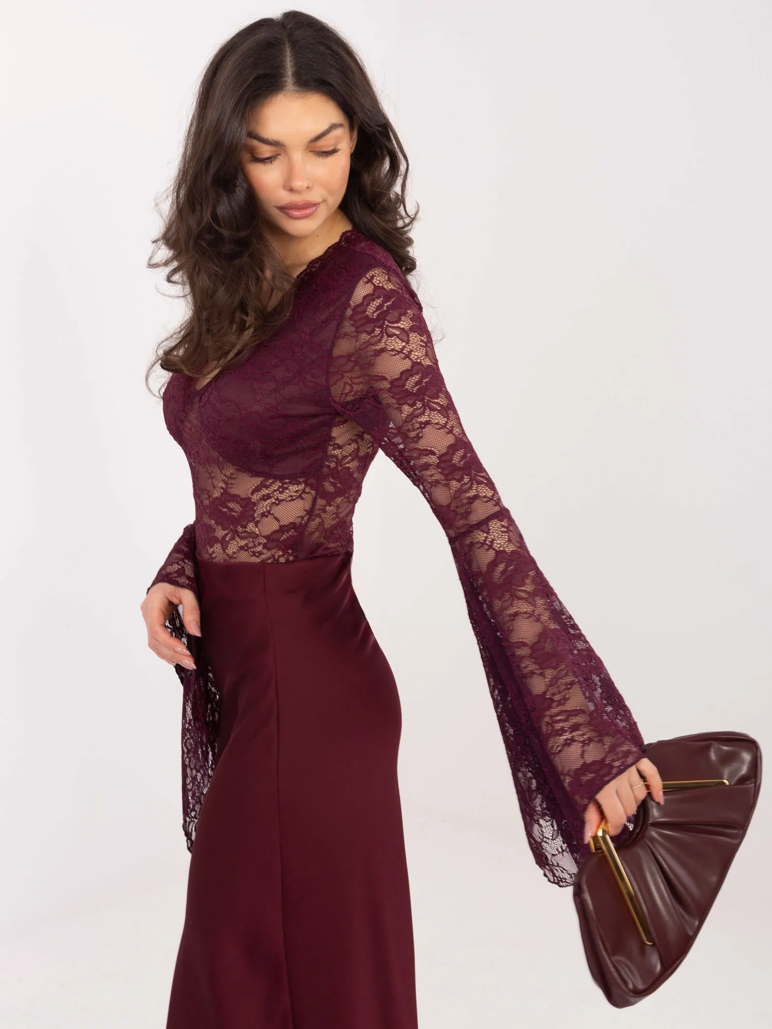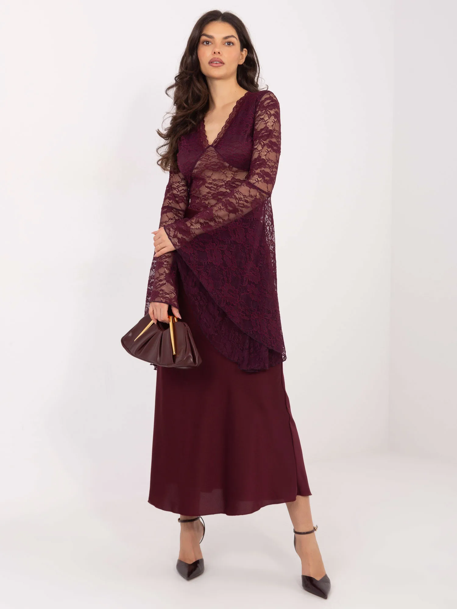 Modelis dėvi pirmąjį dydį. Modelio išmatavimai: ūgis 173 cm, krūtinės apimtis 85 cm, juosmuo 62 cm, klubai 95 cm .