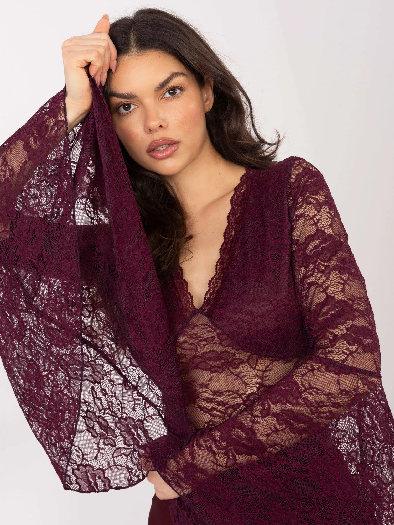 - Modelis dėvi vieno dydžio dydį. Modelio išmatavimai: ūgis 173 cm, krūtinė 85 cm, juosmuo 62 cm, klubai 95 cm