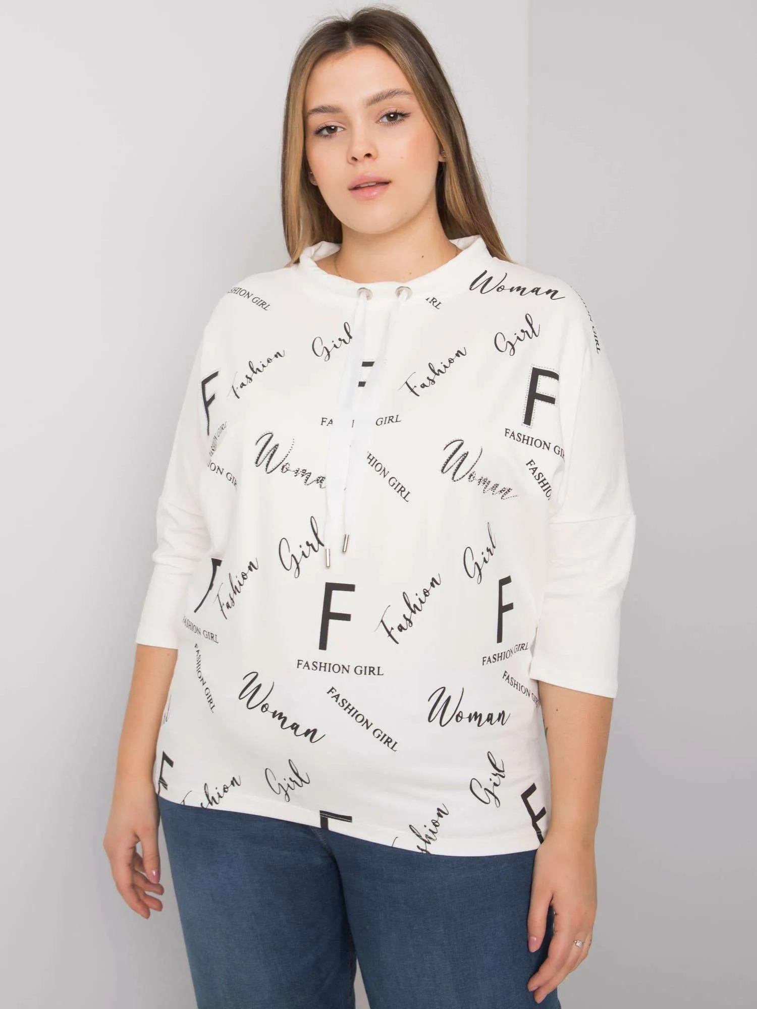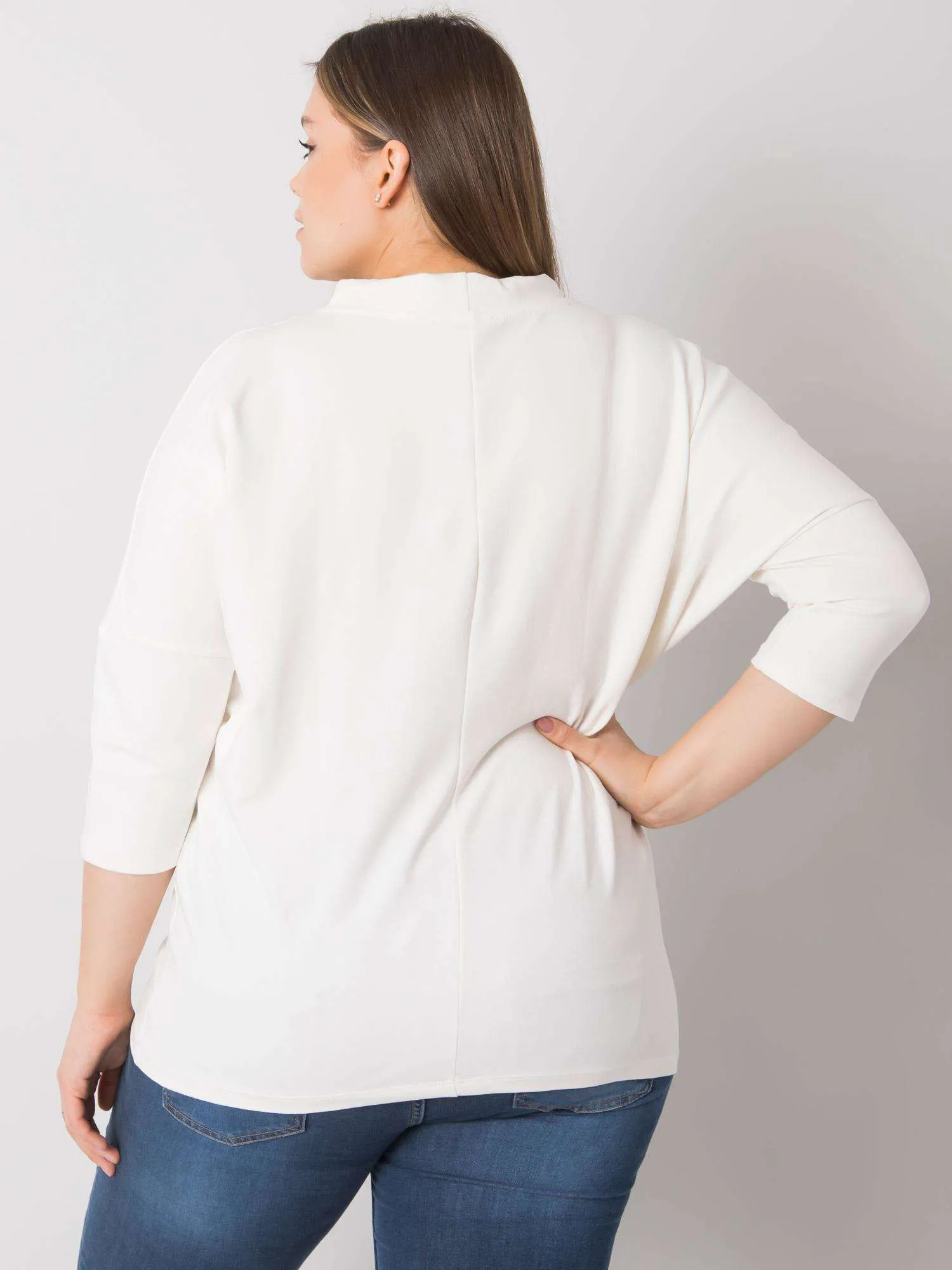 Wymiary bluzki w rozmiarze one size mierzone na płasko: szerokość pod pachami - 74 cm, długość całkowita - 70 cm, długość rękawa - 43 cm.