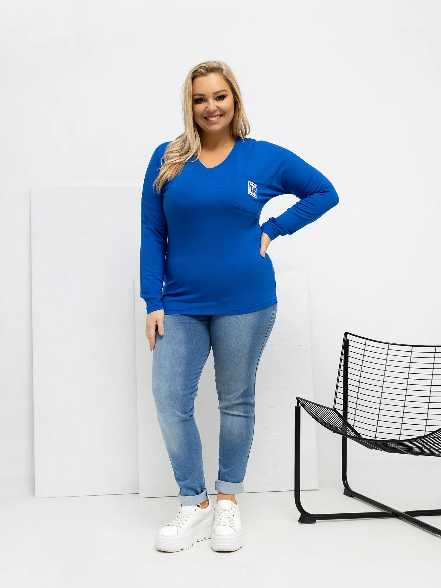 Modelis dėvi vieno dydžio drabužius. Modelio išmatavimai: ūgis 167 cm, krūtinės apimtis 118 cm, juosmuo 90 cm, klubai 118 cm .