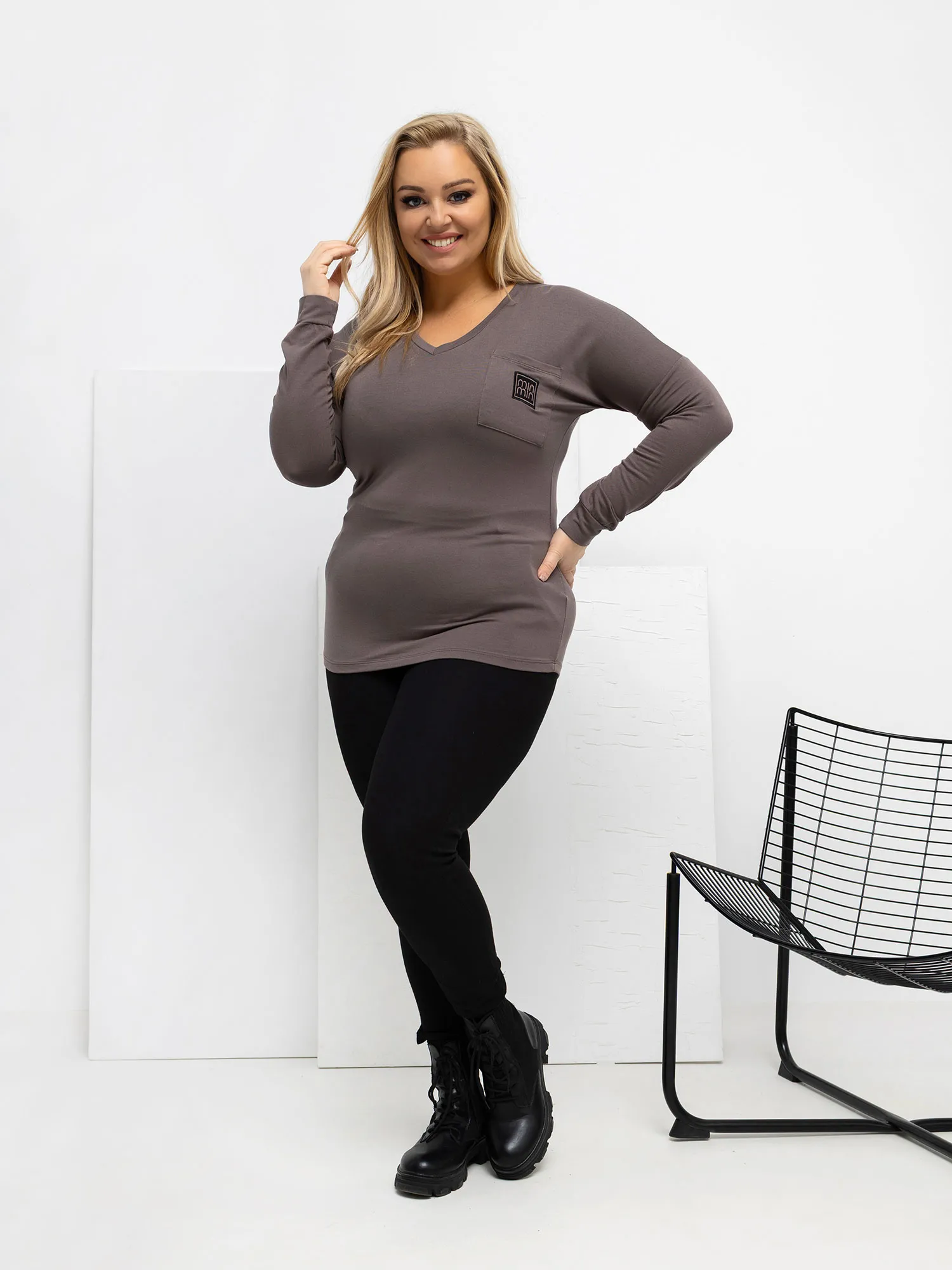 Modelis dėvi vieno dydžio drabužius. Modelio išmatavimai: ūgis 167 cm, krūtinės apimtis 118 cm, juosmuo 90 cm, klubai 118 cm .